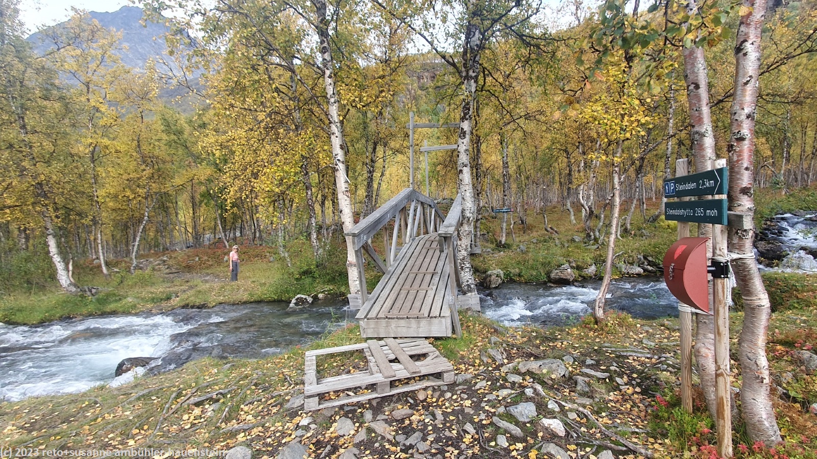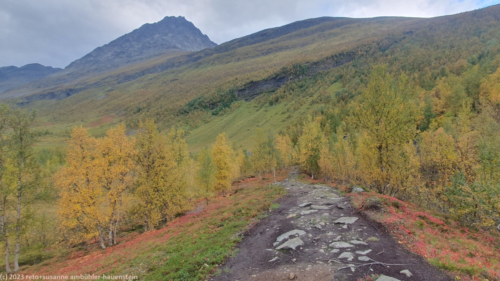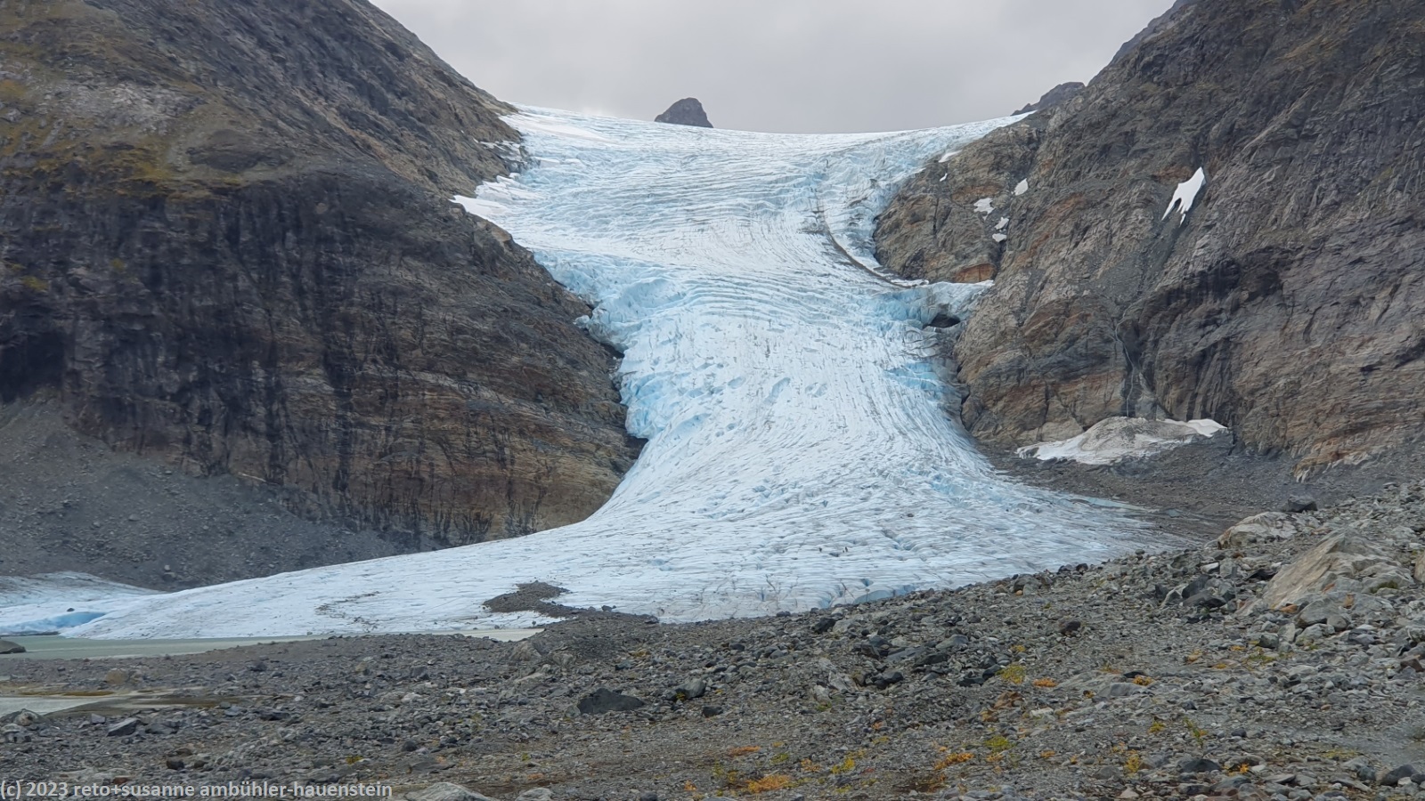 als uns unser handy um 7:30 uhr weckt, regnet es ziemlich heftig. wir haben uns für heute zwei optionen offen gehalten: entweder wir fahren weiter nach levi, oder wir bleiben noch einen tag länger hier und machen eine wanderung zum steindalsbreen. wir vertagen den entscheid bis nach dem frühstück. während wir im jogi essen, wird der himmel etwas freundlicher, man sieht sogar gelegentlich winzig kleine blaue flecken. wir entscheiden uns daher für die wanderung. die reception öffnet erst um 11 uhr, wir nehmen daher auch den tisch und die kabelrolle mit und registrieren uns am abend neu. der ausgangspunkt unserer wanderung liegt auf der anderen seite des storfjorden. luftlinie ist der parkplatz nur 10 km entfernt. wir müssen aber um den fjord herum fahren. dies bedeutet, erst auf der E6 27 km zurück in südwestlicher richtung - den weg, denn wir gestern gekommen sind, dann 17 km auf der strasse 868 in nordöstlicher richtung. kurz vor 11 uhr sind wir beim parkplatz. dieser ist - wie fast alle parkplätze in norwegen, egal wie abgelegen - kostenpflichtig. zum glück kann man überall mit der easypark app bezahlen. diese habe ich schon in kiel installiert und damit konnten wir auf dieser reise jeden gebührenpflichtigen parkplatz bezahlen, egal ob in deutschland, schweden oder norwegen. das ist schon fast genial. wir ziehen unsere wanderschuhe an und machen uns auf den weg. der himmel ist bewölkt, die wolken ziehen rasend schnell. entsprechend geht ein kräftiger wind. wenn ein bisschen sonne durch eines der seltenen löcher in der wolkendecke durchdringt, so ist dieses so schnell vorüber, dass wir kaum ein foto machen können. der weg steigt steil an und ist sehr steinig und holperig. er führt durch einen schönen birkenwald. die blätter der laubbäume sind nun vorwiegend gelb, es ist definitiv herbst geworden. nach knapp 2 km gelangen wir an den ziemlich wilden geailu. uns scheint, dieser führt erstaunlich viel wasser für die jahreszeit. zu unserer rechten hat es einen eindrücklichen wasserfall. nach 55 minuten erreichen wir die steindalshytta. diese ist abgeschlossen, zum übernachten müsste man sich vorher anmelden. über eine kleine brücke setzen wir unsere wanderung fort. bald kommen wir aus dem wald heraus, nun geht es über den breiten talboden. das tal hat die typische U-form, wie von gletscher geformte täler eben sind. vor uns sehen wir die mächtige schlussmoräne des steindalsbreen. der gletscher selbst ist eher klein. schilder markieren, wie weit das eis in früheren jahren gereicht hat. der aufstieg über die endmoräne ist sehr steil. vom gletscher weht ein eisiger wind. wir wandern bis zum see am ende des eises.