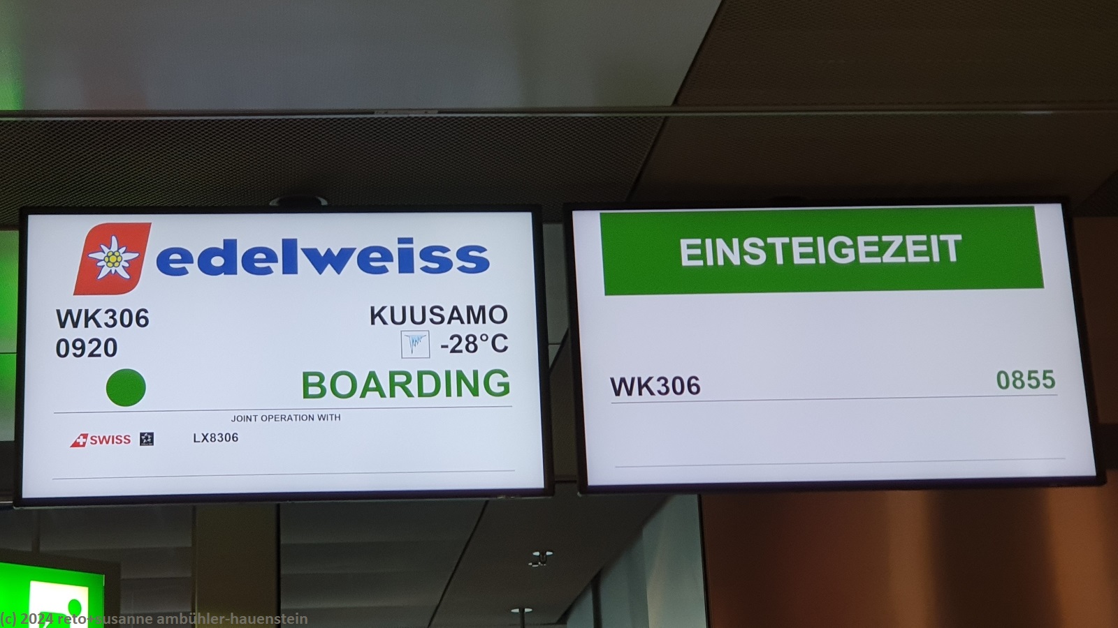 unser wecker weckt uns um 05:55 uhr. unsere koffer und rucksäcke haben wir bereits gestern fertig gepackt. kurz vor 06:30 uhr verlassen wir unser haus. der 06:38 uhr bus bringt uns nach pfäffikon und die S3 nach effretikon. mit der S24 geht es weiter zum flughafen zürich-kloten. um 07:35 uhr sind wir da, zehn minuten später sind wir unsere koffer bereits los, self drop-off ist eine tolle sache. im airport kaffee geniessen wir ein kleines frühstück, dann machen wir uns auf den weg zum gate. bei der sicherheitskontrolle bleiben wir hängen, weil der detektor bei mir immer anschlägt, egal was ich alles abgebe und ausziehe. schliesslich testet der sehr freundliche kontrolleur mich und mein gepäck auf spuren von sprengstoff. da er nichts findet, darf ich weitergehen. das gate B43 ist bald gefunden. als wir aus der toilette kommen, hat das einsteigen bereits begonnen.