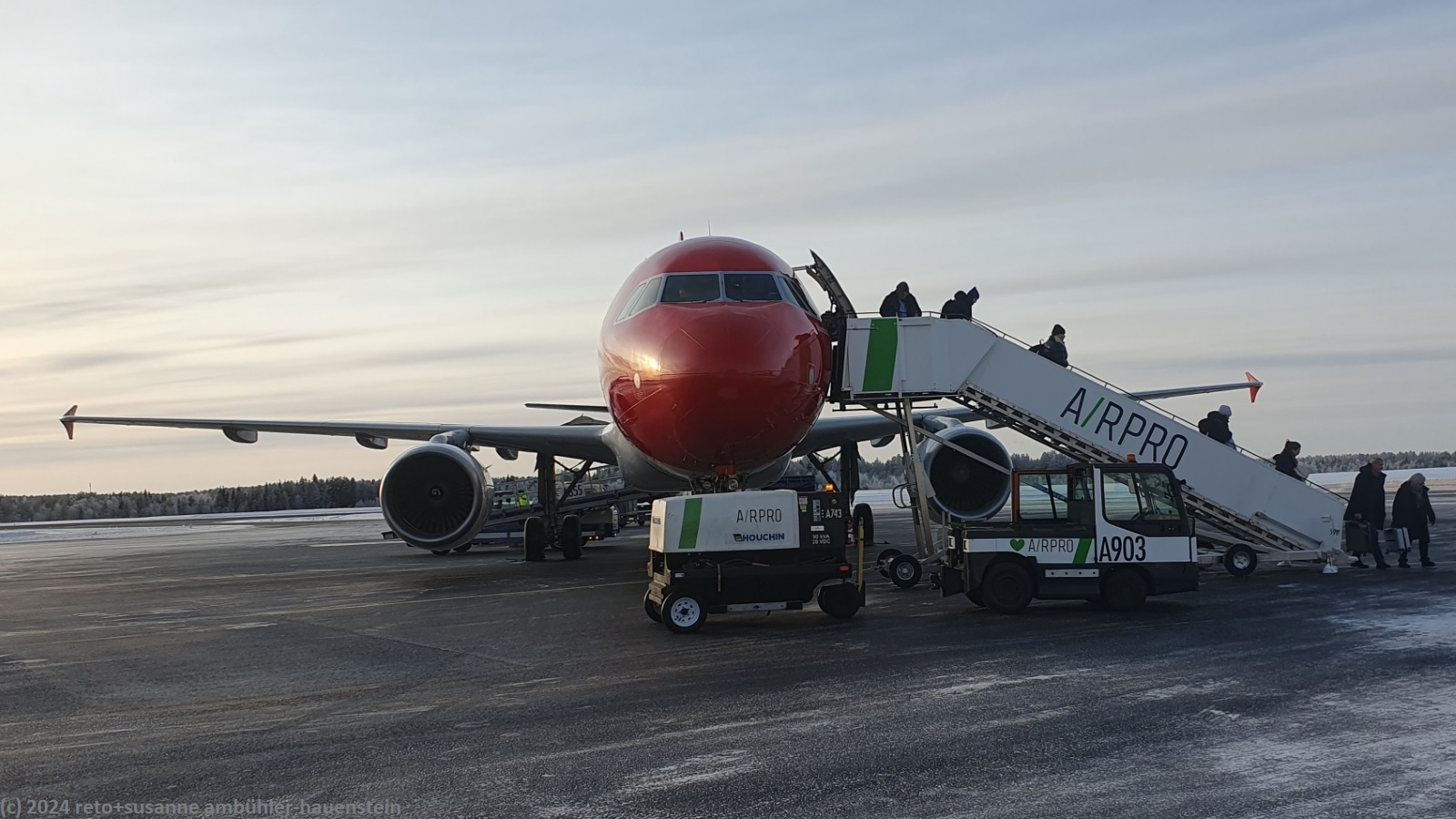 eine viertelstunde später sind wir am boden. wie schon vor zwei jahren in kiruna, müssen wir auch hier über eine treppe auf das rollfeld hinab steigen, siehe tagebuch vom 20-feb-2022. aber da die sonne scheint, fühlen sich die -21°C nicht so kalt an.