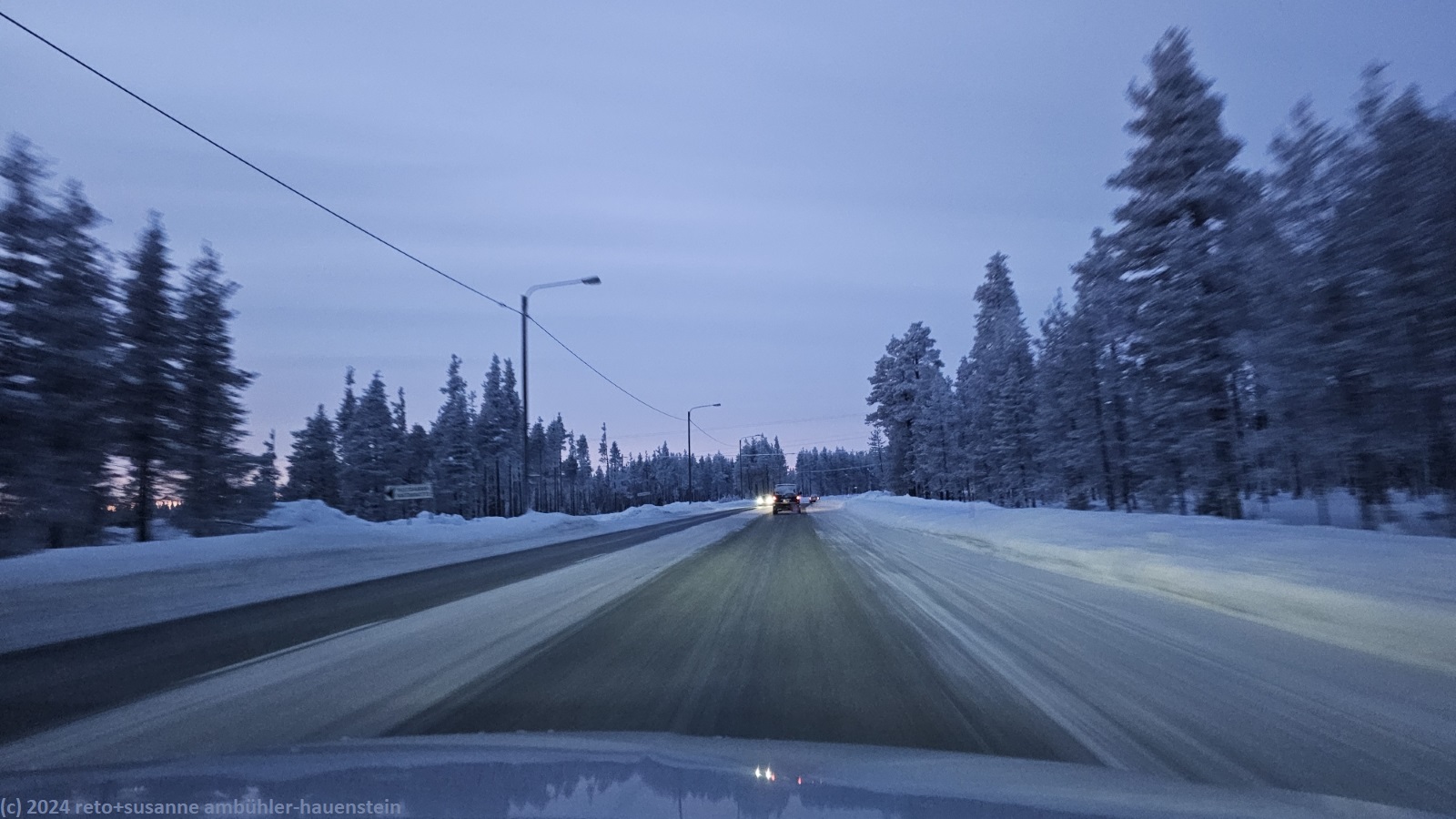 wir fahren zum prisma in kuusamo und machen einen grosseinkauf. danach essen wir ein sandwich im cafe neben dem riesigen lebensmittelladen. als wir uns gegen 16:30 uhr auf den weg machen, ist es schon ziemlich dunkel. im westen sehen wir einen schmalen, orange-roten streifen am horizont. die strasse 5 ist fast schneefrei, nur in der fahrbahnmitte hat es noch einen streifen schnee.