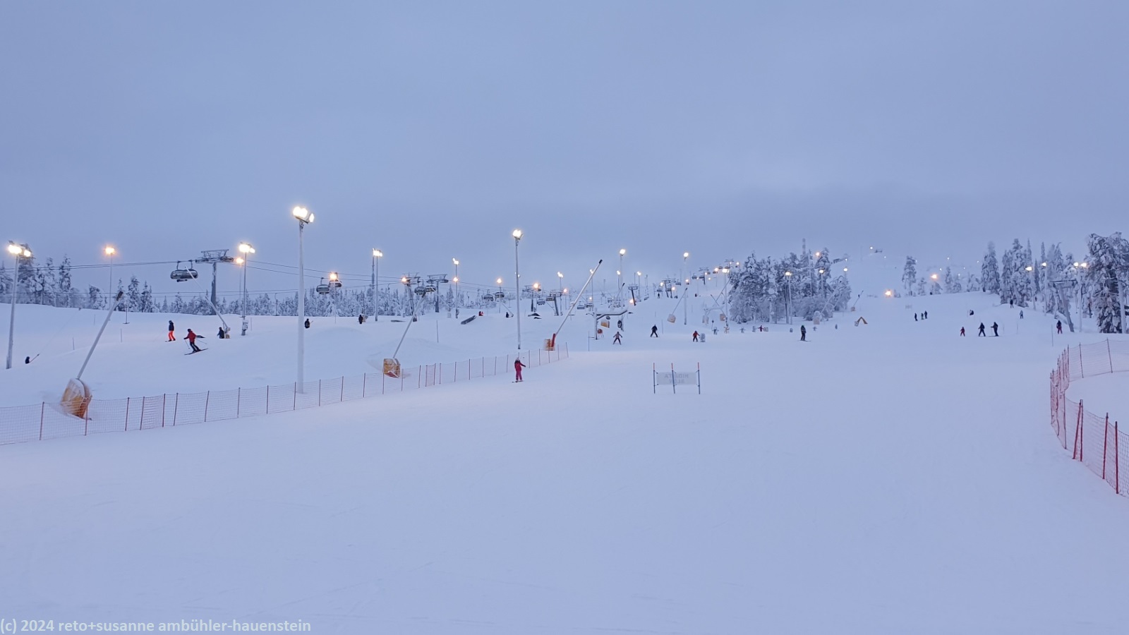 wie gewohnt stehen wir auch an unserem letzten ferientag in diesem ort um 08:30 uhr auf. ungewohnt ist jedoch, dass der himmel verhangen ist. dies wird unser erster tag auf dieser reise ohne sonnenschein. trotzdem fahren wir nach dem frühstück ins ruka valley und geniessen unseren zweiten tag auf den pisten. obwohl die sonne nicht scheint, ist es zwei bis drei grad weniger kalt als gestern. ob wir es deshalb länger draussen aushalten, oder ob wir uns schon etwas an die kälte gewöhnt haben, lässt sich schwer beurteilen. auf jeden fall dauert es heute ziemlich genau eine stunde, bis wir uns zum ersten mal aufwärmen müssen. wir haben neben der talstation des masto sesselliftes einen picknickraum entdeckt. in diesem brennt ein wärmendes feuer, ansonsten ist der raum vermutlich unbeheizt. es ist nicht so warm wie im restaurant, aber es reicht, um sich ein bisschen aufzuwärmen. nach 20 minuten brechen wir wieder auf. wir machen nochmals einige abfahrten, dann holen wir unseren rucksack im auto und geniessen unsere brote im picknickraum. noch hat es nicht so viele leute. gemäss dem herrn beim skiverleih beginnen am samstag die ferien in finnland, dann soll hier mächtig viel los sein. zum glück haben wir den ortswechsel auf freitag geplant, dann ist auf den strassen hoffentlich noch nicht so viel los. nach einer guten stunde wagen wir uns wieder ins freie. nocheinmal machen wir die pisten unsicher. am besten gefällt uns die schwarze piste "vaikea" auf der westseite des rukatunturi, welche ins ruka village hinunter führt. sie ist zwar sehr kurz, aber ordentlich steil und im oberen teil ein bisschen vereist. um 14:30 uhr setzen wir uns ins restaurant "Piste Ski Lodge & Taproom" und trinken einen wärmenden kaffee beziehungsweise eine heisse schokolade. danach geniessen wir noch einmal die pisten. kurz vor 16 uhr beenden wir den skitag und bringen unsere ausrüstung zurück. als wir wieder aus dem laden treten, ist die beleuchtung der skipisten angegangen.