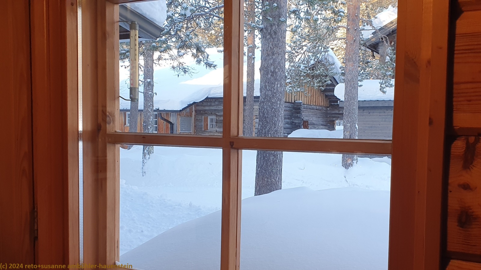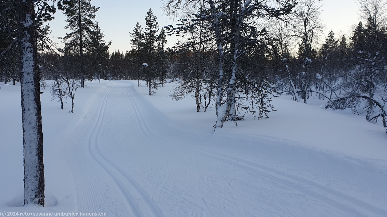 als wir um 08:30 uhr aufstehen, begrüsst uns eher überraschend ein beinahe wolkenloser himmel. nach dem frühstück folgen wir der gleichen loipe wir gestern zum savottakahvila, wo wir eine kurze pause machen. danach erklimmen wir die anhöhe westlich des ahopäät. wir laufen durch eine atemberaubend schöne winterlandschaft. gegen 12:40 uhr erreichen wir das hotel suomen latu kiilopää. im restaurant essen wir zu mittag. anschliessend geht es auf der loipe auf fast 500 m.ü.m hinauf. es folgt eine ziemlich spektakuläre abfahrt zum luulampi wilderness cafe hinunter. wir erfrischen uns mit kaffee und kuchen. während wir durch das tal rumakuru zurück zu unserer wohnung laufen, taucht die abendsonne die landschaft in fantastisch schönes, orangeviolettes licht. wir geniessen erst zwei erholsame sitzungen in der sauna und danach das abendessen. um 22 uhr fahren wir wiederum auf den kaunispää um polarlichter zu beobachten. zurück in unserer wohnung trinken wir noch einen tee, bevor wir gegen 23:30 uhr unter die bettdecke schlüpfen.