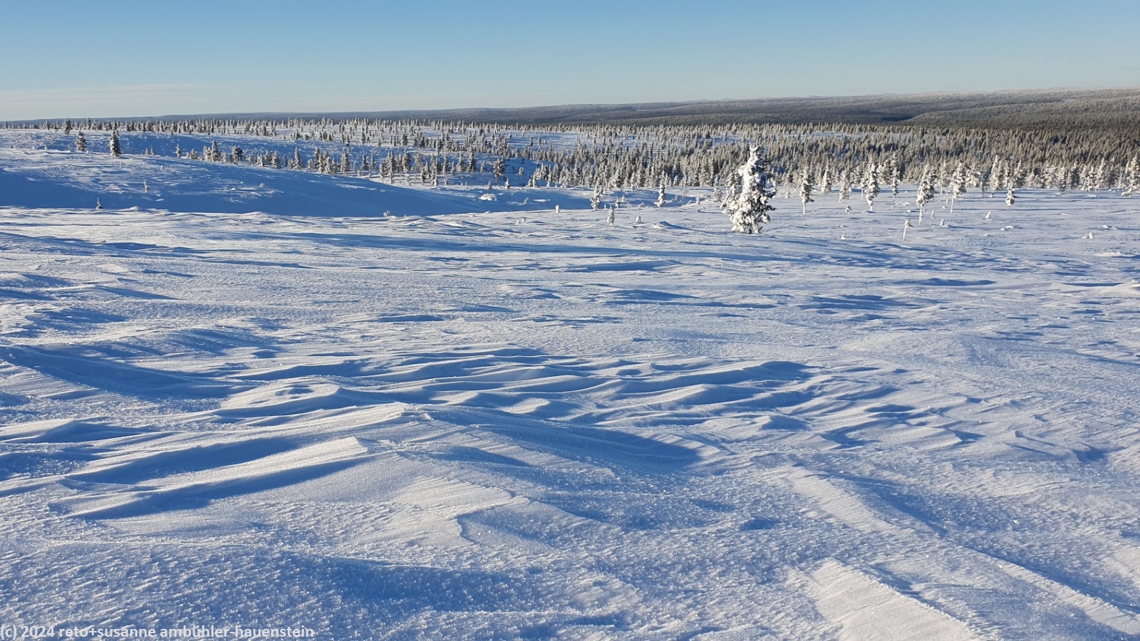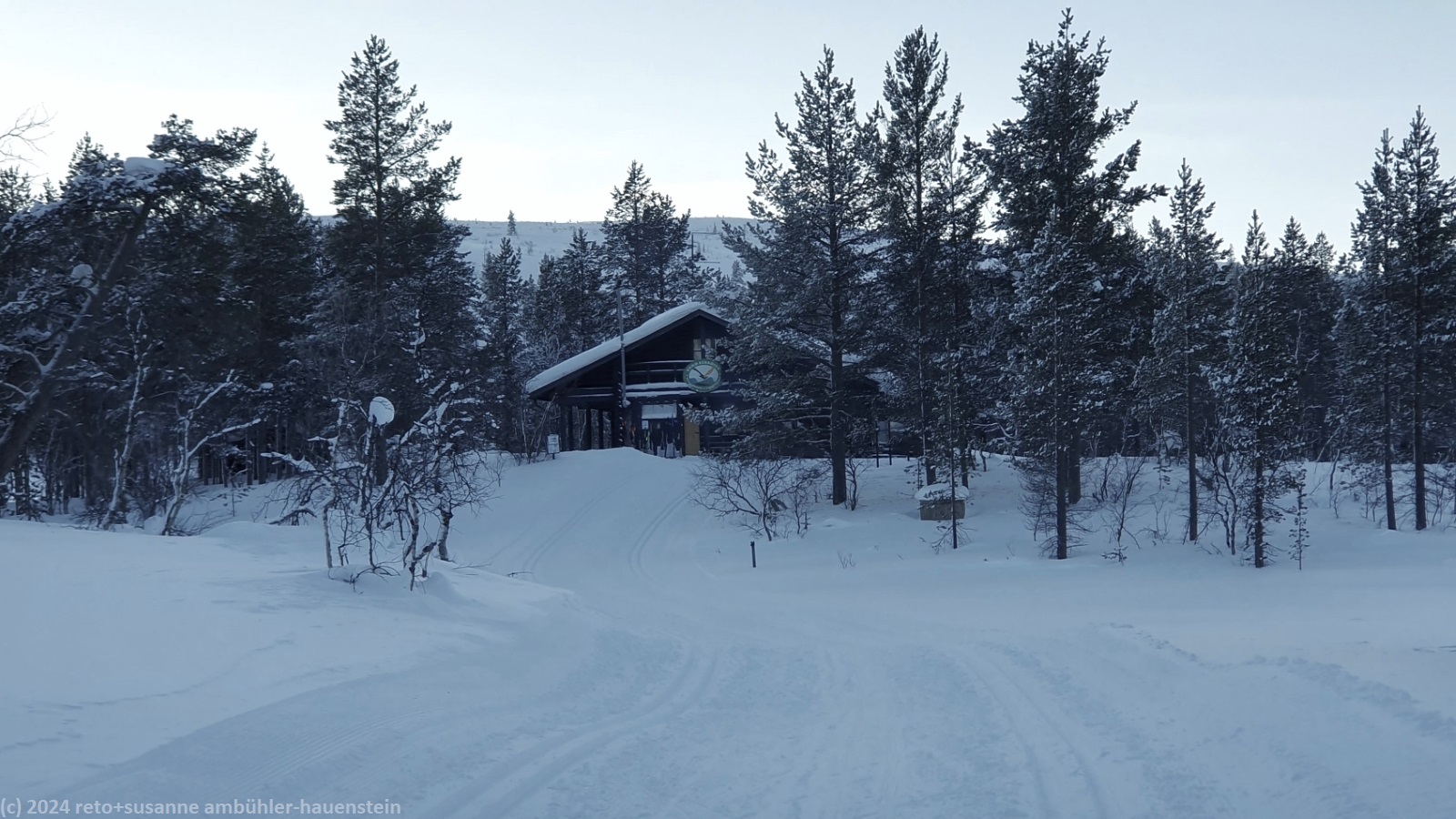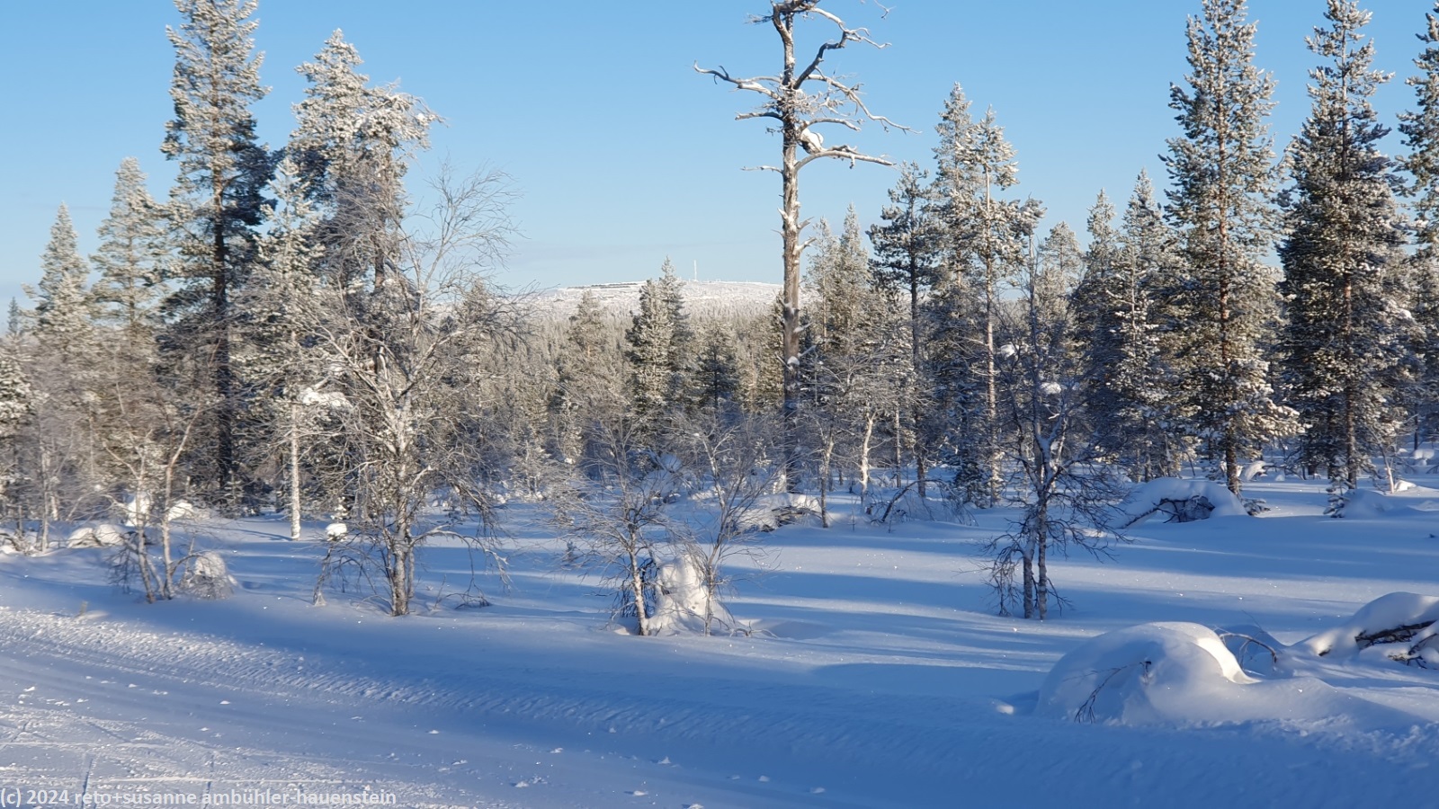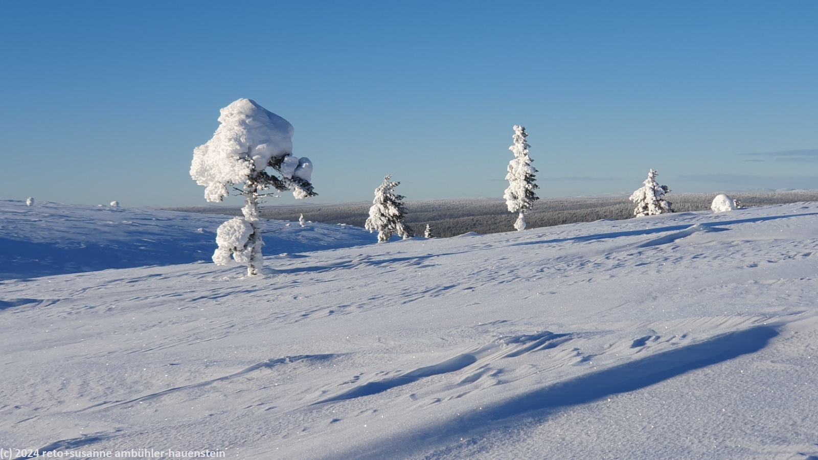 als wir wieder aufbrechen, beginnt der aufstieg richtung kiilopää. wir laufen erneut durch einen fantastischen winterwald. die strecke ist abwechslungsreich, das wetter äusserst angenehm. die temperatur liegt bei -8°C und es geht kaum ein wind. die loipe führt über die flanke des ahopäät. auf diesem abschnitt sind ziemlich viele menschen unterwegs, aber die läuferInnen sind alle sehr rücksichtsvoll. wir plaudern kurz mit einer gruppe südfinnen. sie sind gestern 1000 km nordwärts gefahren um hier urlaub zu machen. sie erklären uns, dass ab diesem wochenende die südfinnen eine woche schulferien haben. nächste woche sind die mittelfinnen und die woche danach die nordfinnen an der reihe. auf etwa 350 m.ü.m erreichen wir die baumgrenze. die verschneiten hügel sehen toll aus. auf rund 420 m.ü.m sind wir auf dem höchsten punkt dieses abschnittes. nun sehen wir in die weite. alles ist weiss, die bäume tragen ein wundervolles winterkleid, einfach traumhaft. bis zum restaurant suonen latu kiilopää folgt eine sportliche abfahrt, die wir aber schadlos überstehen. beim restaurant hat es einen campingplatz. auf diesem haben wir auch schon mehrere nächte verbracht, siehe tagebuch vom 22-jul-2022 und folgende.