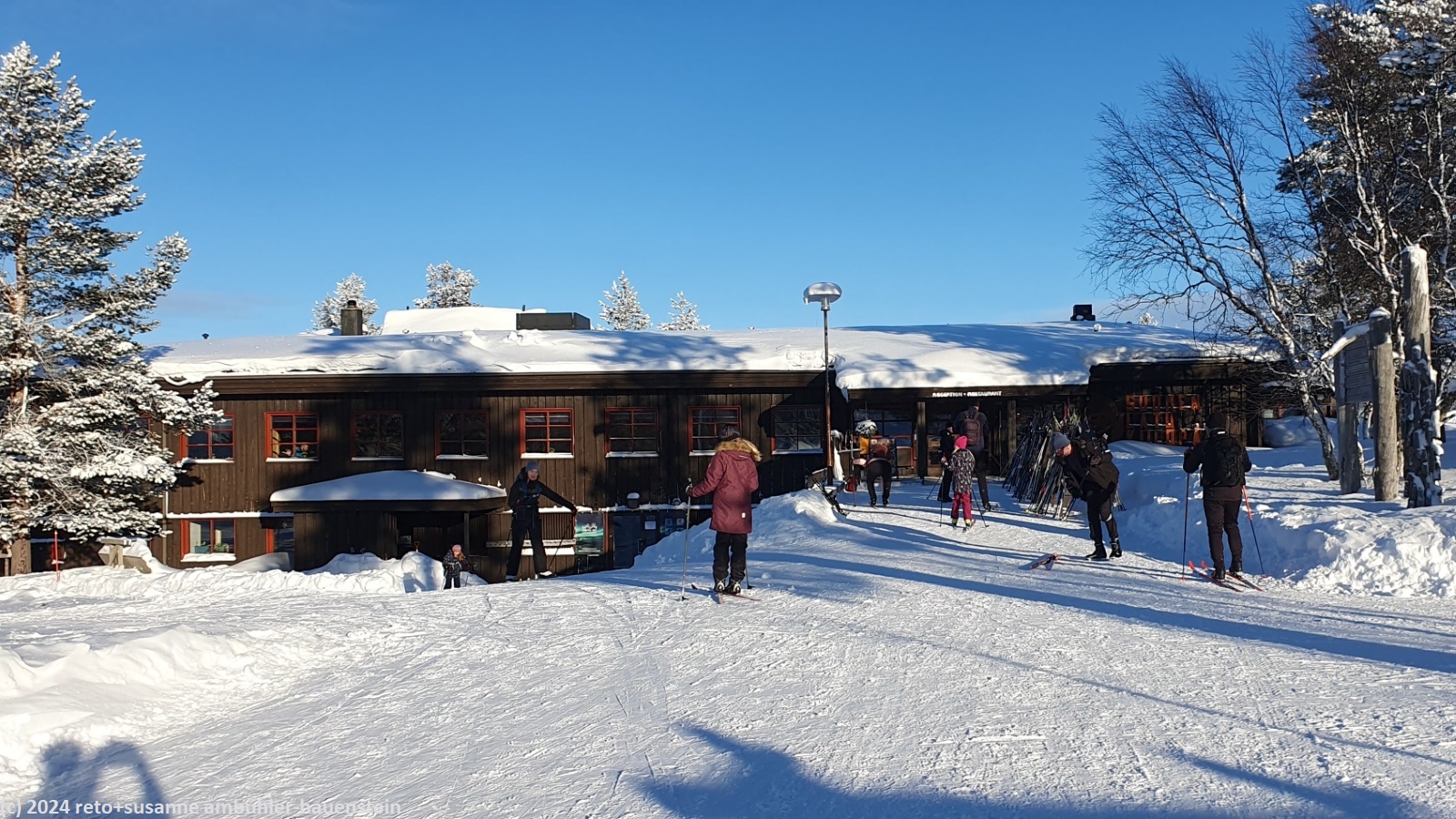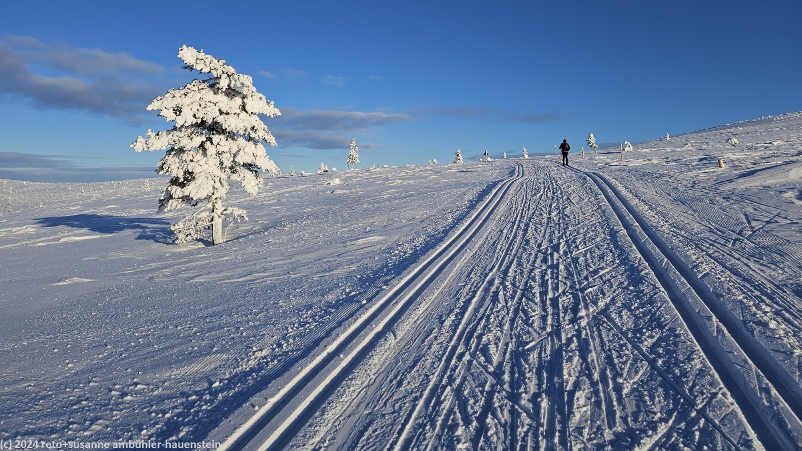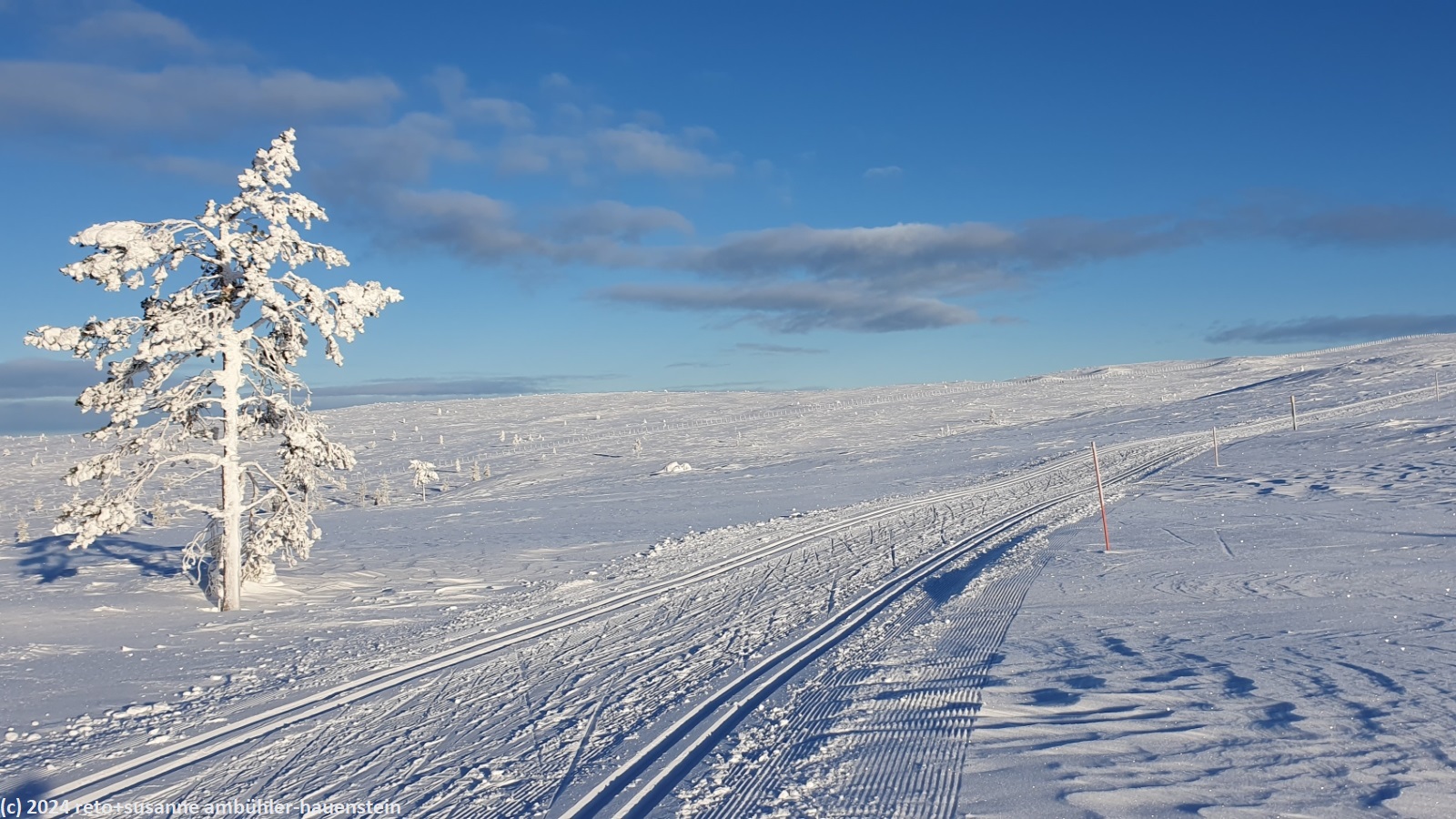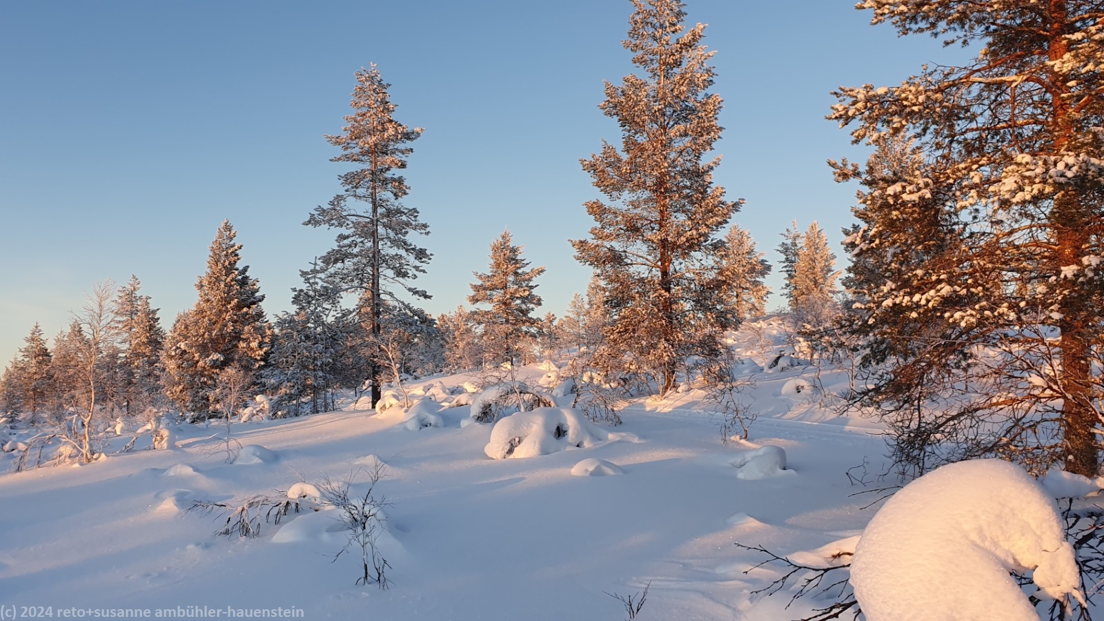 als wir wieder aufbrechen, beginnt der aufstieg richtung kiilopää. wir laufen erneut durch einen fantastischen winterwald. die strecke ist abwechslungsreich, das wetter äusserst angenehm. die temperatur liegt bei -8°C und es geht kaum ein wind. die loipe führt über die flanke des ahopäät. auf diesem abschnitt sind ziemlich viele menschen unterwegs, aber die läuferInnen sind alle sehr rücksichtsvoll. wir plaudern kurz mit einer gruppe südfinnen. sie sind gestern 1000 km nordwärts gefahren um hier urlaub zu machen. sie erklären uns, dass ab diesem wochenende die südfinnen eine woche schulferien haben. nächste woche sind die mittelfinnen und die woche danach die nordfinnen an der reihe. auf etwa 350 m.ü.m erreichen wir die baumgrenze. die verschneiten hügel sehen toll aus. auf rund 420 m.ü.m sind wir auf dem höchsten punkt dieses abschnittes. nun sehen wir in die weite. alles ist weiss, die bäume tragen ein wundervolles winterkleid, einfach traumhaft. bis zum restaurant suonen latu kiilopää folgt eine sportliche abfahrt, die wir aber schadlos überstehen. beim restaurant hat es einen campingplatz. auf diesem haben wir auch schon mehrere nächte verbracht, siehe tagebuch vom 22-jul-2022 und folgende.