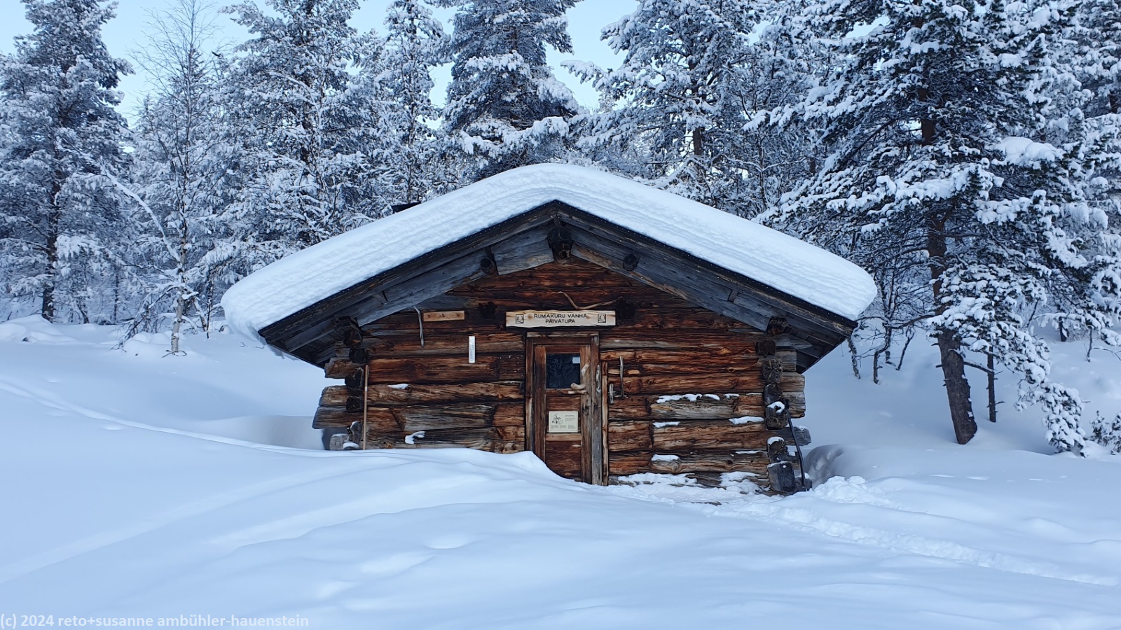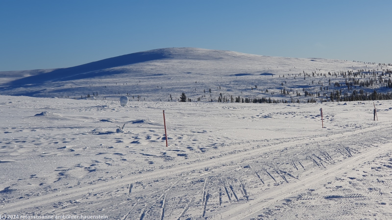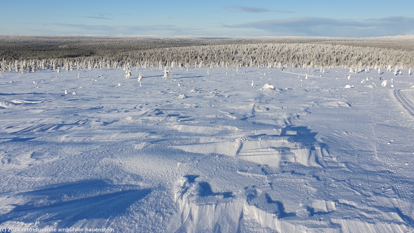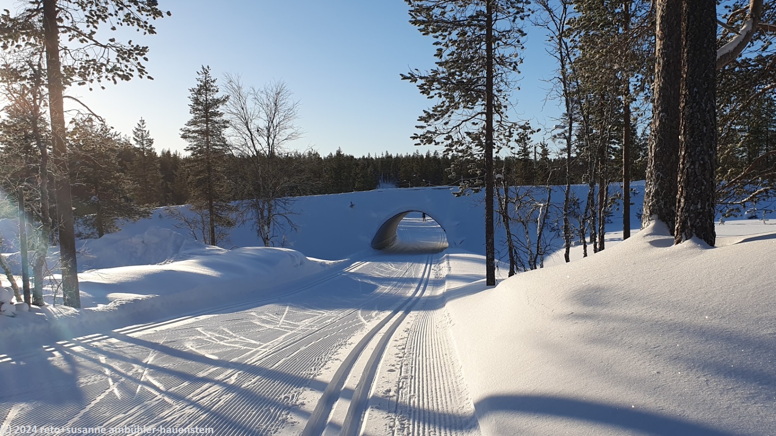 als wir wieder aufbrechen, beginnt der aufstieg richtung kiilopää. wir laufen erneut durch einen fantastischen winterwald. die strecke ist abwechslungsreich, das wetter äusserst angenehm. die temperatur liegt bei -8°C und es geht kaum ein wind. die loipe führt über die flanke des ahopäät. auf diesem abschnitt sind ziemlich viele menschen unterwegs, aber die läuferInnen sind alle sehr rücksichtsvoll. wir plaudern kurz mit einer gruppe südfinnen. sie sind gestern 1000 km nordwärts gefahren um hier urlaub zu machen. sie erklären uns, dass ab diesem wochenende die südfinnen eine woche schulferien haben. nächste woche sind die mittelfinnen und die woche danach die nordfinnen an der reihe. auf etwa 350 m.ü.m erreichen wir die baumgrenze. die verschneiten hügel sehen toll aus. auf rund 420 m.ü.m sind wir auf dem höchsten punkt dieses abschnittes. nun sehen wir in die weite. alles ist weiss, die bäume tragen ein wundervolles winterkleid, einfach traumhaft. bis zum restaurant suonen latu kiilopää folgt eine sportliche abfahrt, die wir aber schadlos überstehen. beim restaurant hat es einen campingplatz. auf diesem haben wir auch schon mehrere nächte verbracht, siehe tagebuch vom 22-jul-2022 und folgende.