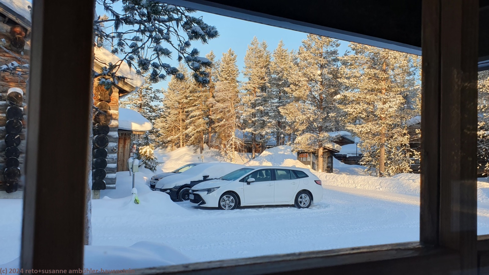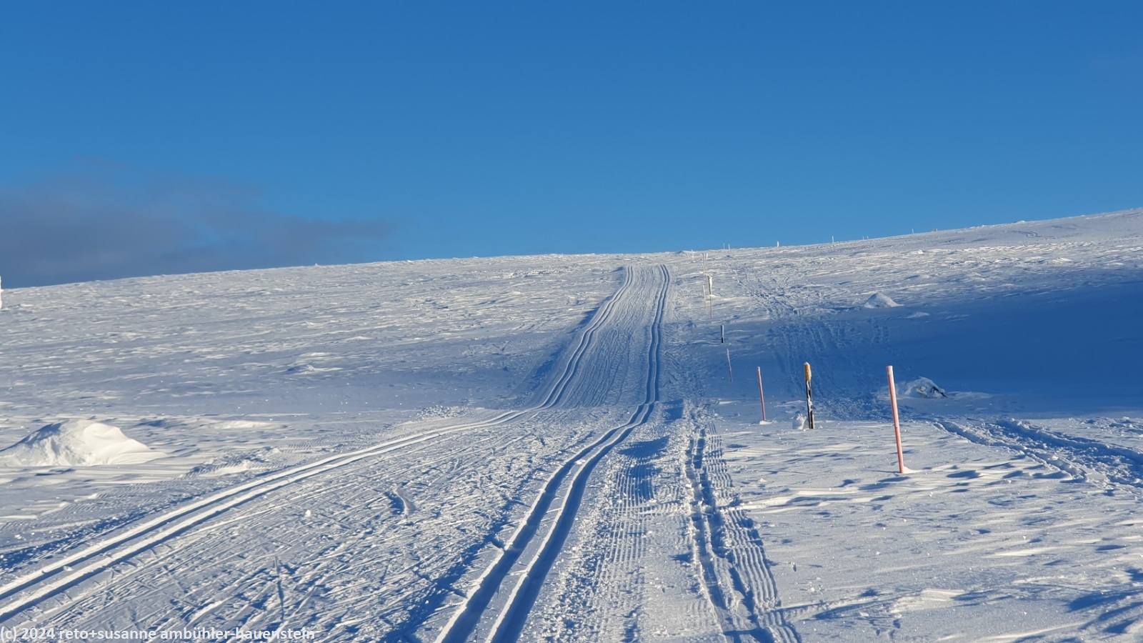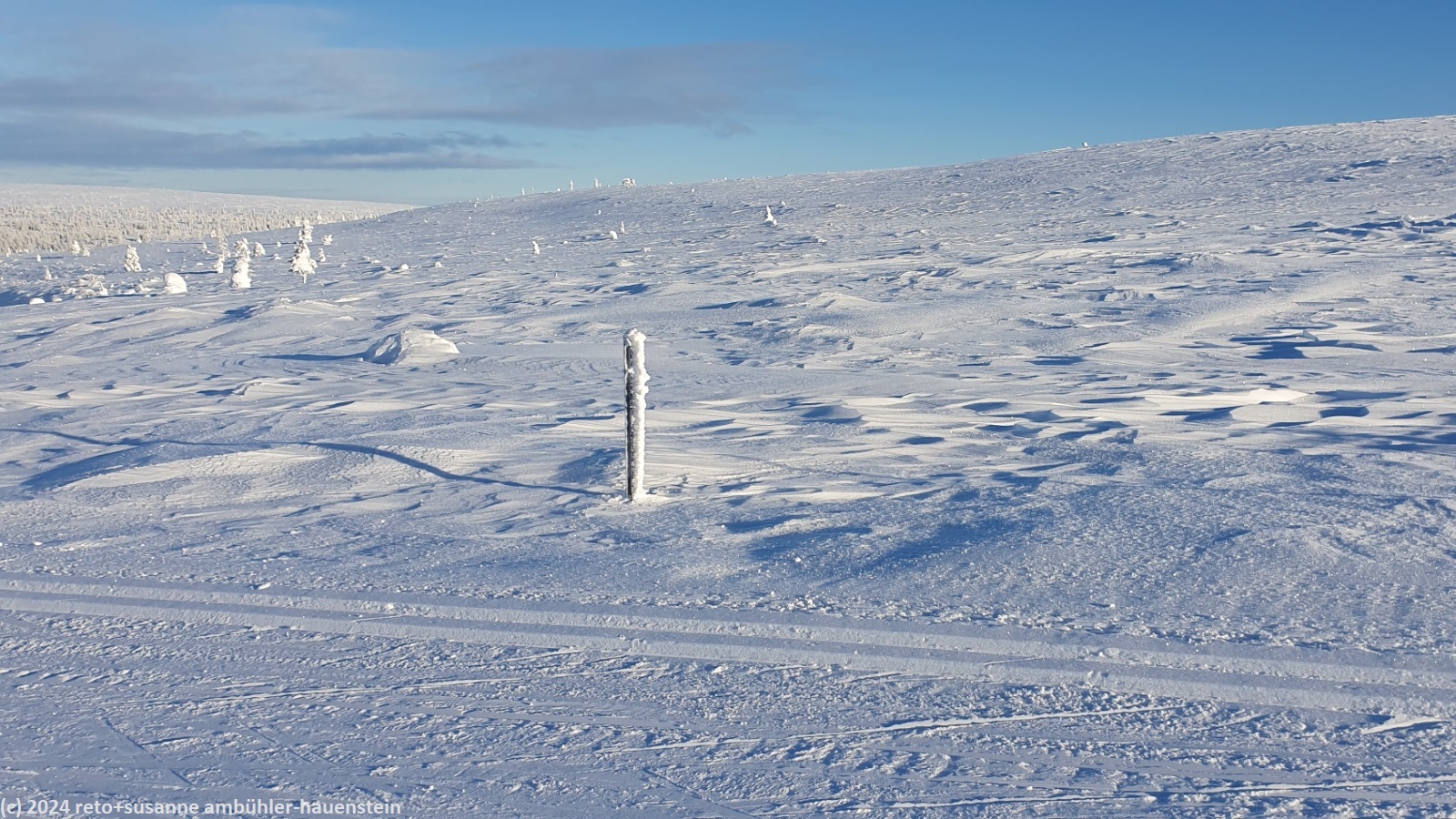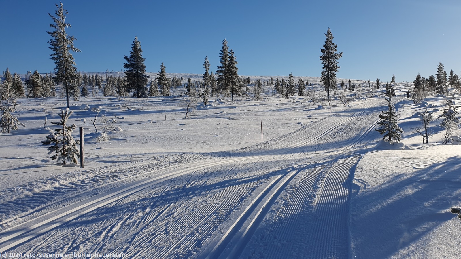 als wir wieder aufbrechen, beginnt der aufstieg richtung kiilopää. wir laufen erneut durch einen fantastischen winterwald. die strecke ist abwechslungsreich, das wetter äusserst angenehm. die temperatur liegt bei -8°C und es geht kaum ein wind. die loipe führt über die flanke des ahopäät. auf diesem abschnitt sind ziemlich viele menschen unterwegs, aber die läuferInnen sind alle sehr rücksichtsvoll. wir plaudern kurz mit einer gruppe südfinnen. sie sind gestern 1000 km nordwärts gefahren um hier urlaub zu machen. sie erklären uns, dass ab diesem wochenende die südfinnen eine woche schulferien haben. nächste woche sind die mittelfinnen und die woche danach die nordfinnen an der reihe. auf etwa 350 m.ü.m erreichen wir die baumgrenze. die verschneiten hügel sehen toll aus. auf rund 420 m.ü.m sind wir auf dem höchsten punkt dieses abschnittes. nun sehen wir in die weite. alles ist weiss, die bäume tragen ein wundervolles winterkleid, einfach traumhaft. bis zum restaurant suonen latu kiilopää folgt eine sportliche abfahrt, die wir aber schadlos überstehen. beim restaurant hat es einen campingplatz. auf diesem haben wir auch schon mehrere nächte verbracht, siehe tagebuch vom 22-jul-2022 und folgende.