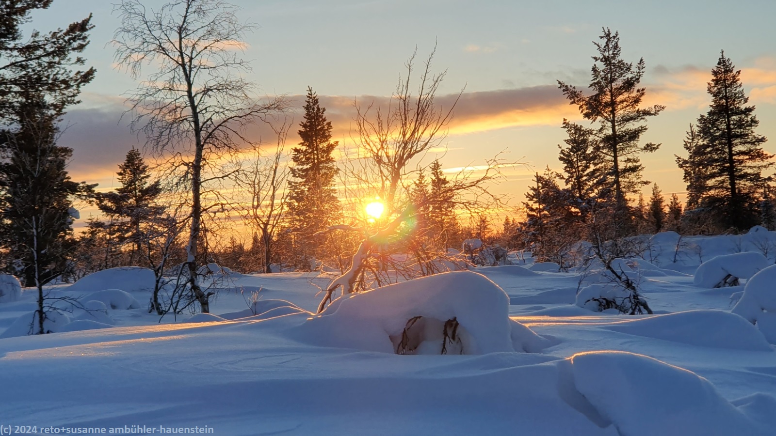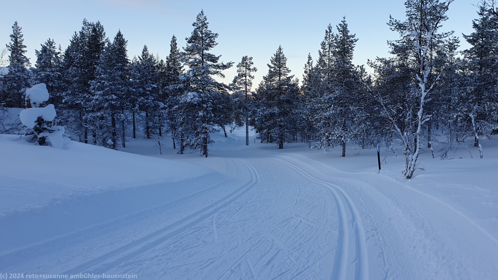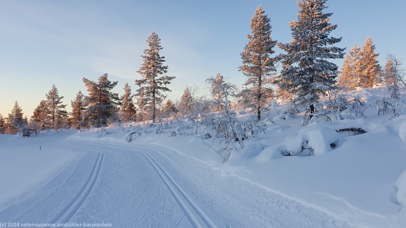als wir kurz nach 15 uhr wieder aufbrechen, liegt das tal bereits im schatten. auf diesem abschnitt sind kaum mehr leute unterwegs. die spur folgt im wesentlichen dem luulammit. von dem fluss ist allerdings nichts zu sehen. die wunderschöne landschaft wird plötzlich von der abendsonne beleuchtet. der schnee auf den bäumen hat eine orangeviolette farbe, das sieht fantastisch aus. wenig später liegt das schmale tal definitiv im schatten. gegen 16:40 uhr sind wir wieder bei unserem haus.