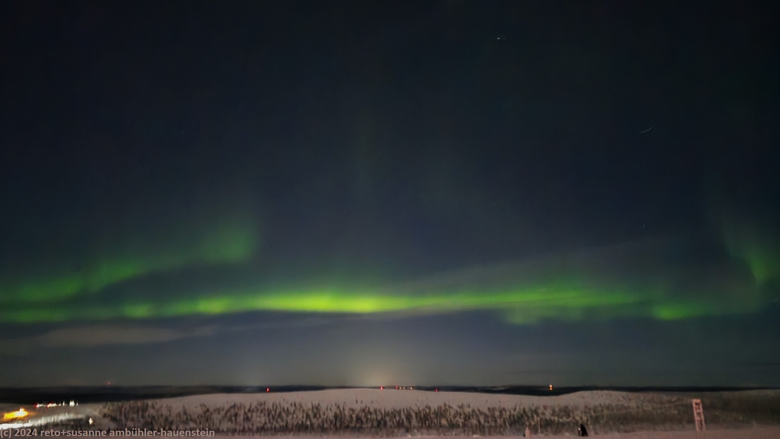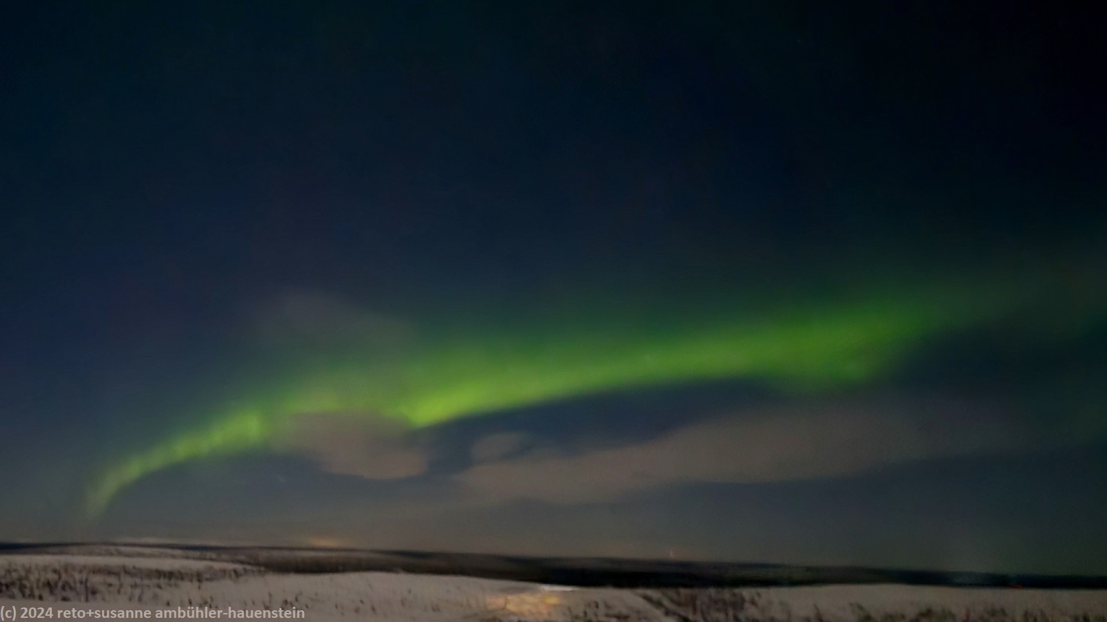 das war eine fantastische runde. wir sind 26.4 km gelaufen und haben dabei 520 höhenmeter überwunden, das ist gar nicht so übel. während wir die sauna aufheizen, essen wir eine kleinigkeit. nach zwei erholsamen sitzungen geniessen wir das abendessen. danach führe ich die bücher nach. susanne studiert die polarlicht-situation. um 22 uhr fahren wir wieder auf den kaunispää. tatsächlich gibt es auch heute polarlichter zu sehen.