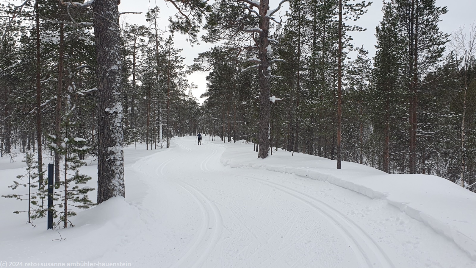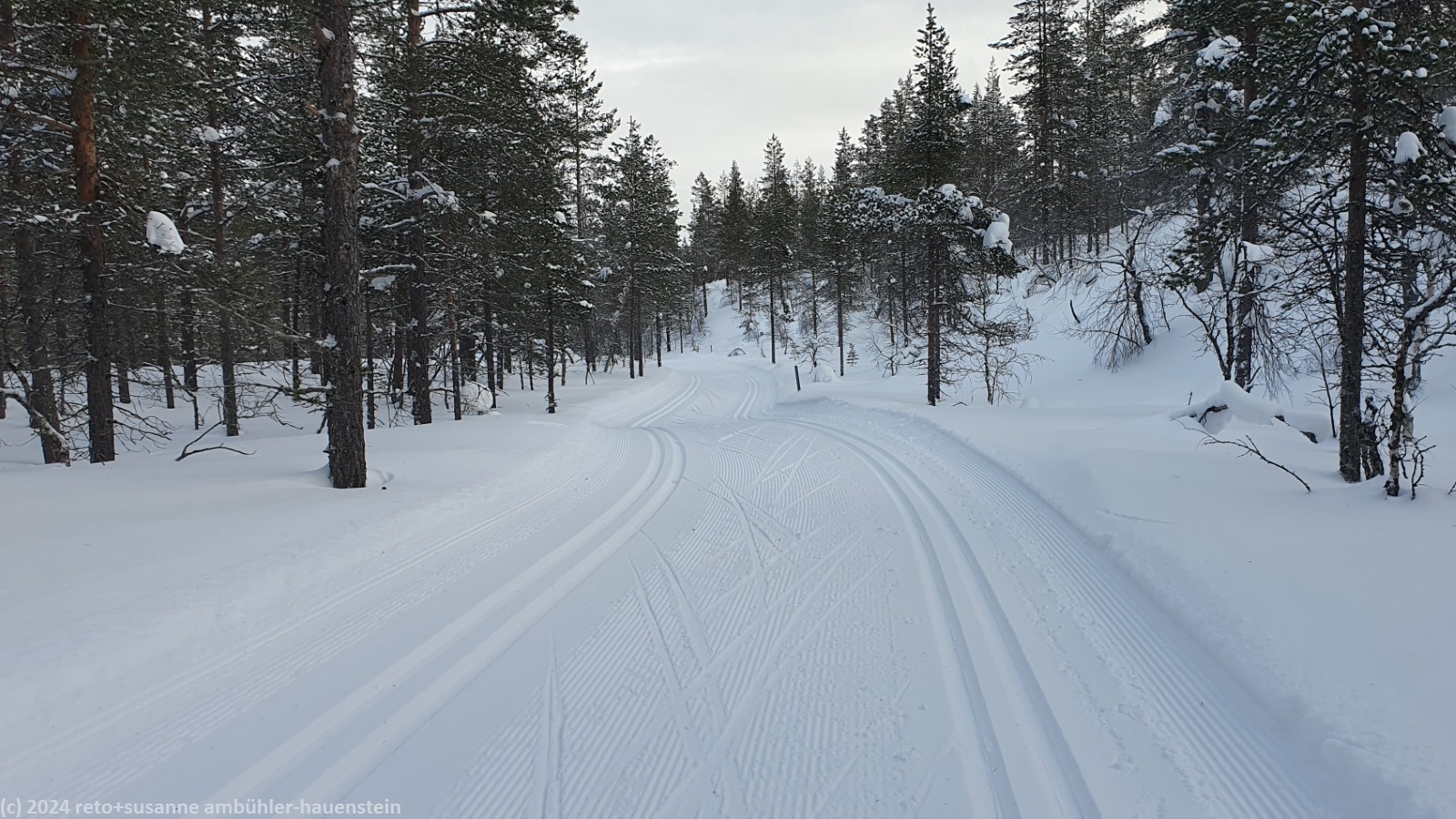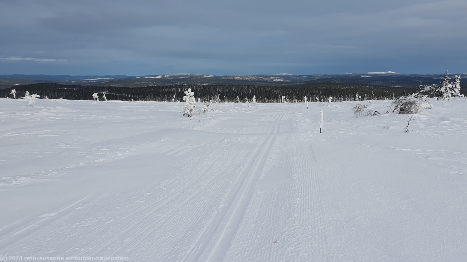 als wir wie gewohnt kurz nach 08:30 uhr aufstehen, scheint eher überraschend die sonne. es war eigentlich ein wolkiger tag ohne sonne angesagt. im laufe des tages ziehen zwar dann doch wolken auf, aber wir sehen immer wieder die sonne. kurz nach 10 uhr brechen wir zu unserer heutigen langlaufrunde auf. wir folgen der loipe, auf der wir am allerersten tag vom service center zu unserem haus gelaufen sind. beim service center tauscht susanne ihre schuhe. der eine hat eine lästige druckstelle. die neuen schuhe sind viel besser und so sind wir schon bald wieder unterwegs. die loipe führt an den talstationen der skilifte vorbei und folgt dann dem lauf des lutto. dieser fluss markiert die grenze des urho kekkosen nationalparks. 3.4 km nach dem service center biegen wir links ab und verlassen damit den nationalpark. die landschaft ändert dadurch nicht. wir laufen durch einen schönen, dichten wald aus nadelbäumen. gegen 11:15 uhr erreichen wir die palopää kåta. auf den folgenden 3 km geht es von 240 auf 400 m.ü.m hinauf und damit wie schon gestern über die baumgrenze. wieder haben wir eine fantastische weitsicht, nur ist der himmel heute nicht blau, sondern vorallem richtung nordosten dunkelgrau. dies ergibt einen wunderschönen kontrast zur weissen landschaft. nach dem höchsten punkt geht es gleich steil wieder abwärts. auf den ersten metern fehlt die spur, aber dann ist sie in sehr gutem zustand und die abfahrt macht richtig spass. da wir rückenwind haben, ist es auch nicht so kalt. kurzzeitig erreichen wir geschwindigkeiten von über 30 km/h. im nu sind wir unten bei der tageshütte moitakuru.