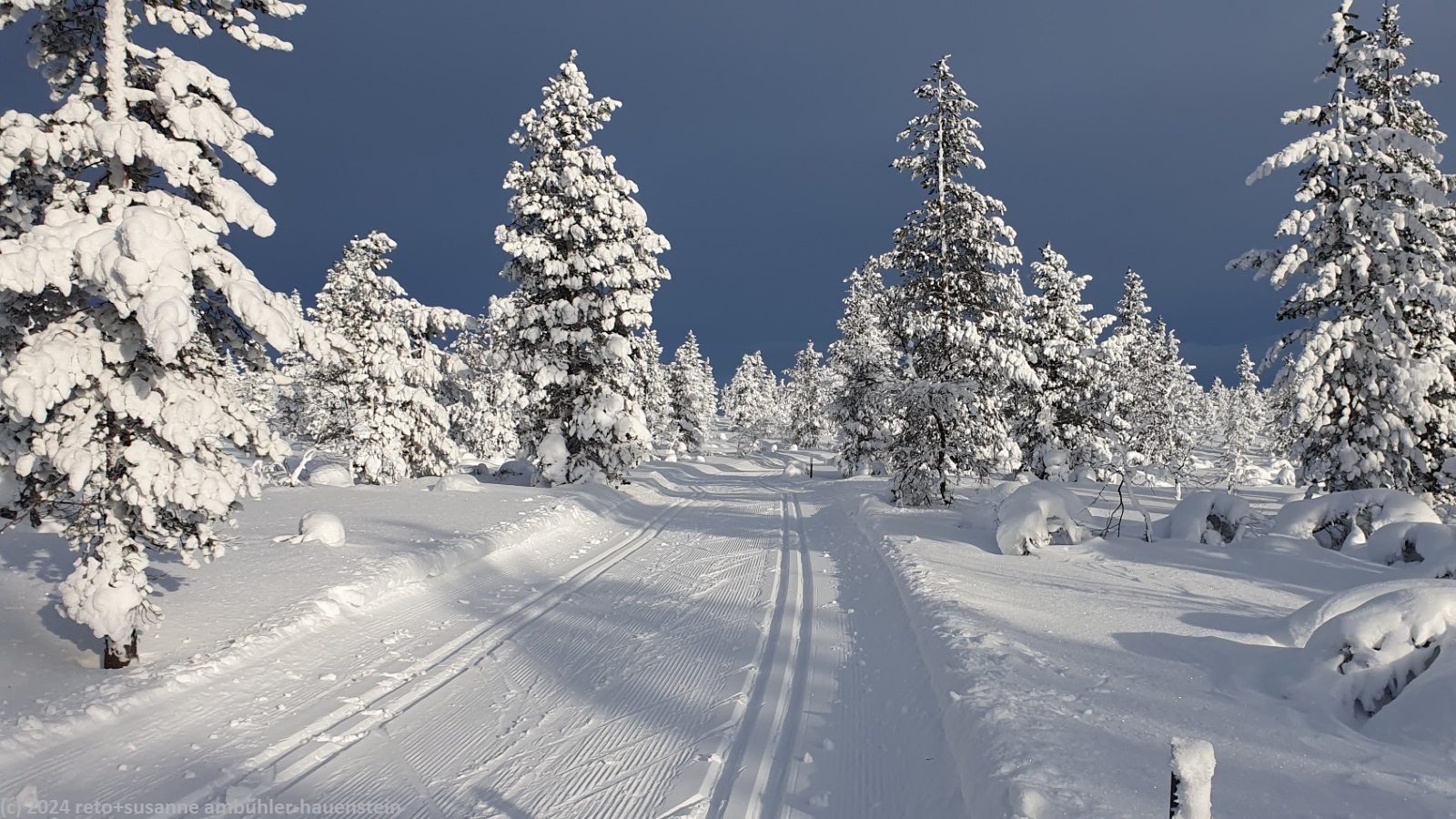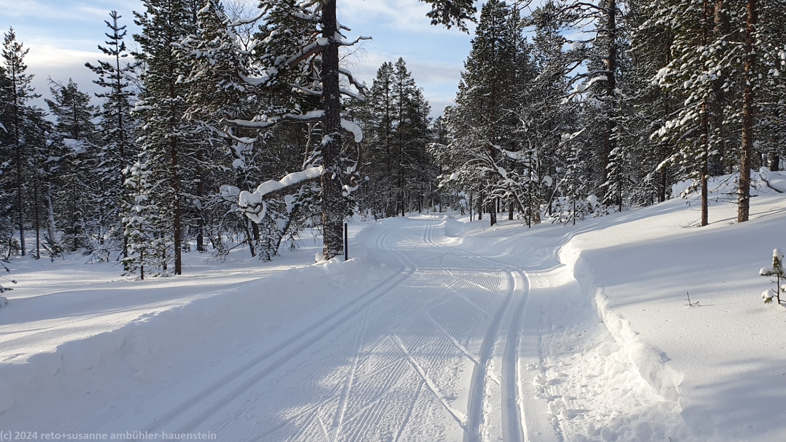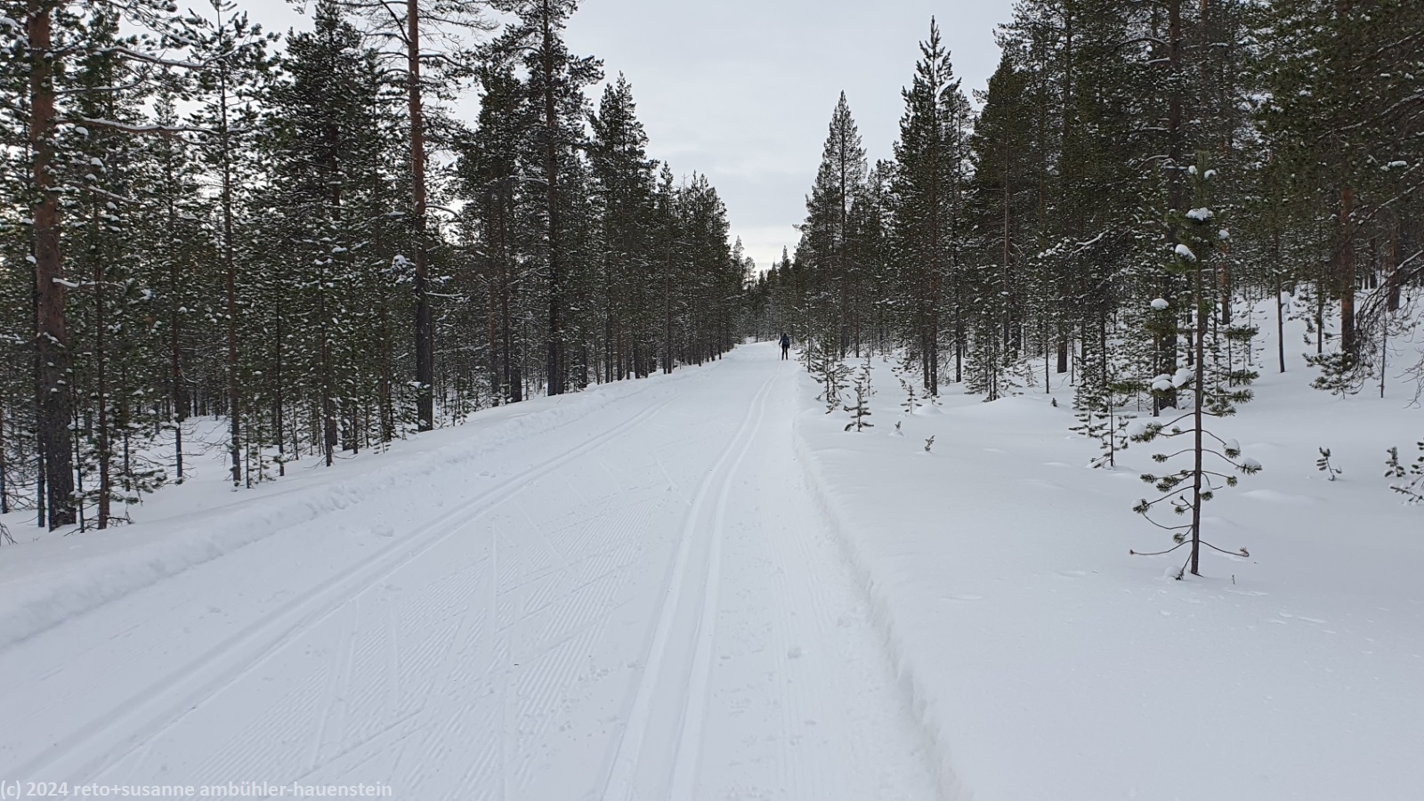 als wir wie gewohnt kurz nach 08:30 uhr aufstehen, scheint eher überraschend die sonne. es war eigentlich ein wolkiger tag ohne sonne angesagt. im laufe des tages ziehen zwar dann doch wolken auf, aber wir sehen immer wieder die sonne. kurz nach 10 uhr brechen wir zu unserer heutigen langlaufrunde auf. wir folgen der loipe, auf der wir am allerersten tag vom service center zu unserem haus gelaufen sind. beim service center tauscht susanne ihre schuhe. der eine hat eine lästige druckstelle. die neuen schuhe sind viel besser und so sind wir schon bald wieder unterwegs. die loipe führt an den talstationen der skilifte vorbei und folgt dann dem lauf des lutto. dieser fluss markiert die grenze des urho kekkosen nationalparks. 3.4 km nach dem service center biegen wir links ab und verlassen damit den nationalpark. die landschaft ändert dadurch nicht. wir laufen durch einen schönen, dichten wald aus nadelbäumen. gegen 11:15 uhr erreichen wir die palopää kåta. auf den folgenden 3 km geht es von 240 auf 400 m.ü.m hinauf und damit wie schon gestern über die baumgrenze. wieder haben wir eine fantastische weitsicht, nur ist der himmel heute nicht blau, sondern vorallem richtung nordosten dunkelgrau. dies ergibt einen wunderschönen kontrast zur weissen landschaft. nach dem höchsten punkt geht es gleich steil wieder abwärts. auf den ersten metern fehlt die spur, aber dann ist sie in sehr gutem zustand und die abfahrt macht richtig spass. da wir rückenwind haben, ist es auch nicht so kalt. kurzzeitig erreichen wir geschwindigkeiten von über 30 km/h. im nu sind wir unten bei der tageshütte moitakuru.