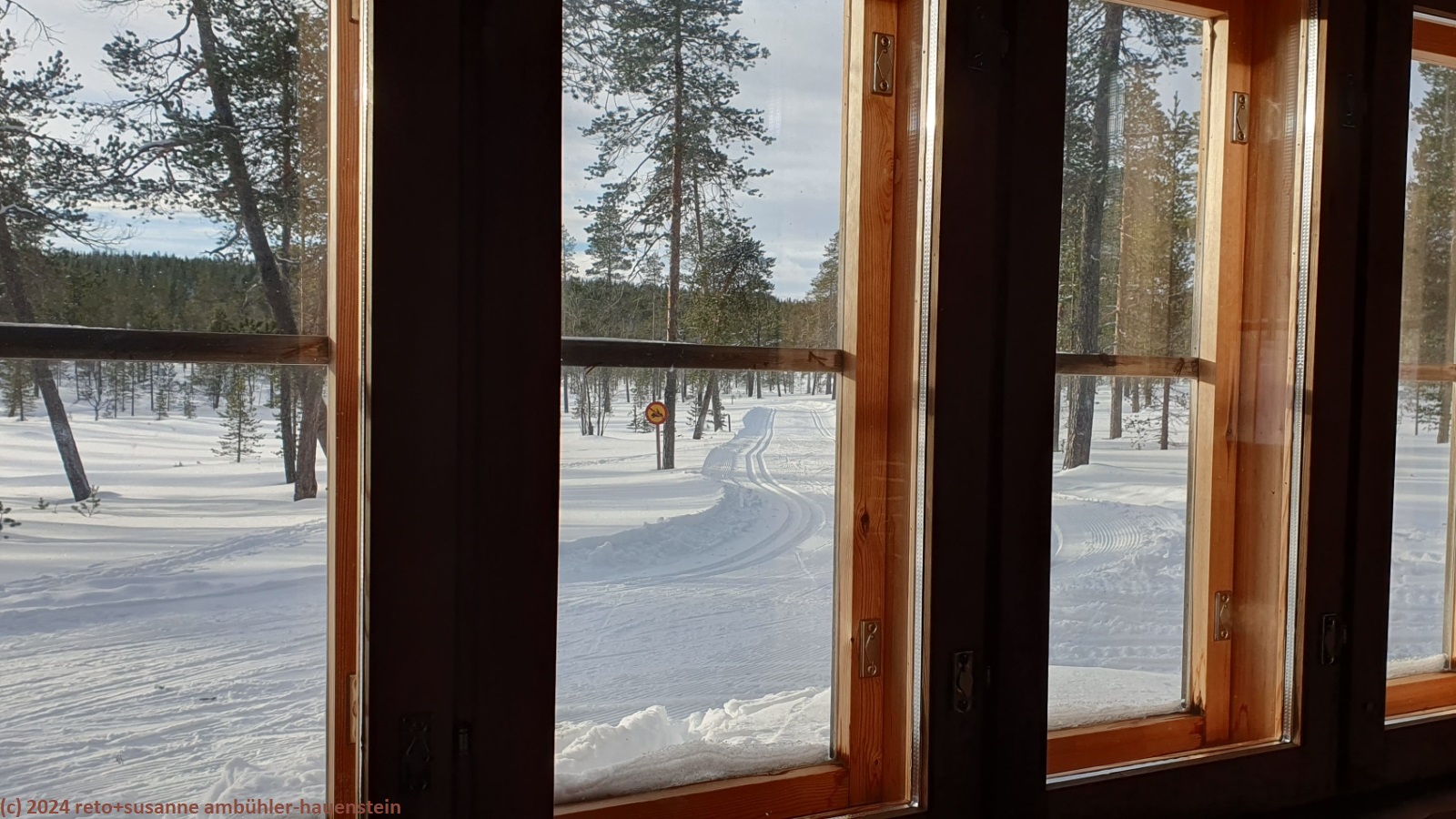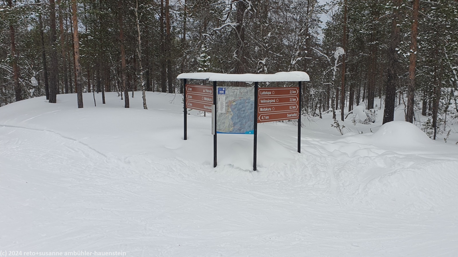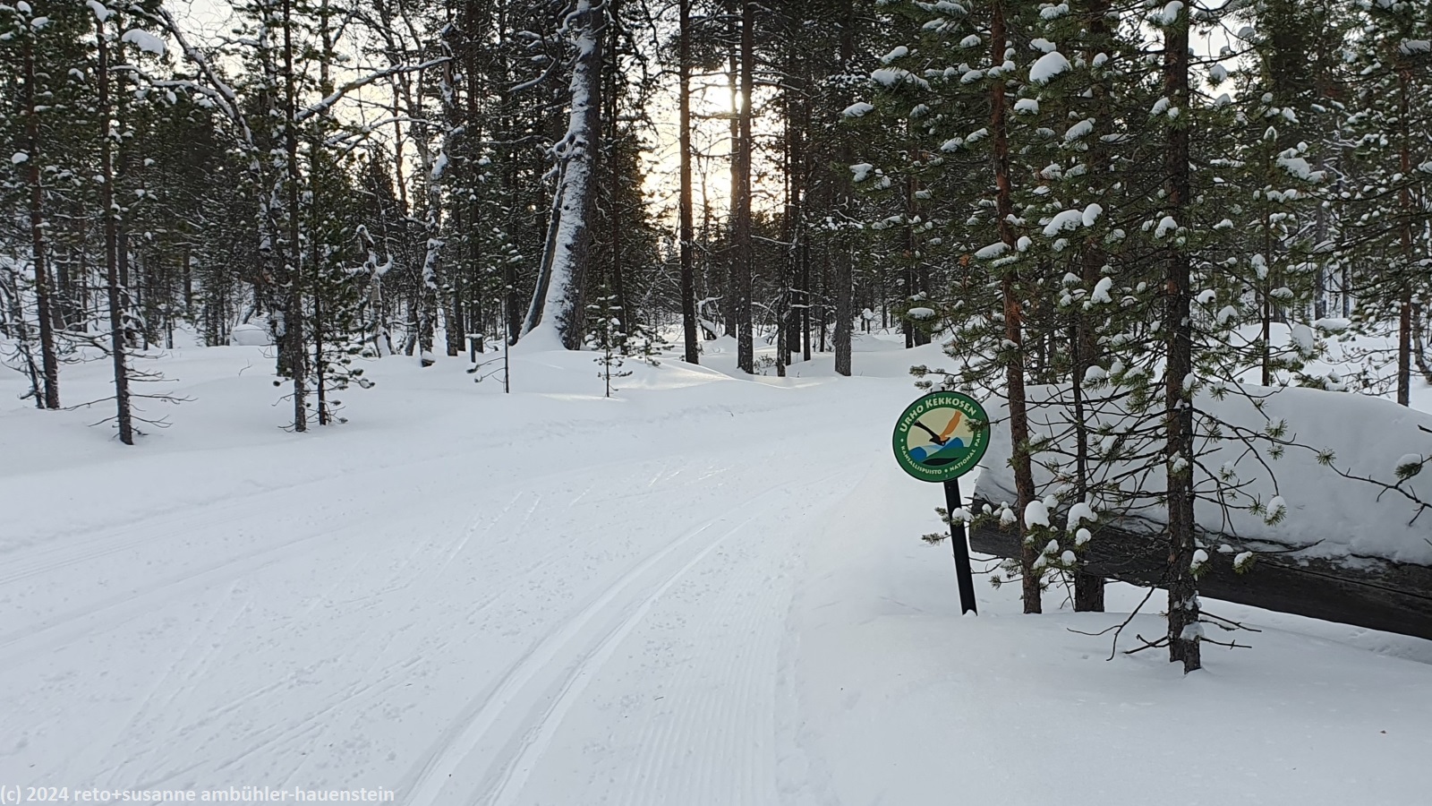 als wir kurz nach 08:30 uhr aufstehen ist das wetter deutlich sonniger als vorhergesagt. nach dem frühstück laufen wir erst bis zum service center, damit susanne ihre laufschuhe tauschen kann. danach folgen wir ein stück dem lutto und biegen dann nordwärts ab. nach der palopää kåta beginnt der aufstieg zum gleichnamigen berg. bis zur waldgrenze laufen wir durch einen traumhaft schönen, tief verschneiten winterwald. nach einer sportlichen abfahrt erreichen wir kurz nach mittag die tageshütte moitakuru. susanne entfacht im offenen kamin ein wärmendes feuer, danach verzehren wir unsere brote. an einer riesigen huskyfarm vorbei gelangen wir wieder in das tal des lutto. diesem folgen wir zurück bis ins dorf. im ski kahvila erfrischen wir uns mit kaffee und einem schokoriegel. zurück im haus geniessen wir erst zwei sitzungen in der sauna und dann das abendessen. danach verbringen wir einen gemütlichen abend in unserer stube.