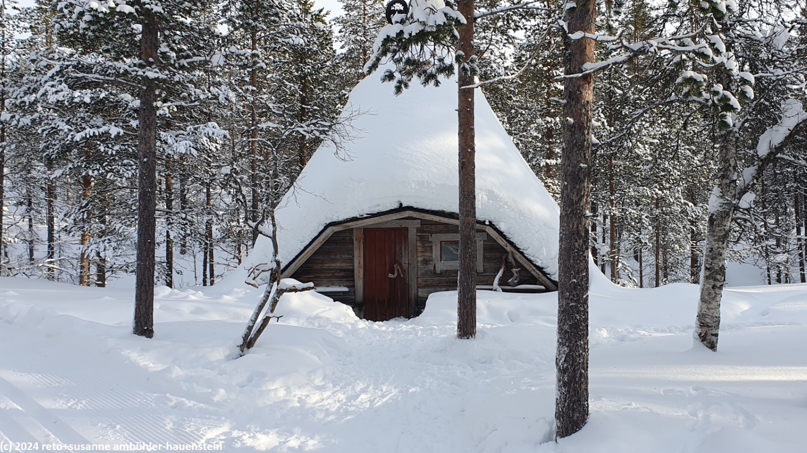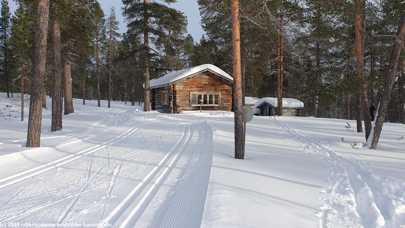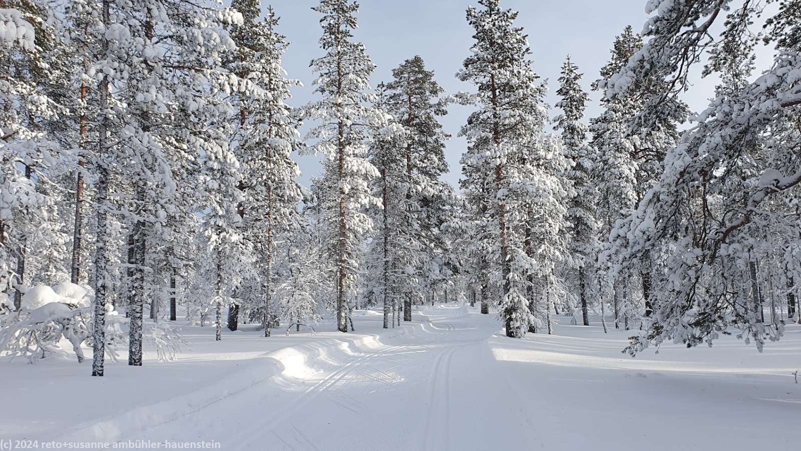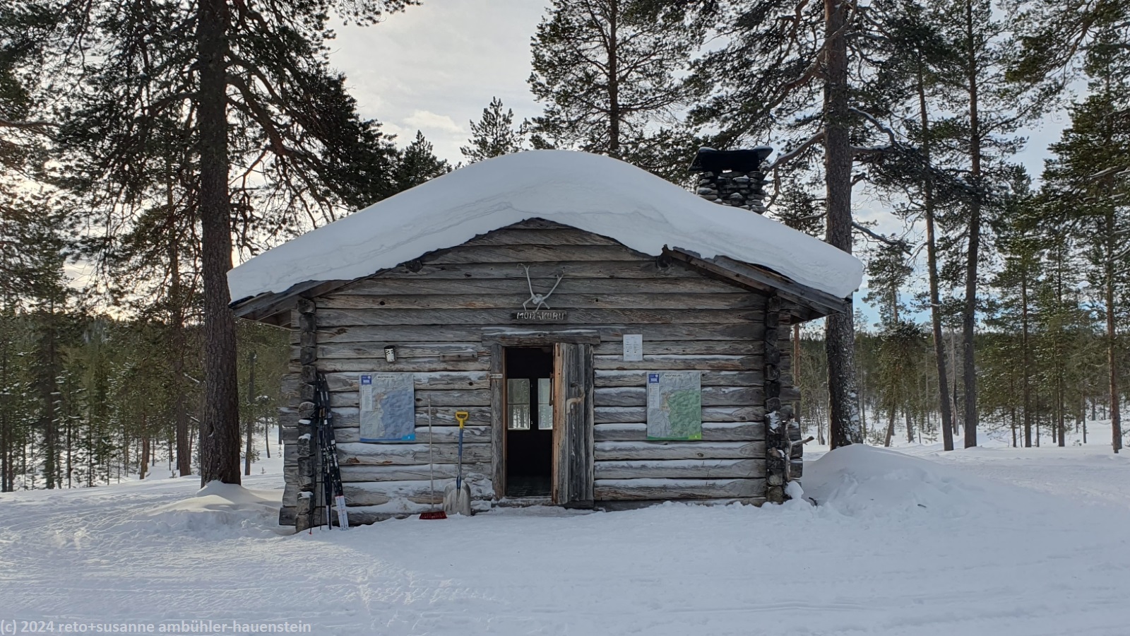 als wir kurz nach 08:30 uhr aufstehen ist das wetter deutlich sonniger als vorhergesagt. nach dem frühstück laufen wir erst bis zum service center, damit susanne ihre laufschuhe tauschen kann. danach folgen wir ein stück dem lutto und biegen dann nordwärts ab. nach der palopää kåta beginnt der aufstieg zum gleichnamigen berg. bis zur waldgrenze laufen wir durch einen traumhaft schönen, tief verschneiten winterwald. nach einer sportlichen abfahrt erreichen wir kurz nach mittag die tageshütte moitakuru. susanne entfacht im offenen kamin ein wärmendes feuer, danach verzehren wir unsere brote. an einer riesigen huskyfarm vorbei gelangen wir wieder in das tal des lutto. diesem folgen wir zurück bis ins dorf. im ski kahvila erfrischen wir uns mit kaffee und einem schokoriegel. zurück im haus geniessen wir erst zwei sitzungen in der sauna und dann das abendessen. danach verbringen wir einen gemütlichen abend in unserer stube.