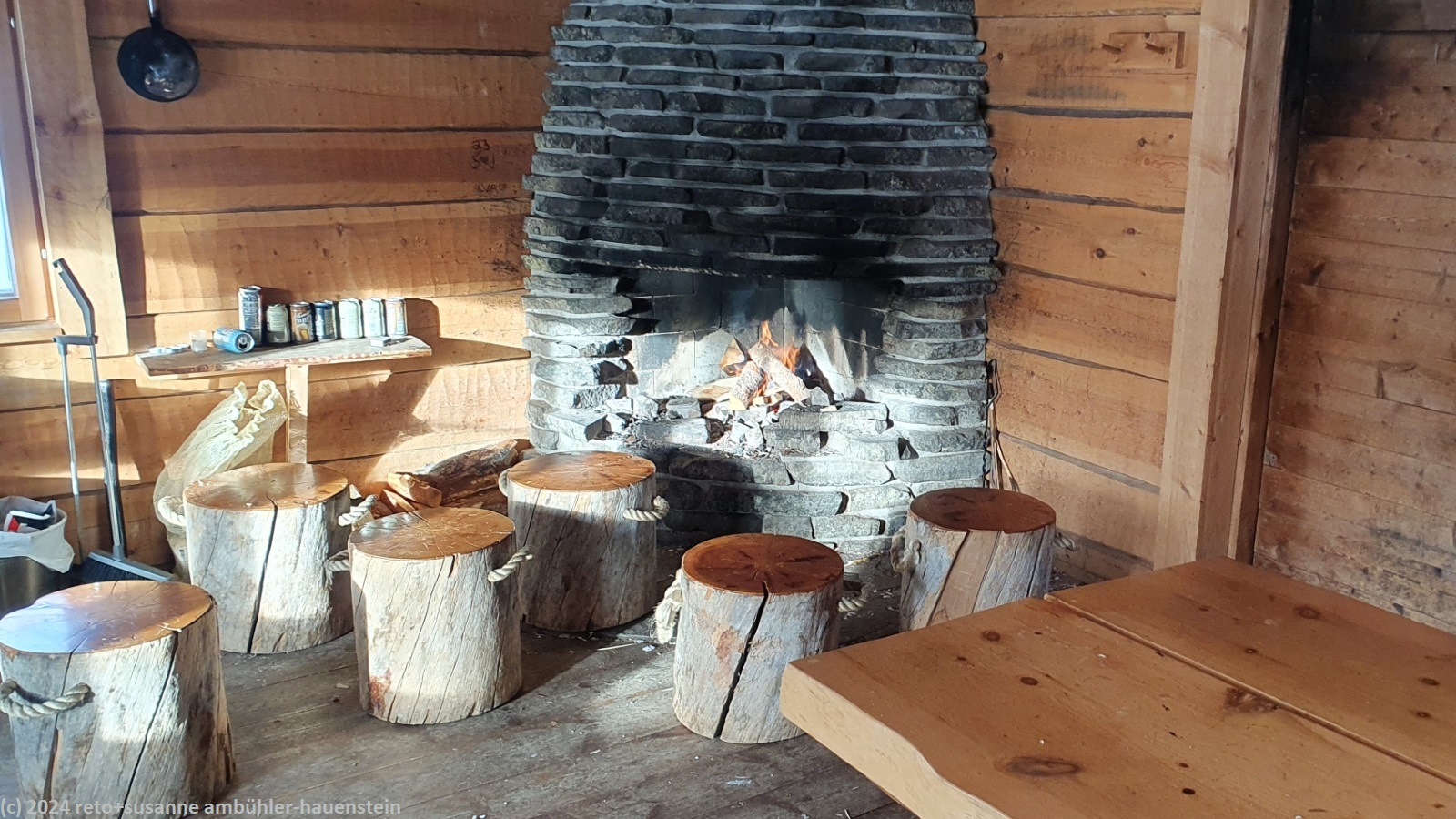 auf der karte ist diese hütte als cafe eingezeichnet, aber hier gibt es keinen kaffee. die wunderschöne hütte ist bei unserer ankunft leer. susanne entfacht ein wärmendes feuer im offenen kamin. wir setzen uns davor und essen unsere brote. während wir das tun, treffen immer mehr leute ein. die meisten bleiben aber nur kurz.