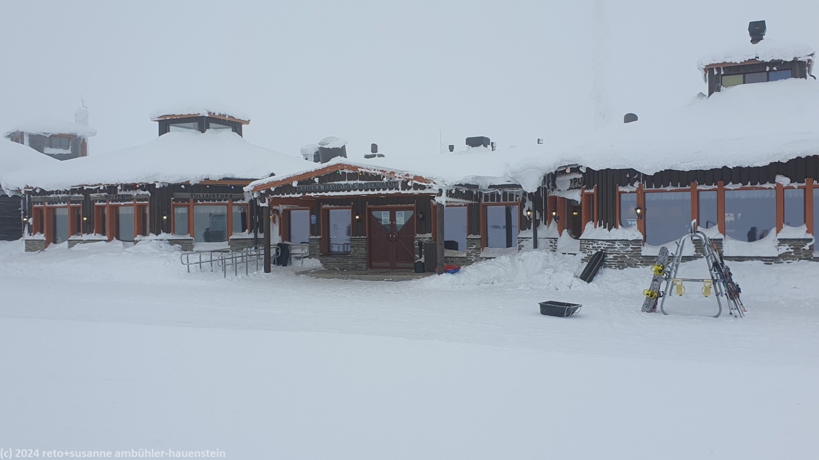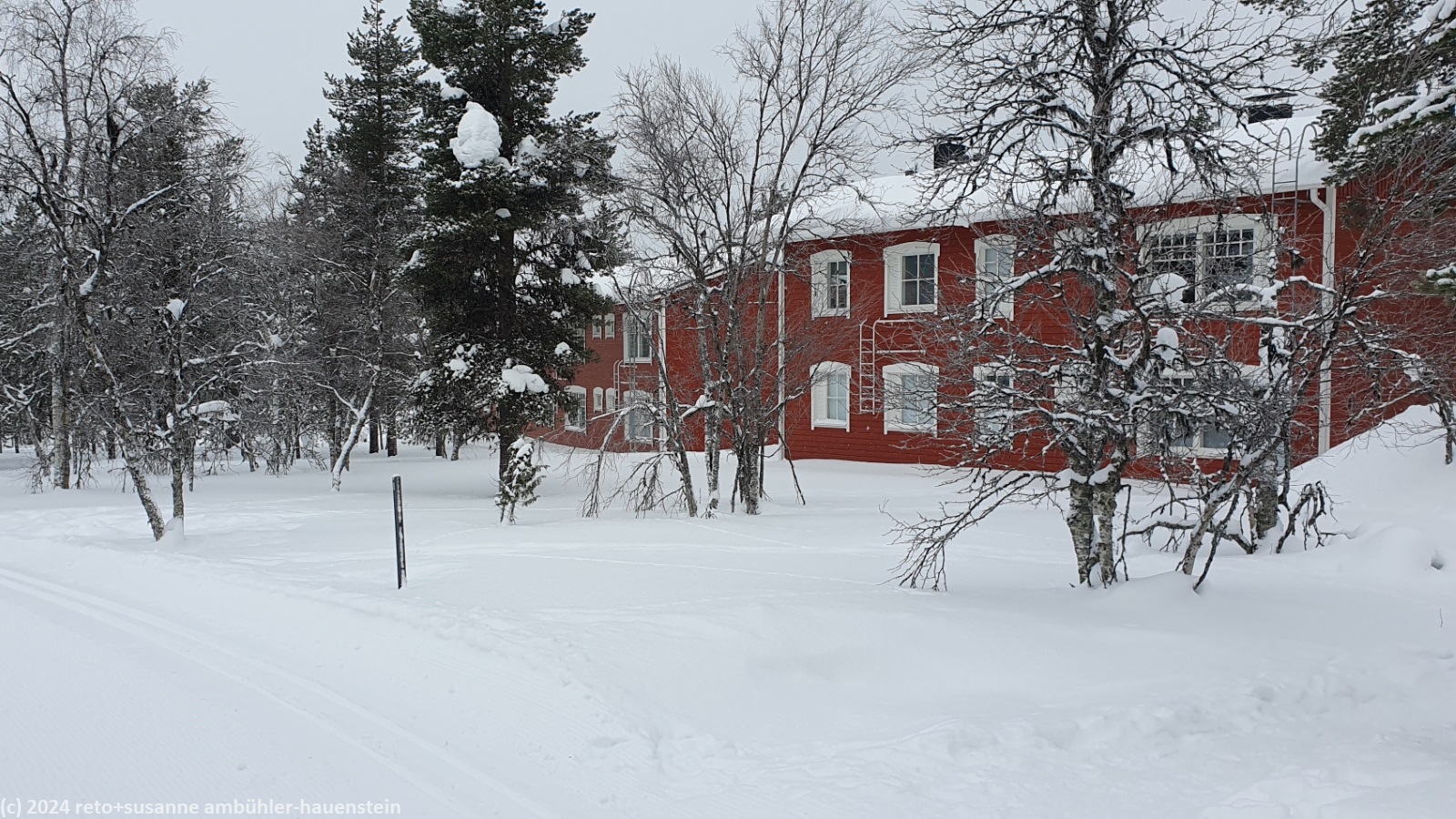 wir verzehren unsere brote. die temperatur in der kåta ist so, dass wir für einmal nicht völlig durchfroren aufbrechen müssen. den rückweg durch das tal des lutto kennen wir bereits. kurz nach 14 uhr sind wir beim service center bei den talstationen der bahnen. im restaurant neben dem skiverleih trinken wir einen kaffee und geniessen dazu eine zimtschnecke. eine stunde später nehmen wir die letzten meter unter die latten. um 15:30 uhr sind wir wieder in unserem haus.