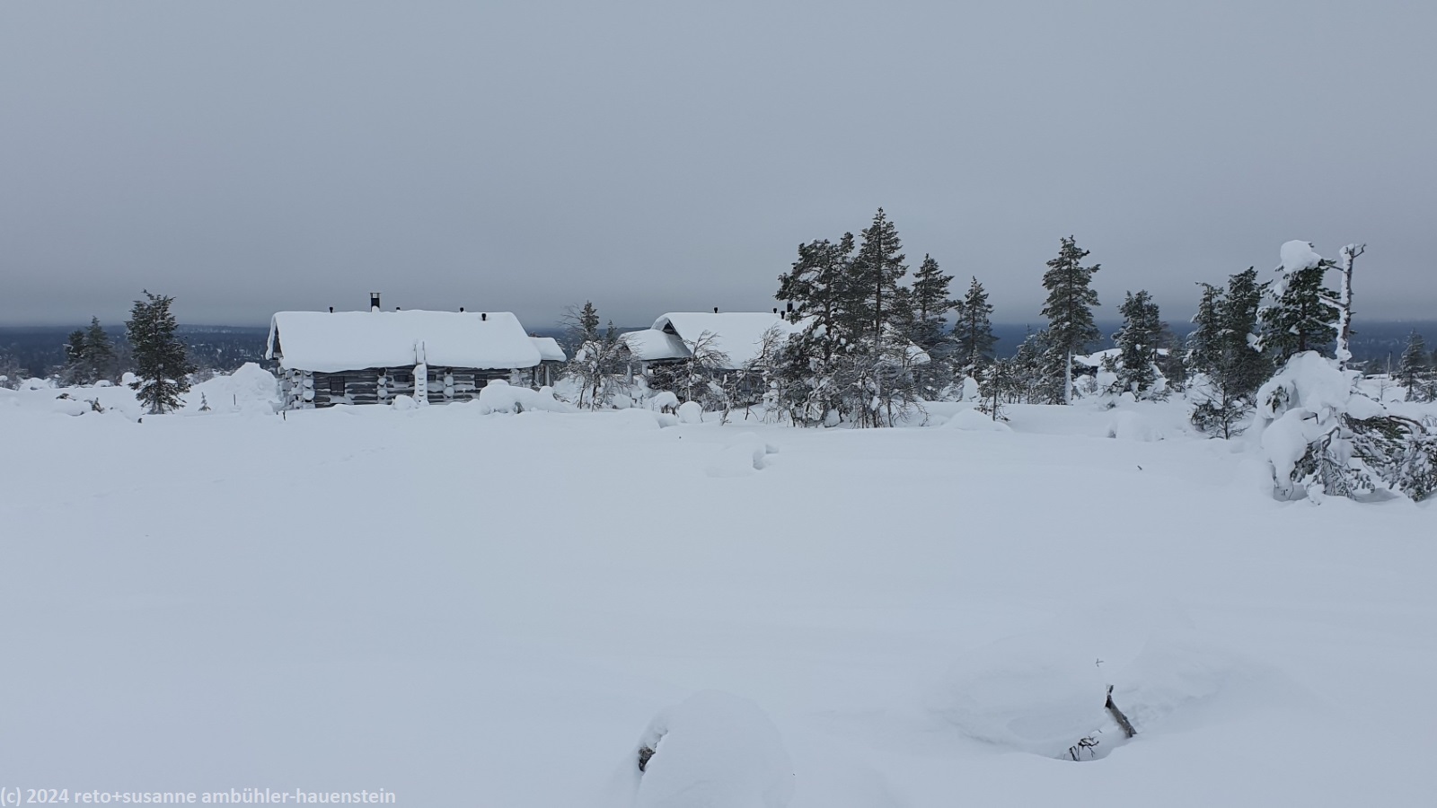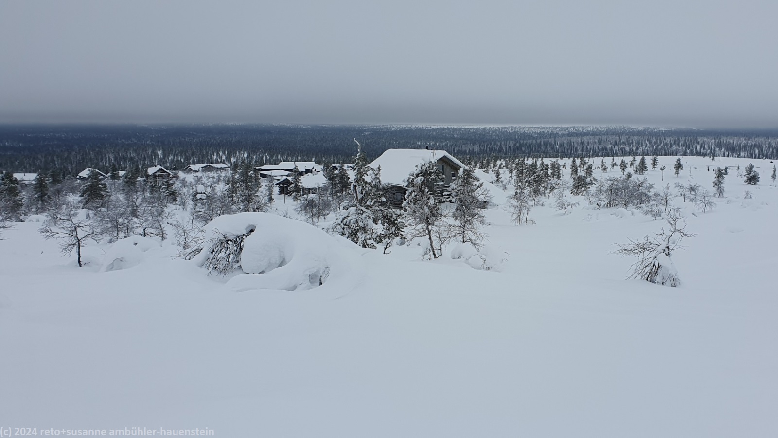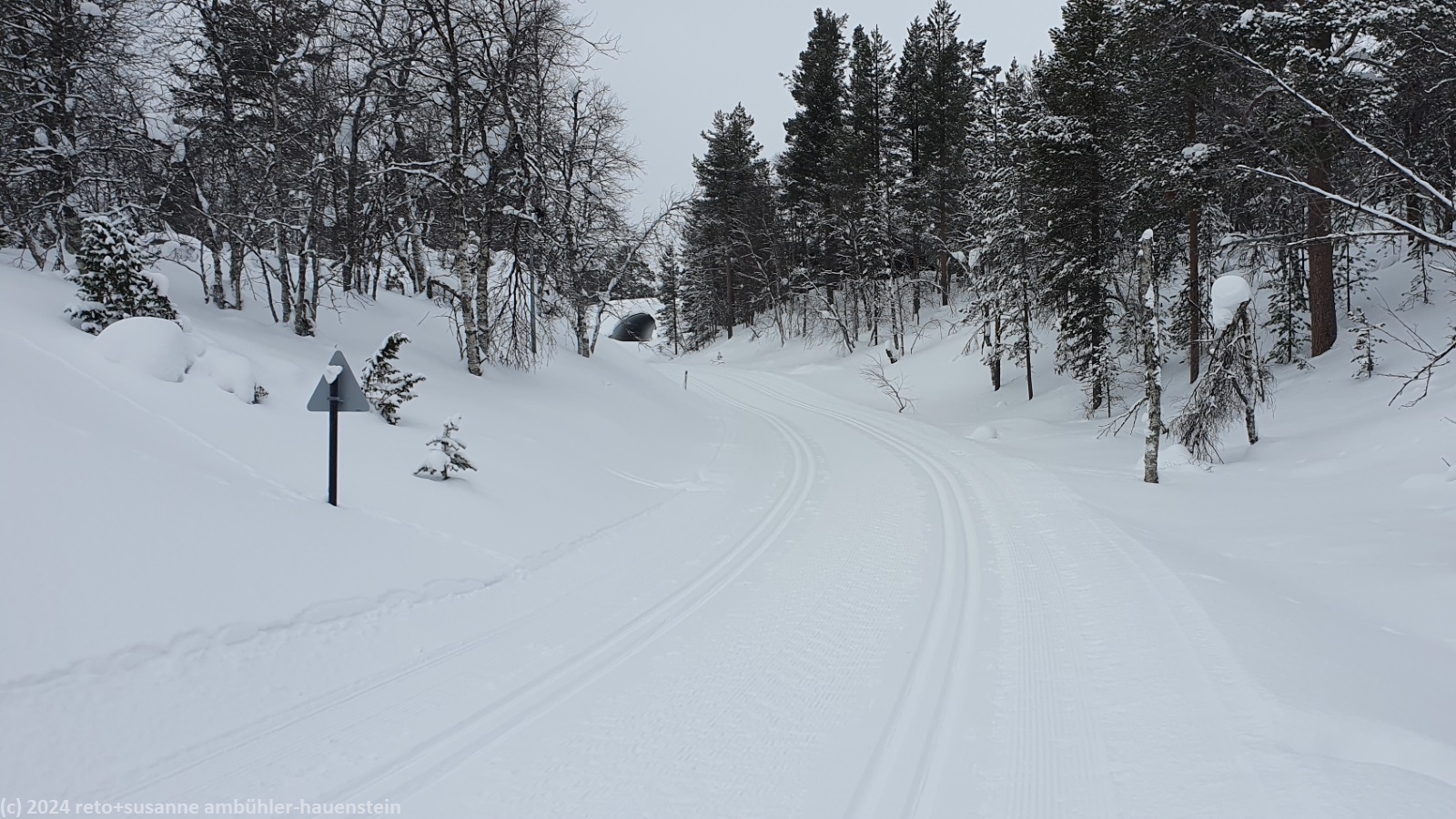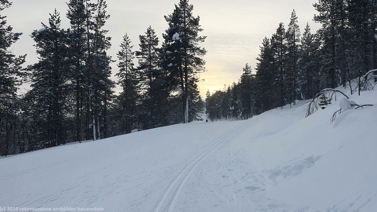 auch heute stehen wir kurz nach 08:30 uhr auf. der himmel ist bedeckt und im laufe des tages fällt immer wieder etwas schnee. es ist aber mit -6°C nicht mehr so kalt wie auch schon. kurz nach 10 uhr starten wir zu unserem heutigen langlauf. durch unser quartier und auf dem gehsteig laufen wir zum K-Market. schneebedeckte strassen und gehsteige sind in unserer heimat ein absolutes no-go, aber hier ist es selbstverständlich. nachdem wir unseren einkauf getätigt haben, geht es mitten durch den ort - natürlich auf einer langlaufloipe, wir sind ja in finnland. nachdem wir die zufahrtstrasse zum skigebiet überquert haben, beginnt der aufstieg zum kaunispää. in weiten kurven überwinden wir auf etwas mehr als 3 km 175 höhenmeter. meistens ist die steigung eher sanft, ab und zu gibt es kurze, steilere abschnitte. wir schaffen den aufstieg problemlos und erreichen um 11:30 uhr das restaurant huippu auf dem gipfel.