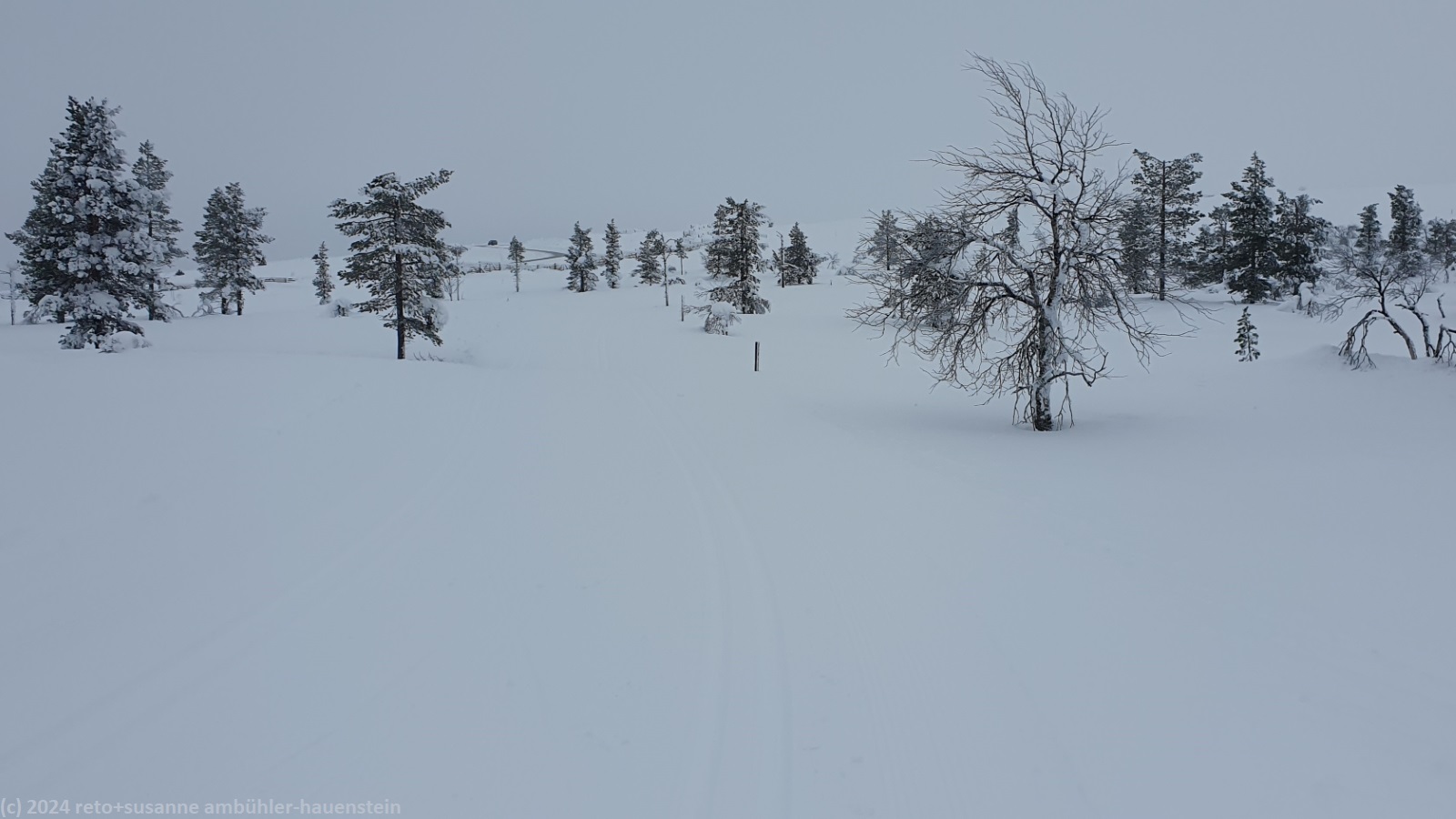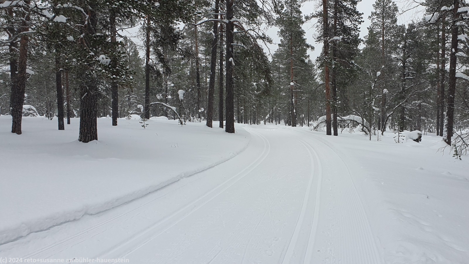 als wir kurz nach 08:30 uhr aufstehen ist der himmel bedeckt, die temperatur liegt bei -6°C und es fällt etwas schnee. nach dem frühstück laufen wir mit unseren skis quer durch den ort um im supermarkt etwas für's mittagessen einzukaufen. ganz in der nähe des ladens beginnt eine loipe, die uns durch das dorf richtung skigebiet führt. wir überqueren die zufahrtsstrasse, danach beginnt der aufstieg zum kaunispää. als wir um 11:30 uhr den gipfel erreichen, herrscht dichter nebel. wir erfrischen uns im restaurant huippu mit tee und gebäck, anschliessend gibt es eine sportliche abfahrt zur palopään kåta hinunter. susanne entfacht ein wärmendes feuer. während wir unsere brote essen, erhalten wir gesellschaft von zwei finnischen familien. durch das tal des lutto kehren wir zum ausgangspunkt zurück. im restaurant neben dem skiverleih trinken wir einen kaffee und geniessen dazu eine zimtschnecke. um 15:30 uhr sind wir wieder bei unserer wohnung. nach dem abendessen schnallen wir noch einmal die langlaufskis an. wir möchten einmal bei nacht über eine beleuchtete loipe laufen. nach einer gute stunde sind wir zurück. wir geniessen noch eine sitzung in der sauna. um 23:30 uhr sind wir im bett.