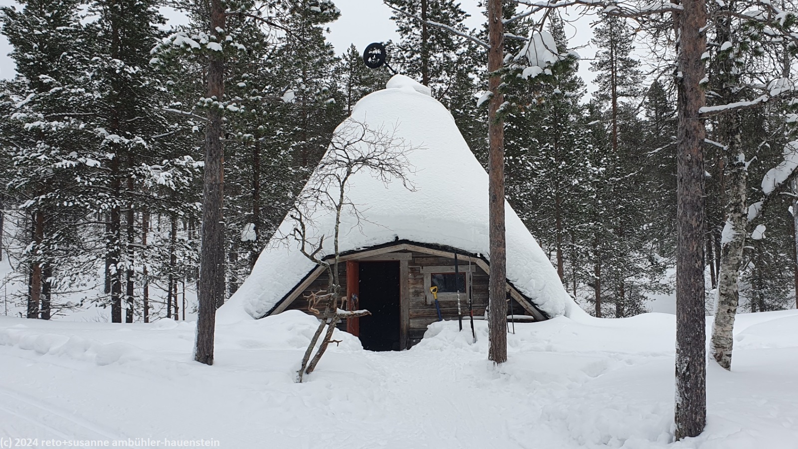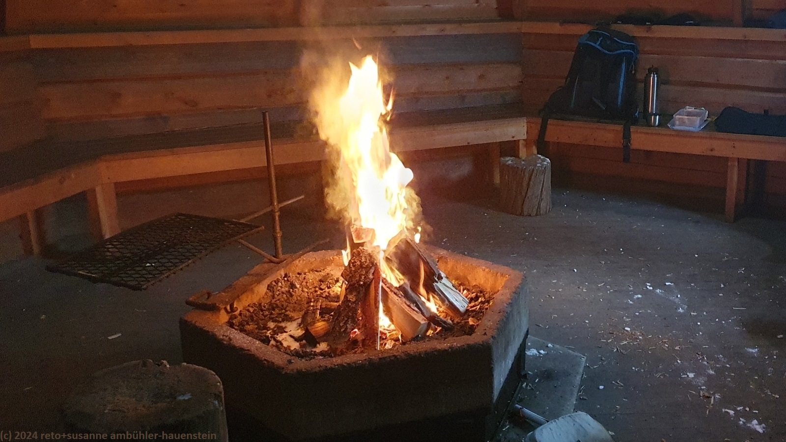 am ende der abfahrt sind es noch 200 meter bis zur palopään kåta. als wir ankommen, ist die schutzhütte leer und es brennt auch kein feuer. susanne ist inzwischen eine meisterin im feuer machen. während sie einfeuert, hole ich im nahen schuppen mehr brennholz. kaum ist es schön warm in der hütte, tauchen zwei weitere familien auf. beide nutzen das feuer, um würste zu grillieren.