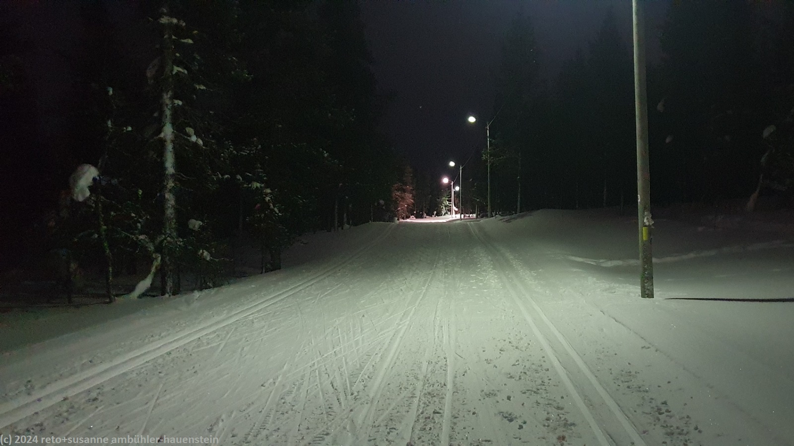 da wir heute abend nochmals auf die loipe möchten, verbringen wir einen ruhigen nachmittag mit lesen, bzw. nachführen der bücher. gegen 18:30 uhr geniessen wir unser abendessen. eine stunde später ziehen wir noch einmal die langlaufkleider an. das thermometer vor unserem fenster zeigt bloss noch -5°C an. tatsächlich fühlt es sich draussen überhaupt nicht kalt an. wir schlagen uns durch den wald zur beleuchteten loipe richtung savottakahvila. das laufen bei kunstlicht ist nicht viel anders als bei tageslicht. einzig der eigene schatten, der einen immer wieder von hinten einholt, ist etwas gewöhnungsbedürftig. wir laufen bis zur verzweigung kurz vor dem cafe, dann wenden wir. auf dem rückweg machen wir einen kleinen abstecher auf einer loipe mit modernerer LED-beleuchtung. ich bin mir nicht sicher, ob auch die lampen auf der anderen loipe mit LEDs ausgerüstet sind. für mich sehen sie eher aus wie stromsparlampen. die ausleuchtung ist jedenfalls ganz anders, viel gestreuter.