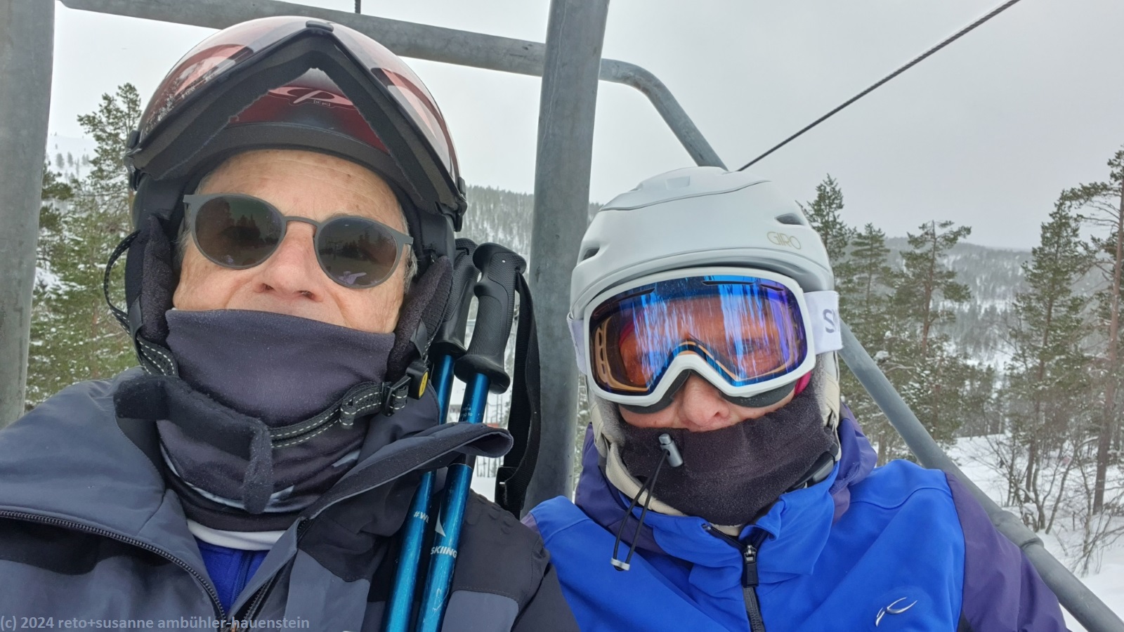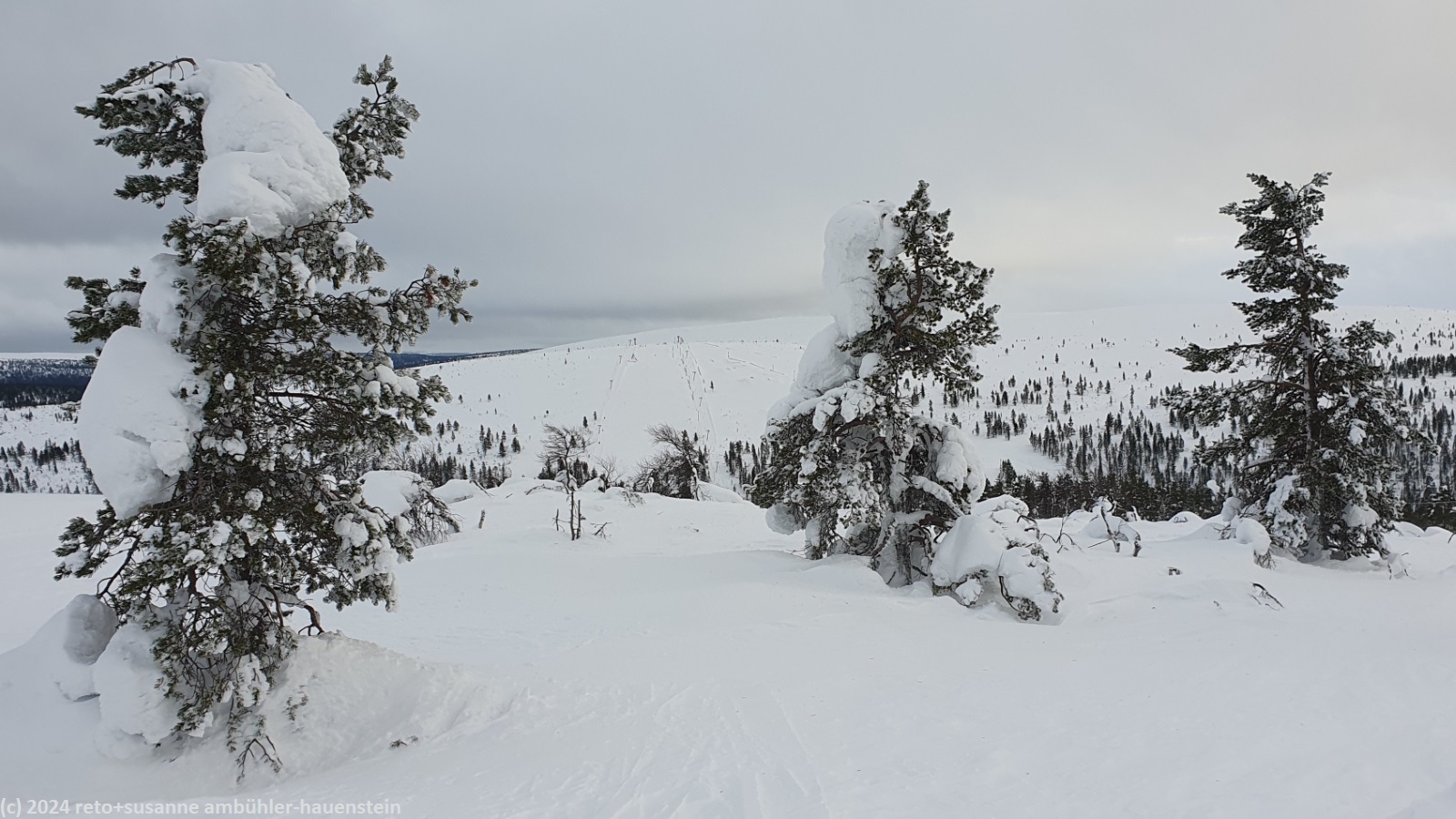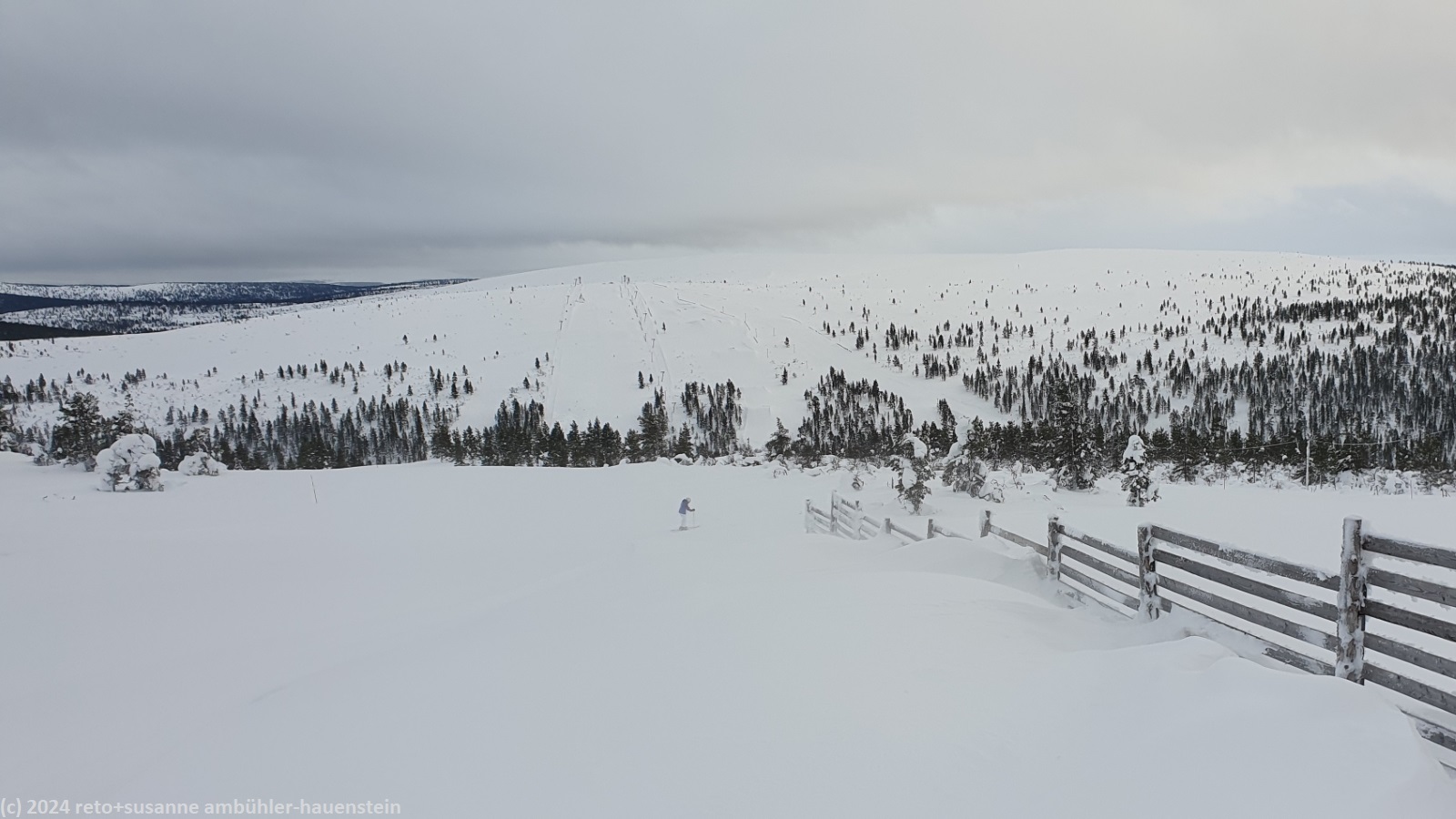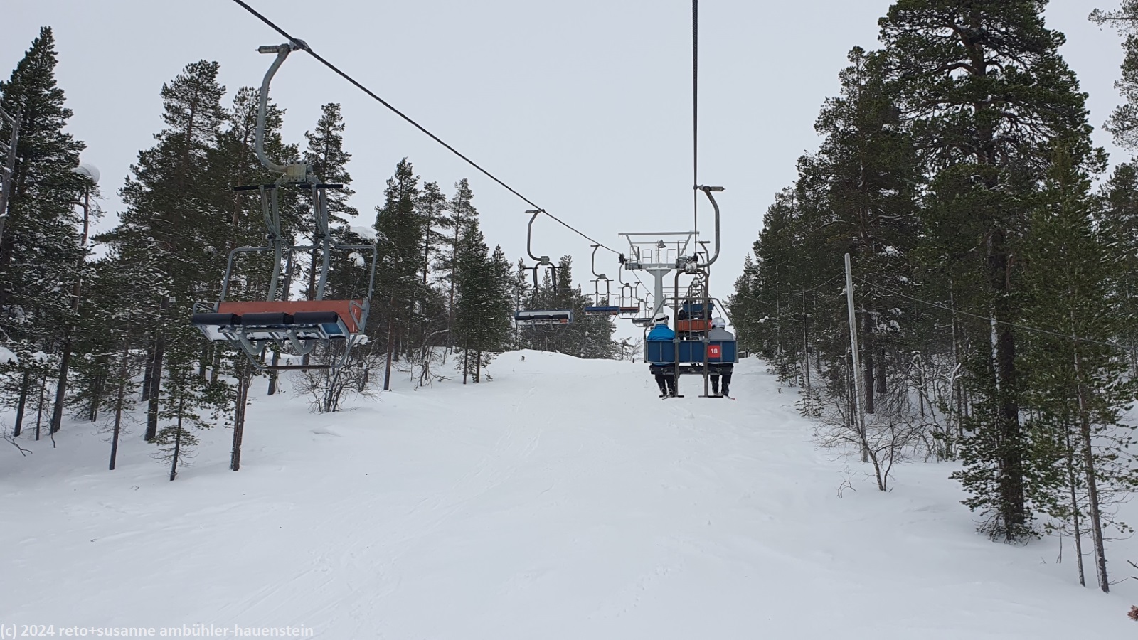 auch heute stehen wir kurz nach 08:30 uhr auf und frühstücken in unserer gemütlichen stube. das wetter ist am morgen ähnlich wie gestern. mit 0°C ist es noch etwas wärmer und der wind bläst ein bisschen kräftiger. kurz nach 10:30 uhr sind wir bei der talstation. wir fahren mit dem sessellift auf den kaunispää und deponieren unseren rucksack im restaurant. dabei entdecken wir im skiständer ein verlassenes paar skistöcke. wir nehmen diese mit als ersatz für das paar, welches susanne gestern am gleichen ort abhanden gekommen ist. der "Kaunispää Skilift" (K6) ist heute leider den ganzen tag nicht in betrieb. das ist unglücklich, weil es zum einen die nicht besonders grosse auswahl an anlagen noch mehr reduziert, zum andern steht auf der kaunispää-seite nur noch der sessellift zur verfügung und der ist schon ein bisschen träge. wir wechseln daher erst einmal auf die iisakkipää-seite. aber auch hier laufen nicht alle lifte. allerdings fällt dies weniger ins gewicht, weil einen die lifte I4 und I5 gerade nebeneinander auf den gipfel bringen. oberhalb der waldgrenze bläst ein garstiger wind, den wir aber bei der talfahrt mehr oder weniger im rücken haben. der schnee ist trotz der höheren temperatur nach wie vor einmalig. um 12:30 uhr fahren wir mit dem sessellift zum restaurant auf dem kaunispää. uns scheint, heute hat es noch etwas weniger leute als gestern. wir finden problemlos einen freien tisch und kaufen zwei sandwiches und etwas zu trinken. später gibt es kaffee und kuchen. um 13:50 uhr brechen wir wieder auf. nun zeigt sich ab und zu die sonne. die wolkenschicht ist so dünn, dass man die sonne auch sehen kann, wenn die sicht nicht frei ist. wir fahren wiederum auf beiden talseiten. nach zwei stunden beenden wir das abenteuer.