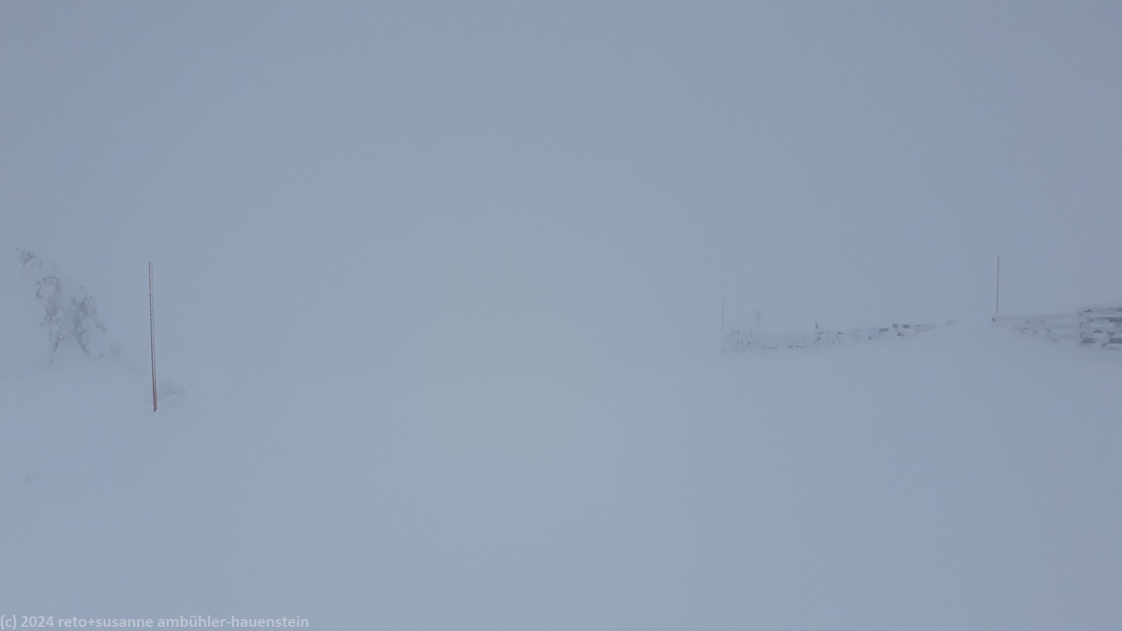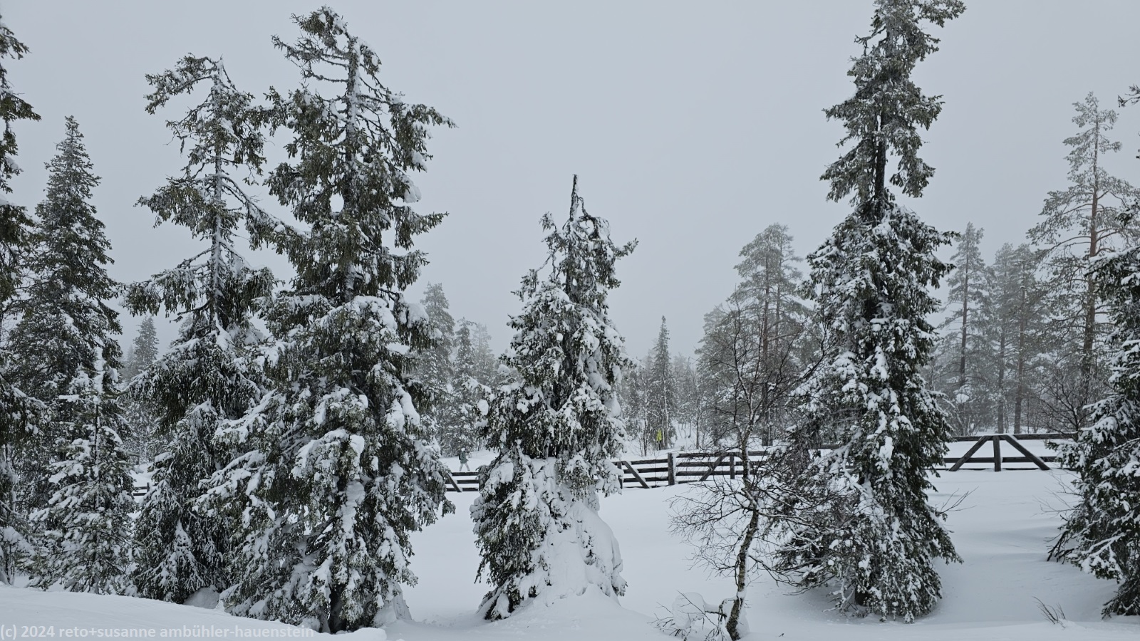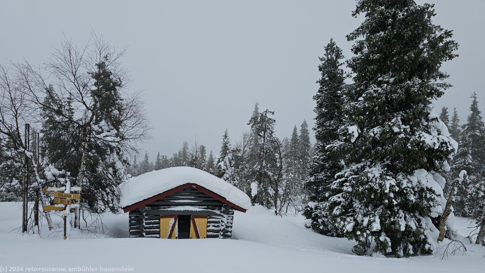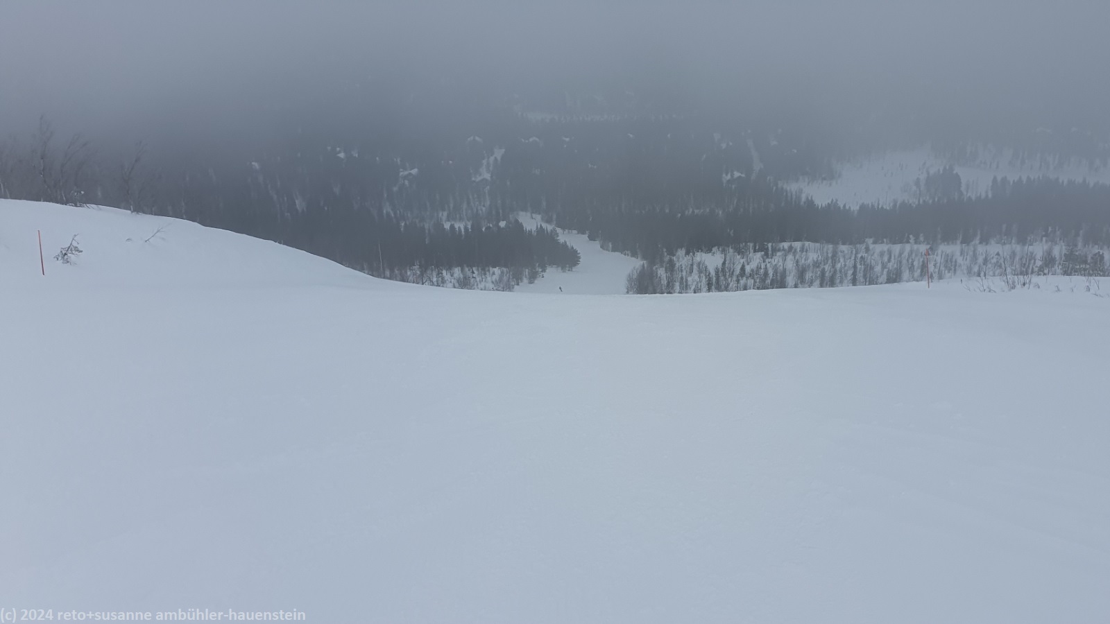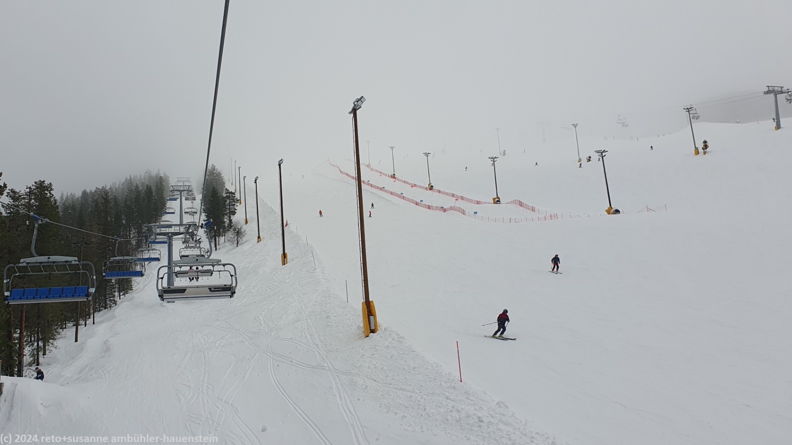 auch am letzten ferientag stehen wir um 08:30 uhr auf und frühstücken in unserer gemütlichen stube. die temperatur liegt heute eher über dem gefrierpunkt, die wolkendecke bleibt den ganzen tag kompakt. sie liegt noch tiefer als in den vergangenen tagen. wir starten auch heute am "zero point" und fahren mit dem sessellift "north" hoch. von da geht es direkt zur talstation des "glacier express" und weiter mit dem skilift "rakka" (4). oben auf dem berg ist die sicht annähernd bei null. wir haben mühe, vom einen pfosten zum nächsten zu sehen. prompt erwische ich bei der zweiten abfahrt die falsche piste und so machen wir eine zusatzschleife. nach der bergfahrt mit dem skilift "taalo" (6) geht es weiter richtung talstation des skilift "utsuvaara" (7). in der fantastisch schönen winterlandschaft steht eine kleine schutzhütte, bei dieser haben wir im vergangenen sommer unseren picknickhalt gemacht, siehe tagebuch vom 13-sep-2023. auf dieser piste hat es etwas mehr leute als auf den pisten im nordosten, aber auch hier gibt es keine wartezeiten. auf wunsch meiner frau fahren wir mit dem tellerlift auf den kleinen hügel im süden und nehmen dann die abfahrt richtung "pysäköintialue". diese ist erstaunlich lang, aber eher flach. mit dem skilift "sammu" (7B) fahren wir wieder hoch und nehmen dann den skilift "utsuvaara" (7) um auf den gipfel zu gelangen. es ist schon fast 12:45 uhr. wir folgen deshalb der grünen verbindungspiste richtung "zero point". wie schon gestern geniessen wir das mittagessen in unserem appartement. um 14:30 uhr sind wir wieder auf den skier. von der bergstation des "glacier express" fahren wir zu den talstationen der beiden skilifte "vesirikka-autto" (13) und "tunneli" (14). mit ersterem geht es hoch richtung "alpine training park". wir fahren zweimal die schwarze piste 13.3 hinunter. diese ist im unteren bereich recht steil, das ist toll. nach den beiden abfahrten geht es mit dem "tunneli" (14) wieder hoch auf den grat und weiter hinunter zum skilift "jäkälälaki" (5). plötzlich gibt es aus den wolken niederschlag. da die temperatur weiterhin über dem nullpunkt liegt, bilden sich auf unseren brillen kleine wassertropfen. dies behindert die sicht enorm. trotzdem fahren wir erst mit dem "taalo" (6) nochmals hoch und hinunter richtung "south point". heute nehmen wir aber schon bei der ersten abfahrt den skilift "aurinko" (9) um weiter richtung "west point" zu fahren. mit dem sessellift "tieva" (10) geht es noch einmal auf den berg. da es bereits nach 16 uhr ist und das wetter keine besserung zeigt, beschliessen wir, direkt zum "zero point" hinunter zu fahren. kurz vor 16:20 uhr endet das abenteuer skifahren in levi für dieses jahr.