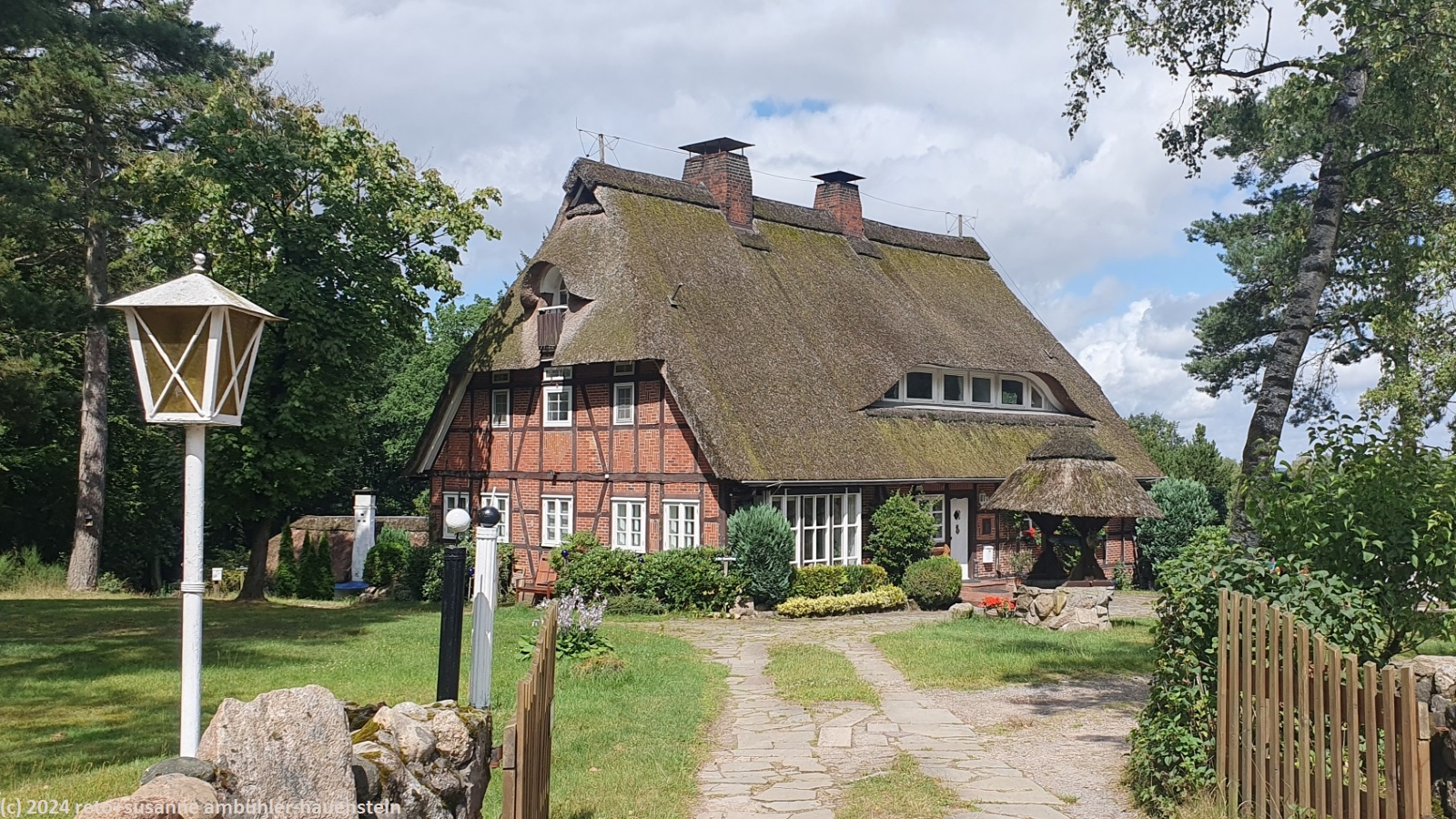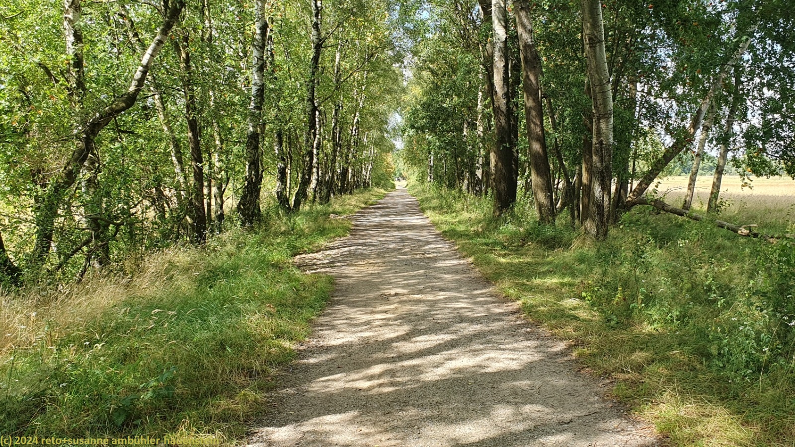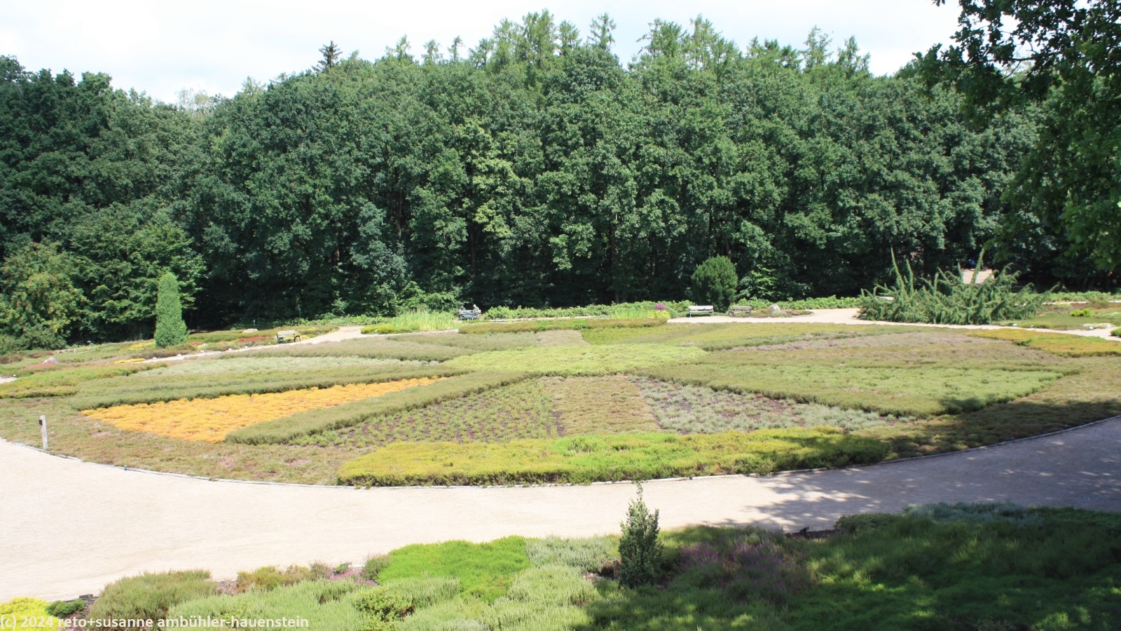 die nacht ist sehr ruhig. es regnet zumindest einmal ziemlich heftig. wir schlafen gut. als wir um 08:30 uhr aufstehen, fällt leichter nieselregen. wir gehen zu fuss zum bauernhof auf der anderen strassenseite und kaufen heidelbeeren für's frühstück. auf dem rückweg nehmen wir die bestellten brötchen mit. essen müssen wir im auto, denn der nieselregen hat sich ziemlich verstärkt. gegen 10:45 uhr fahren wir ins nahe schneverdingen und kaufen lebensmittel für die nächsten beiden tage ein. der regen hat inzwischen aufgehört. die kompakte wolkenschicht beginnt sich etwas aufzulockern, wir sehen winzig kleine blaue flecken am himmel. auf der suche nach dem parkplatz beim ausgangsort unserer heutigen wanderung fahren wir durch ein nettes einfamilienhaus-quartier. schliesslich werden wir beim heidegarten fündig und parkieren unseren wagen im schatten der bäume.