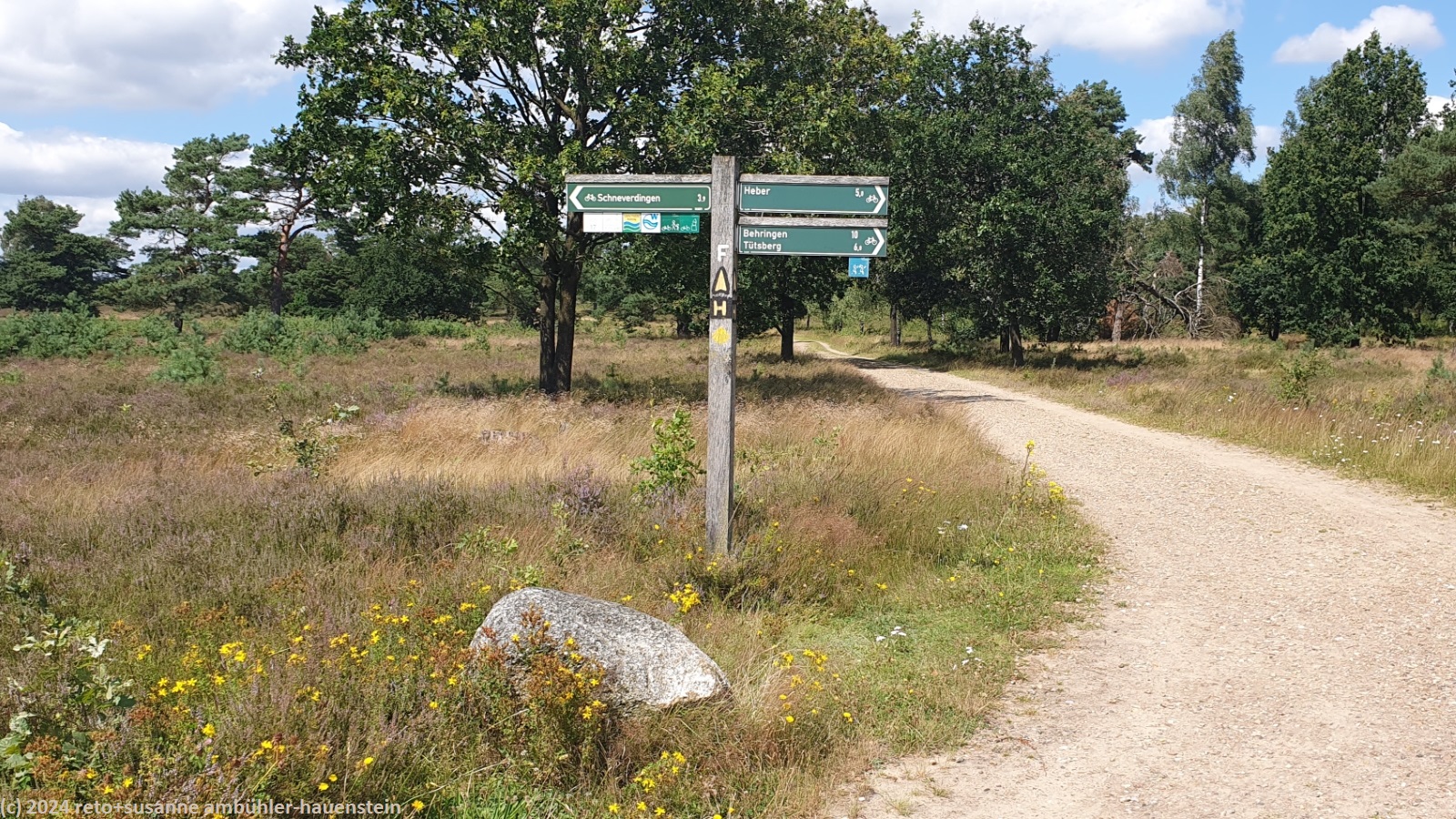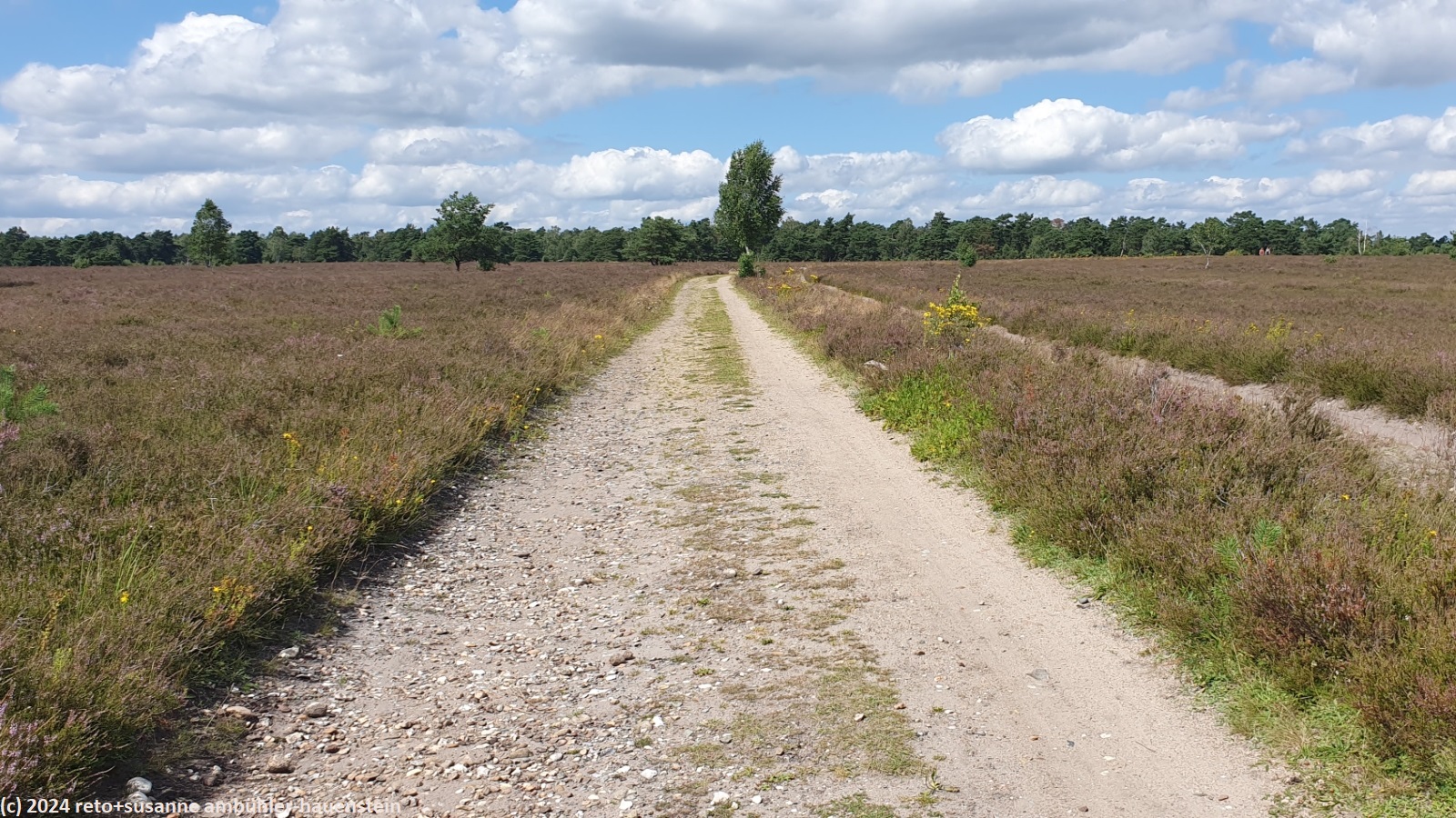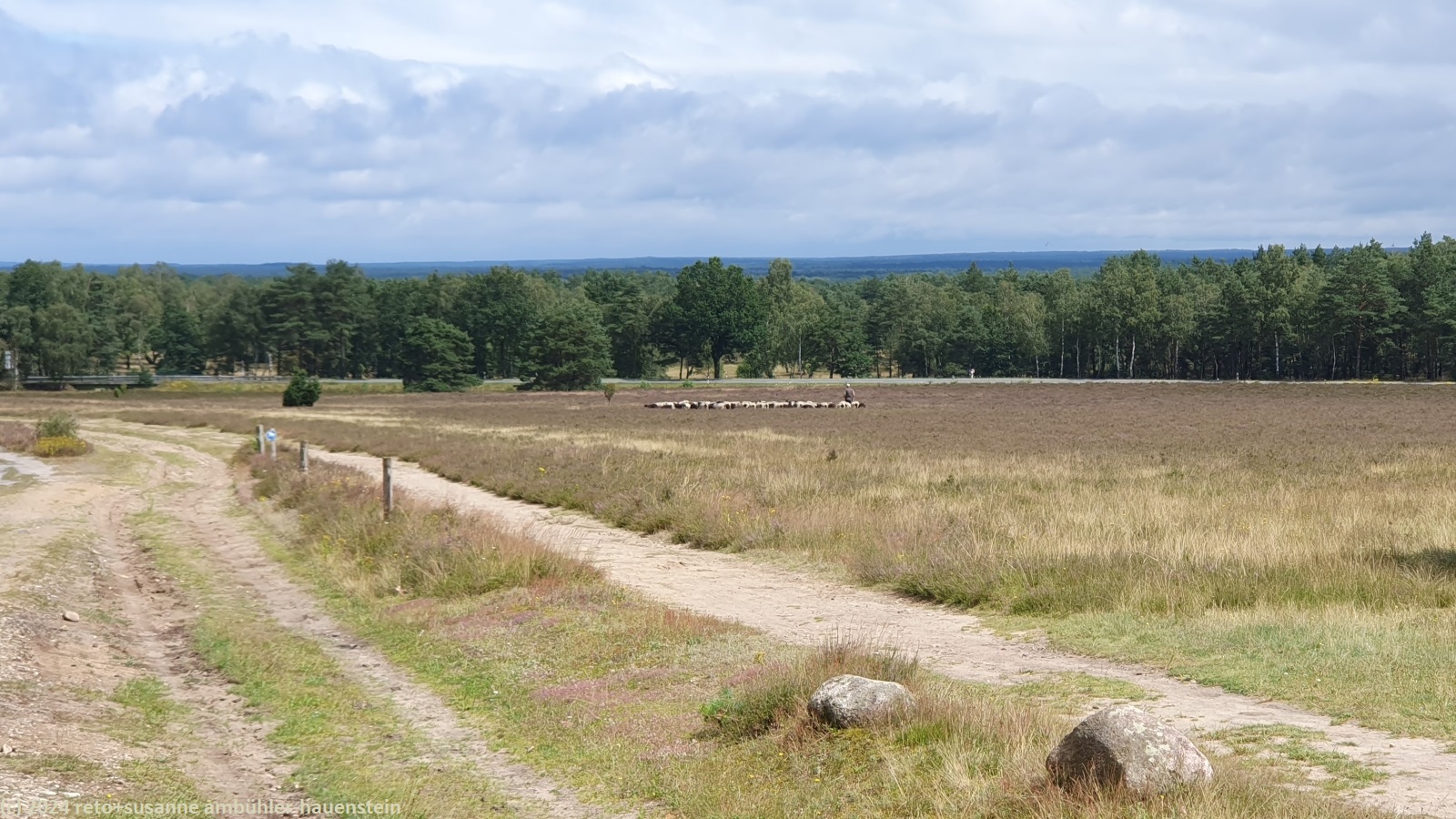 wir folgen den verschiedenen wanderwegen und kommen dabei erst an der freilichtbühne höpen und dann am sehr schönen haus mit dem atelier de bruycker vorbei. in der nähe sehen wir einen schäfer mit seiner herde. als einige schafe die richtung ändern, sorgt der fleissige hund dafür, dass sich die herde wieder vereint. wir überqueren erst die landstrasse L171 und folgen dann ein kurzes stück dem wanderweg richtung winterhof. nach einigen hundert metern erreichen wir die unterführung, durch welche wir auf die andere seite der bahnlinie gelangen. wenig später sind wir im naturschutzgebiet lüneburger heide. das wetter wird zusehends freundlicher mit längeren sonnigen abschnitten. wir wandern durch eine flache, aber sehr schöne landschaft. neben dem wanderweg hat es eine spur für pferdewagen. uns scheint, dass sich der wald immer mehr ausdehnt. in manchen heideflächen wachsen kleine nadelbäume. es gibt aber auch bereiche ohne solche bäumchen. wir vermuten, es hängt von der beschaffenheit des bodens ab, ob bäume wachsen können oder nicht. wir folgen einem wanderwegs südwärts bis zur alten landstrasse. dort führt ein pfad neben der strasse westwärts. nach etwas mehr als einem kilometer schwenken wir wieder richtung süden und erreichen gegen 13:30 uhr den kleinen sylvestersee. bis hier waren wir ziemlich alleine unterwegs, aber als wir uns auf eine der bänke am ufer setzen, erhalten wir bald gesellschaft. trotzdem sind wir erstaunt, wie wenig leute hier unterwegs sind. wir geniessen unsere brote.