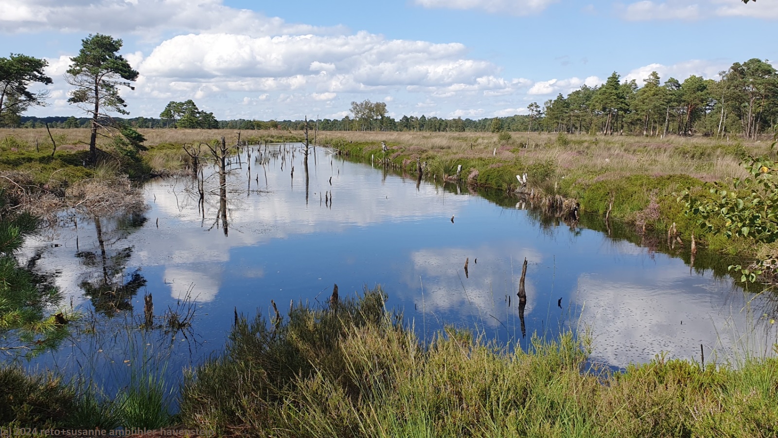 obwohl es in der nacht kräftig regnet schlafen wir bestens. wir stehen um 08:30 uhr auf und kaufen beim bauernhof auf der anderen strassenseite heidelbeeren für's frühstück. gegen 10:45 uhr fahren wir nach schneverdingen, wo wir erst einkaufen gehen und dann unseren wagen beim heidegarten parkieren. wir wandern durch einen schönen wald bis zum stattlichen haus des atelier de bruycker. ganz in der nähe sehen wir einen hirten mit seiner schafherde. wir überqueren erst die landstrasse L171 und gelangen wenig später durch eine bahnunterfühung in das naturschutzgebiet lüneburger heide. über offenes heideland wandern wir bis zum sylvestersee, wo wir auf einer sitzbank zu mittag essen. über breite wanderwege erreichen wir um 15:15 uhr den schäferhof. auf dessen gartenterrasse geniessen wir kaffee und kuchen. bevor wir den rückweg zum heidegarten unter die füsse nehmen, wandern wir über den pietzmoor moorrundweg. dieser führt uns durch eine wunderschöne moorlandschaft. von schneverdingen fahren wir zurück zum campingplatz. das nachtessen können wir bei sonnenschein im freien geniessen. nach einem gemütlichen abend schlüpfen wir noch vor 23 uhr unter die bettdecke.