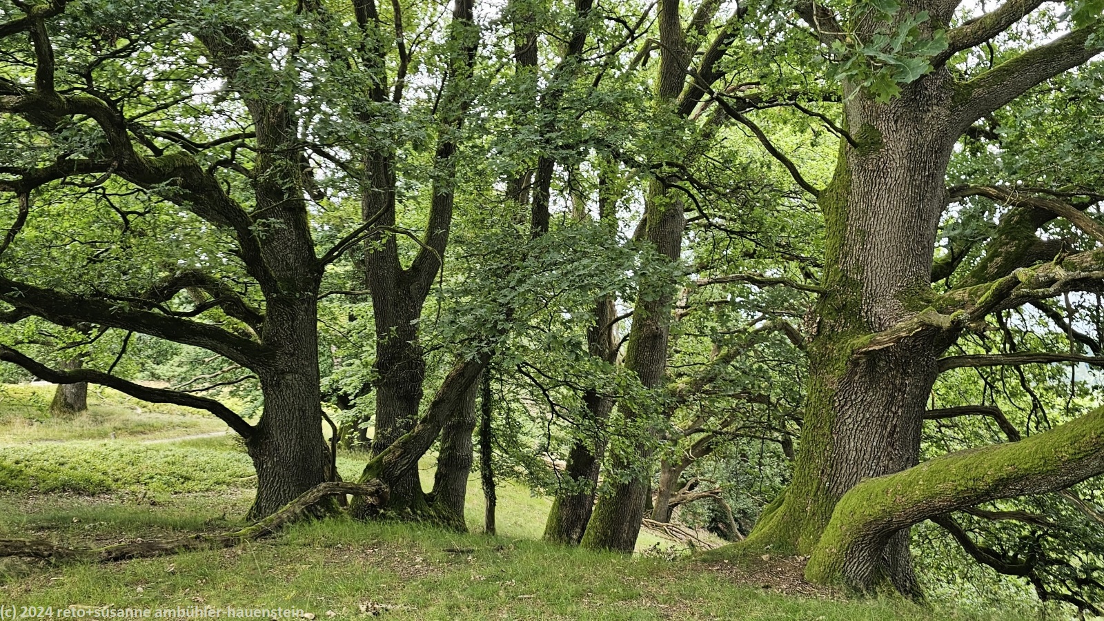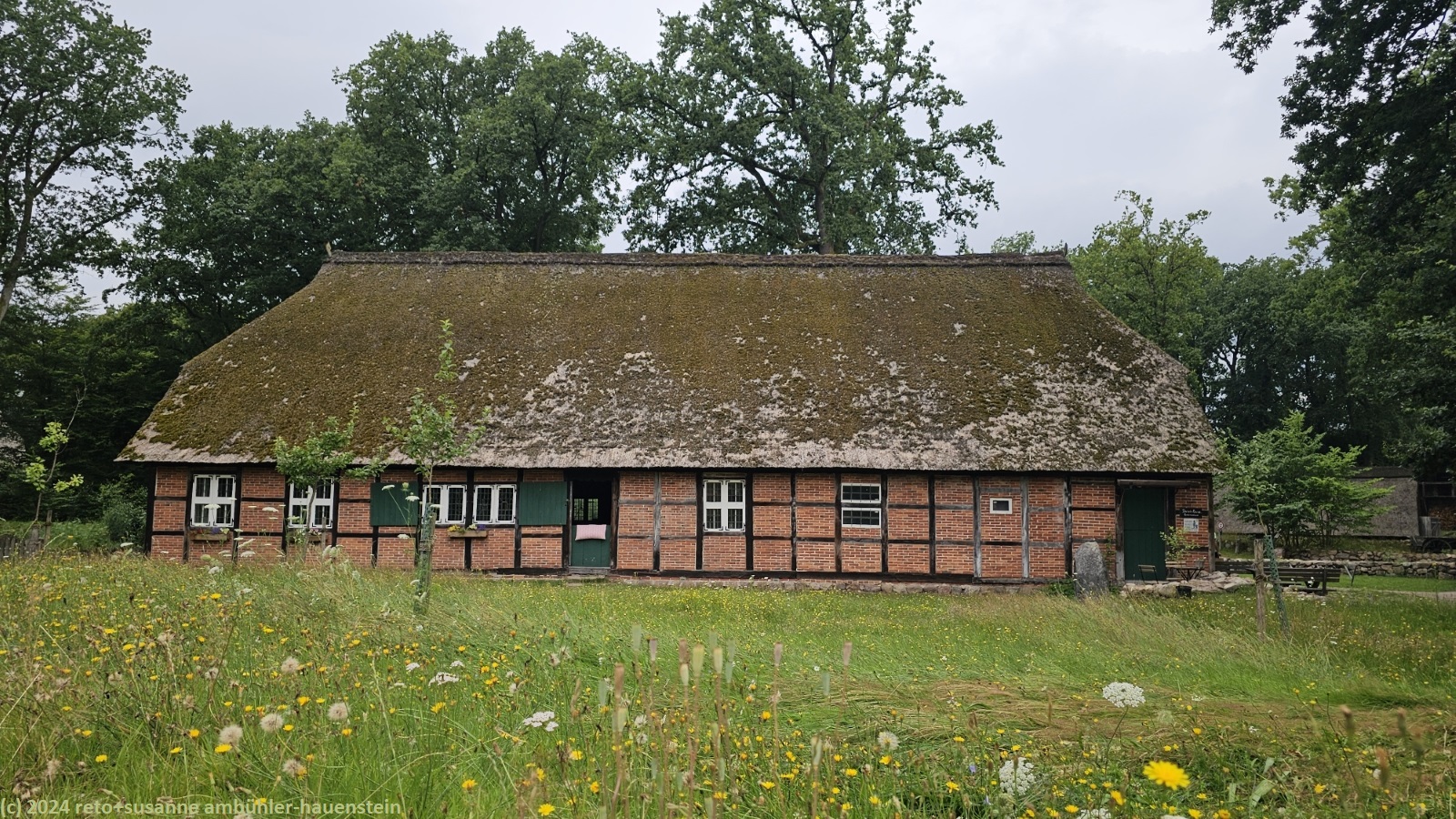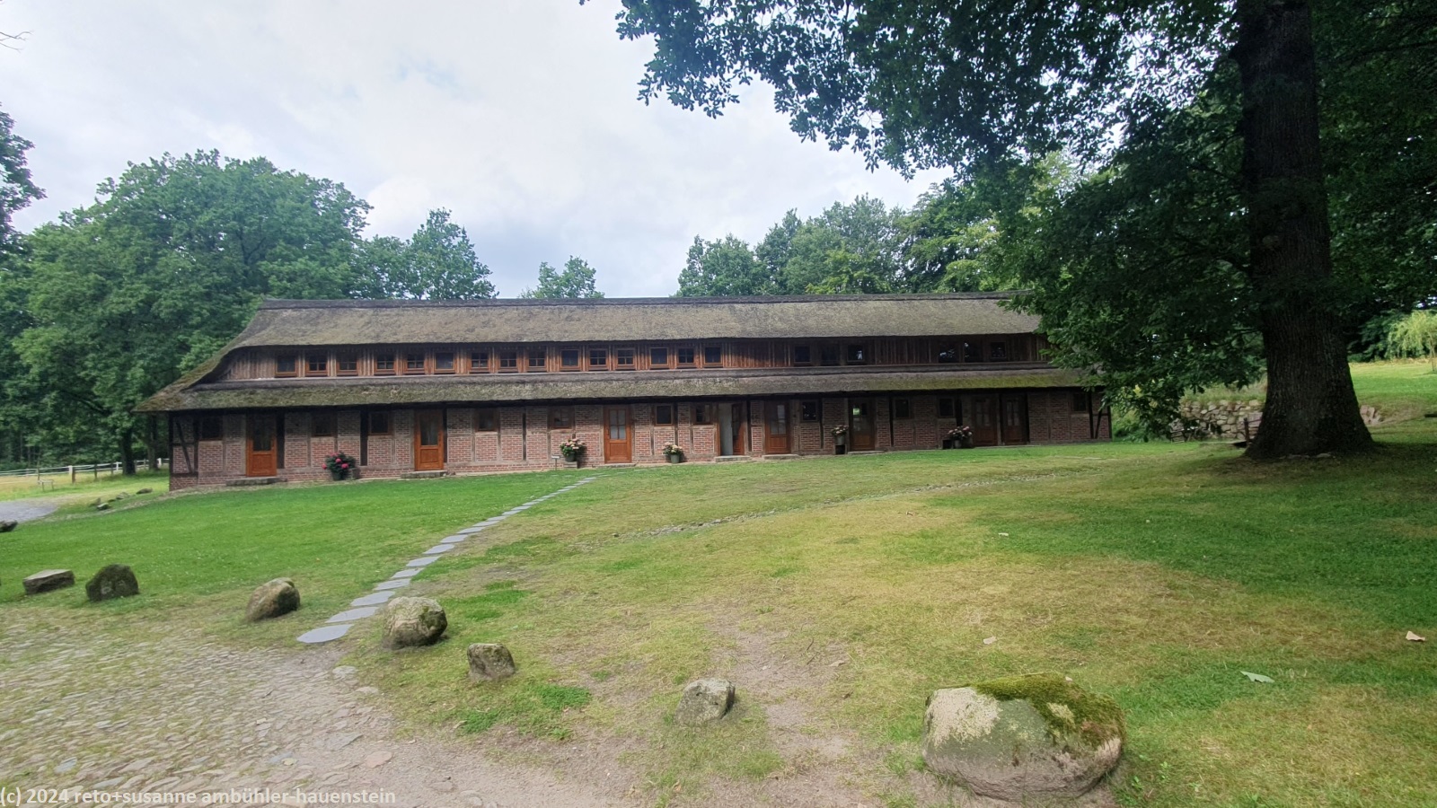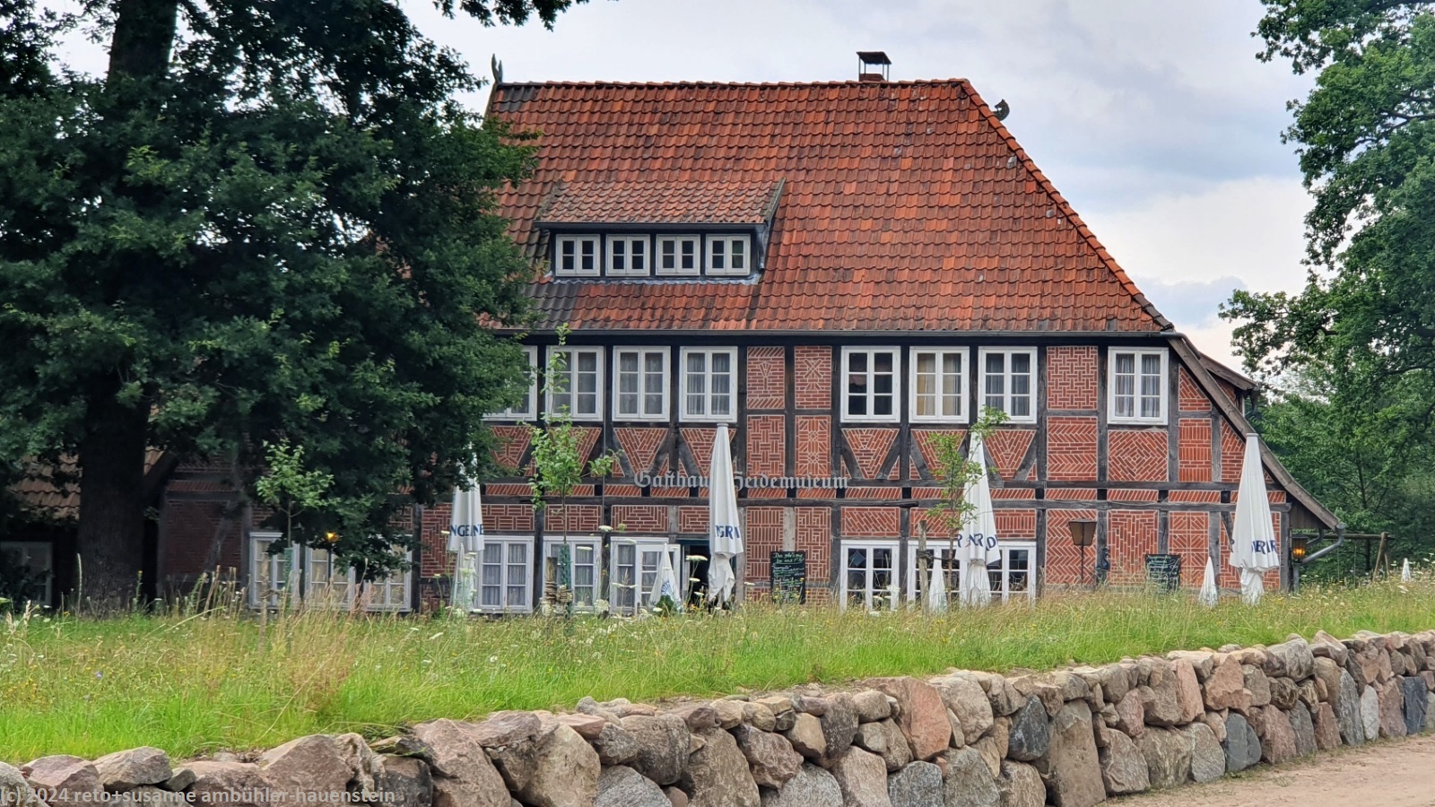als wir um 08:30 uhr aufstehen ist es bewölkt, nur im westen ist der himmel blau. während wir im freien frühstücken, ziehen die wolken ostwärts und schon bald wird es sonnig. um 10:15 uhr machen wir uns auf den weg nach oberhaverbeck, dem ausgangspunkt unserer heutigen rundwanderung. wir finden einen schattigen parkplatz sowie eine karte mit verschiedenen wanderwegen. wir wandern erst durch den ort und bewundern die zahlreichen fachwerkhäuser. manche höfe wurden in hotels umgebaut. die nebengebäude bieten unterschiedliche unterkünfte und gruppenräume für verschiedene aktivitäten an. ausgangs dorf folgen wir einem weg durch eine graslandschaft. hier am rande des naturparkes wird noch landwirtschaft betrieben. bei niederhaverbeck wären wir beinahe der falschen strasse gefolgt, dank des navi bemerken wir den irrtum nach wenigen metern. nun folgen wir dem pfad richtung wilseder berg. die landschaft ist etwas hügliger als gestern und es hat auch mehr bäume. inzwischen sind wieder wolken aufgezogen, die temperatur ist daher sehr angenehm. kurz vor mittag stehen wir auf dem 169.2 meter hohen "berg". der "gipfel" ist kaum zu erkennen. wäre da nicht der markante stein, wir wüssten nicht genau, wo der höchste punkt ist. nun geht es ostwärts richtung wilsede. der pfad senkt sich ganz leicht. kurz vor dem ort picknicken wir auf einer bank mit blick auf ein schönes heidefeld. während wir unsere brote verzehren, beginnt es leicht zu regnen, aber nur für einige minuten.