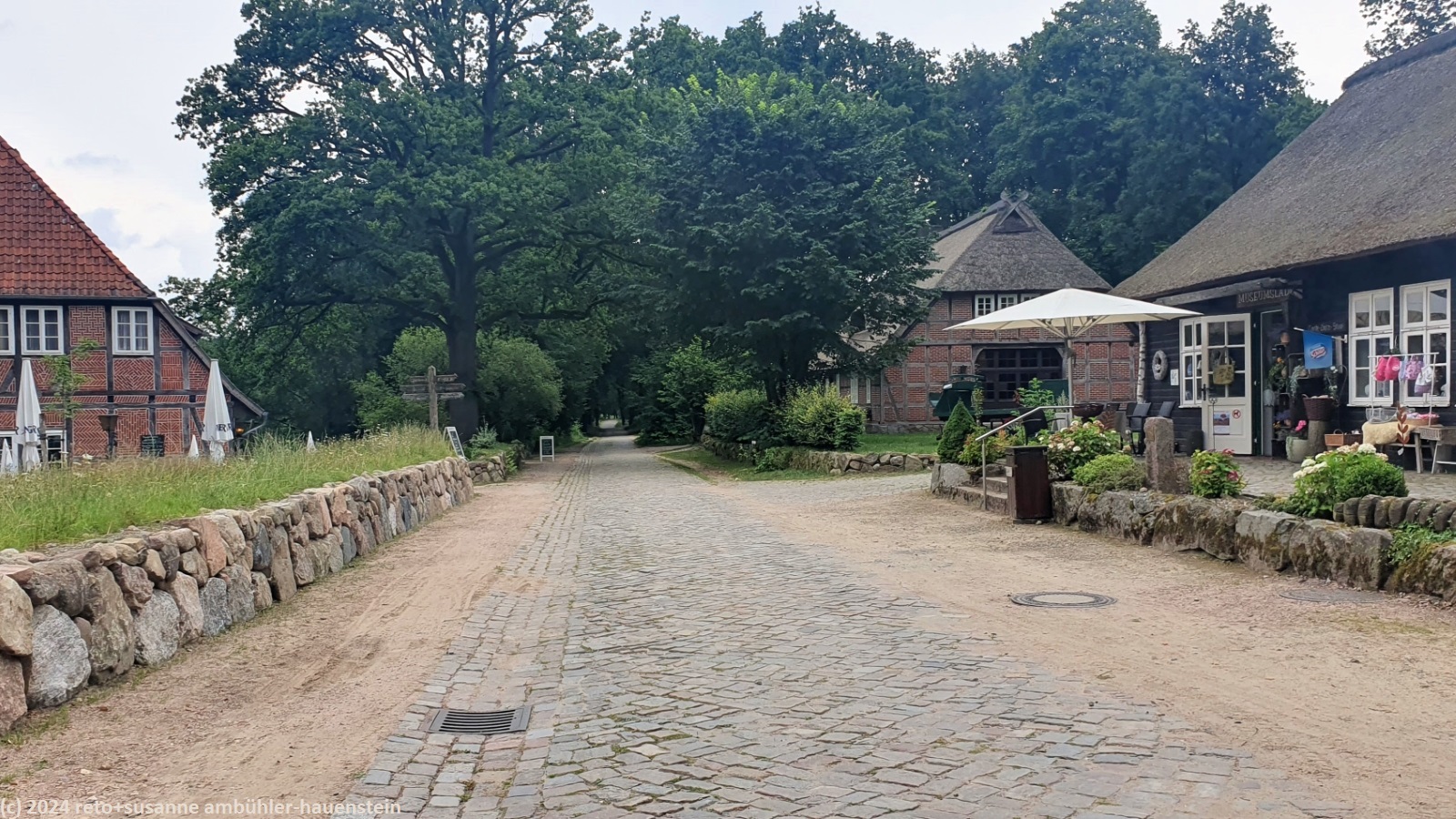 | mit kopfsteinen gepflasterte strasse in wilsede | mächtiges fachwerkhaus |