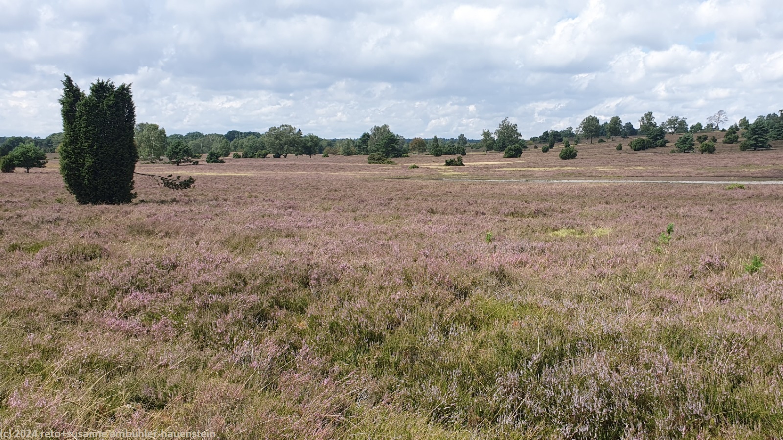 als wir um 08:30 uhr aufstehen, ist der himmel noch bewölkt, doch schon während wir frühstücken, wird es sonnig. wir fahren nach oberhaverbeck, wo wir erst durch den ort mit zahlreichen, historischen fachwerkbauten spazieren und dann den weg richtung wilseder berg unter die füsse nehmen. vom 169.2 meter hohen "berg" haben wir eine tolle aussicht auf die lüneburger heide. nach dem sanften abstieg richtung wilsede essen wir auf einer sitzbank am dorfrand zu mittag. dabei fallen einige regentropfen. im historischen ort bewundern wir weitere fachwerkhäuser und geniessen im restaurant "milchhalle" kaffee und kuchen. anschliessend folgen wir dem wanderweg richtung "totengrund" und umrunden die senke. erst durch einen schönen wald und dann über die offene heide wandern wir zurück zum ausgangspunkt. bevor wir zum einkaufen nach schneverdingen fahren, gönnen wir uns in einem hübschen gartenrestaurant ein erfrischendes getränk. zurück auf dem campingplatz müssen wir im jogi nachtessen, denn es zieht gerade ein gewitter vorüber. den abend verbringt susanne mit lesen und ich am computer.