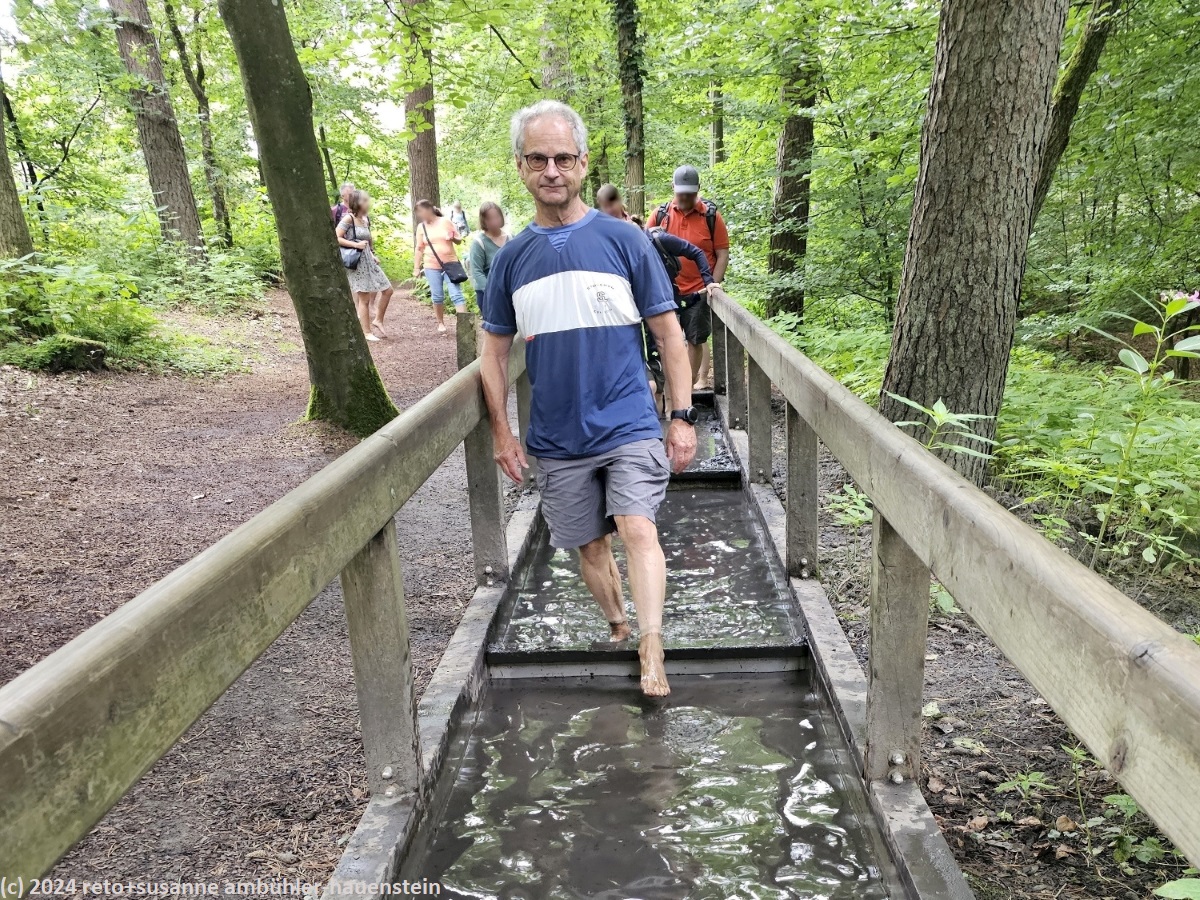 wir stehen auch heute um 08:30 uhr auf. es ist trocken, wenn auch etwas windig. die bedingungen sind gut genug, um im freien zu frühstücken. nach dem abwaschen packen wir zusammen und melden uns beim empfang ab. über die A7 gelangen wir nach egestorf, wo wir den barfusspark besuchen. der besucherandrang ist sehr erträglich. es sind viele familien mit kindern unterwegs, der park ist super geeignet für familien mit kinder jeden alters. der rundweg führt über unterschiedliche unterlagen inklusive holz, stein, glasscherben, pfirsichkerne, tannzapfen, tannenzweige, schlamm- und torfbäder. der waldboden ist angenehm zu begehen. der pfad ist sehr abwechslungsreich. die über 60 posten haben nicht nur mit barfussgehen zu tun, sondern es gibt noch diverse andere attraktionen wie klänge, pendel usw. etwas besonderes ist die "längste barfuss-begehbare hängebrücke". um 12:30 uhr sind wir wieder beim ausgangspunkt.