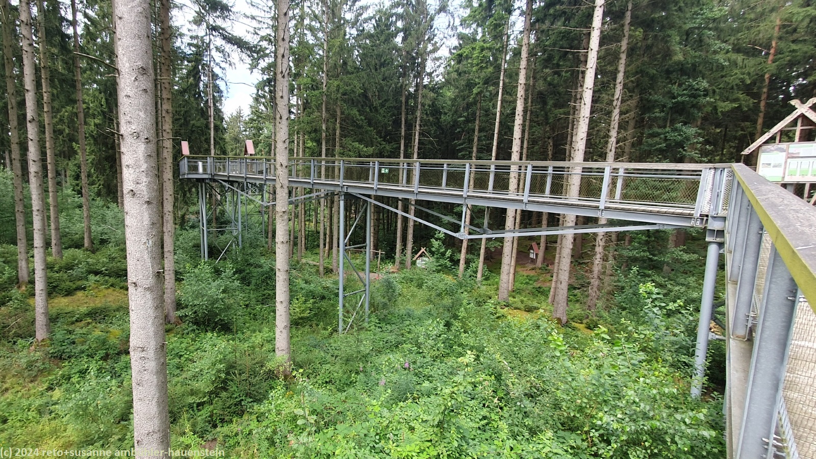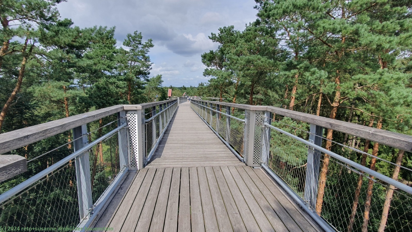 wir fahren zum "heide himmel", einem baumwipfelpfad im wildpark lüneburger heide. allerdings fahren wir nicht direkt, sondern machen einen bogen durch die heidelandschaft um wesel und schierhorn. dabei fahren wir durch undeloh. dieses dorf ist gemäss reiseführer der typische ort in der lüneburger heide schlechthin. manche häuser sind tatsächlich sehr schön, aber uns reicht die fahrt durch den ort, auf den geplanten spaziergang verzichten wir. kurz nach 13 uhr sind wir beim baumwipfelpfad. auch hier hält sich der andrang sehr in grenzen. wir picknicken zuerst an einem der tische beim eingang und geniessen anschliessend kaffee und kuchen auf der terrasse. danach schlendern wir über den baumwipfelpfad. vom steg sehen wir nicht nur in die baumkronen, sondern auch in die gehege des tiergartens. wir erkennen zwei luchse, dachse und waschbären. offenbar dürfen die besucher hier in manche gehege und tiere füttern. zudem sehen wir rehe, welche sich von den besuchern streicheln lassen. schliesslich erreichen wir den 45 meter hohen aussichtsturm. von der plattform haben wir eine tolle rundsicht. wir sehen vorwiegend wald, soweit das auge reicht. selbst der fernsehturm von hamburg ist mit blossem auge zu erkennen. kurz vor 15 uhr sind wir wieder beim jogi.