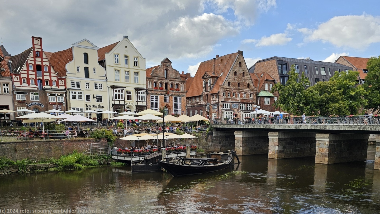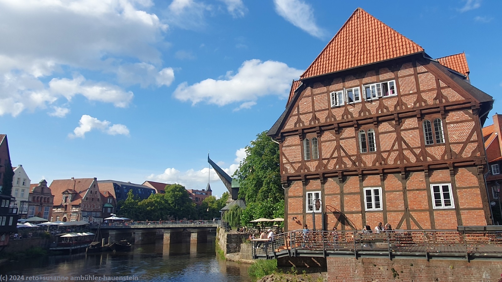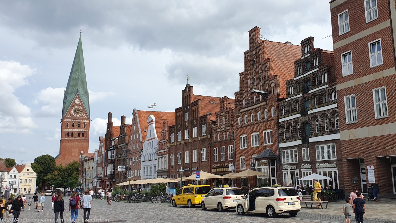 die fahrt nach lüneburg dauert etwas länger als erwartet, weil die strasse zwischen garlstorf und salzhausen gesperrt ist und wir deshalb eine umfahrung nehmen müssen. kurz nach 15:30 uhr erreichen wir lüneburg und finden auch den parkplatz "hinter der saline" auf anhieb. zu fuss gehen wir in die altstadt. im touristenbüro erhalten wir einen stadtplan. wir erfrischen uns "am sande" in einer bäckerei mit tee und einem brötchen, danach spazieren wir durch das stadtzentrum. an der mächtigen sankt johanniskirche vorbei gelangen wir zum 56 meter hohen wasserturm. wir erklimmen die treppe zur aussichtsplattform und haben einen fantastischen rundblick über die stadt. im wasserturm wurden einst 500'000 liter wasser gespeichert. heute dient das gebäude als touristenattraktion und veranstaltungsort. es hat diverse ausstellungen und den zweiten stock kann man für veranstaltungen mieten. wieder auf dem boden gehen wir richtung fluss und folgen der ilemnau bis zur lünerstrasse. hier befindet sich das restaurant "das kleine", wo wir gerne zu abendessen möchten. noch ist es etwas zu früh, aber eine freundliche dame meint, wir bräuchten keine reservation, wir sollen einfach kommen wenn uns danach ist. wir spazieren noch einmal durch die altstadt und sind dann kurz vor 18 uhr beim "kleinen".
