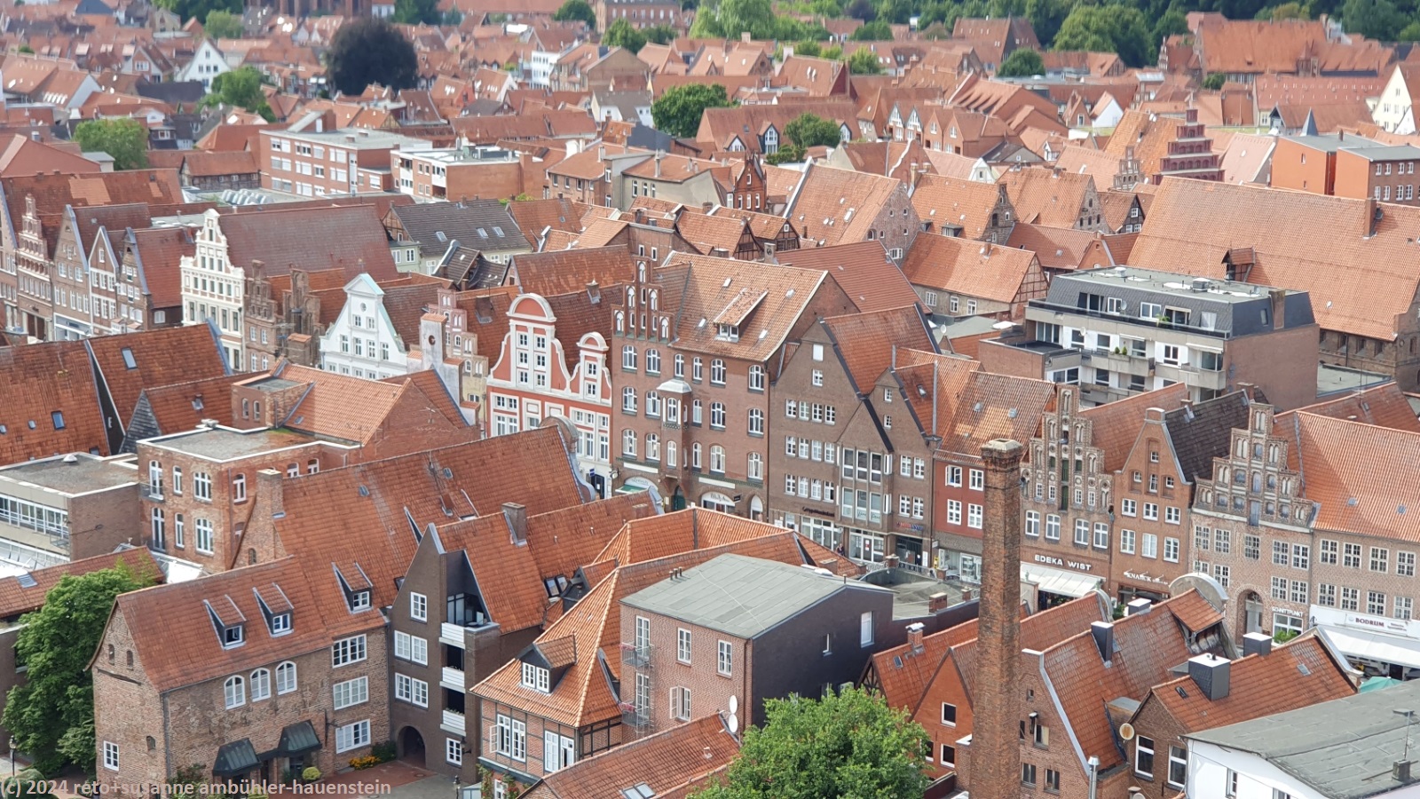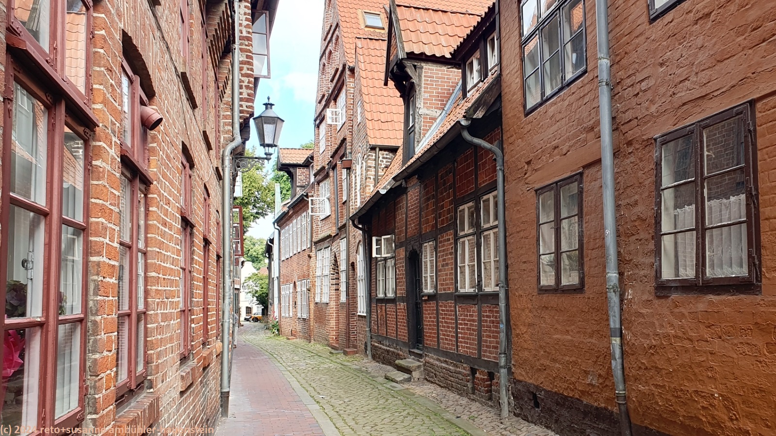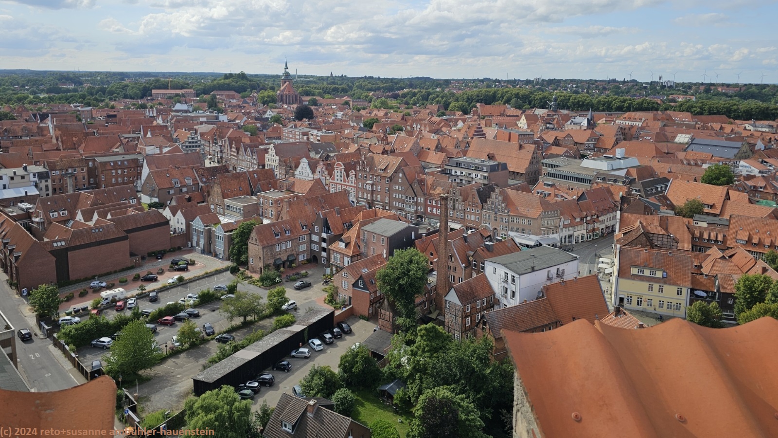 die fahrt nach lüneburg dauert etwas länger als erwartet, weil die strasse zwischen garlstorf und salzhausen gesperrt ist und wir deshalb eine umfahrung nehmen müssen. kurz nach 15:30 uhr erreichen wir lüneburg und finden auch den parkplatz "hinter der saline" auf anhieb. zu fuss gehen wir in die altstadt. im touristenbüro erhalten wir einen stadtplan. wir erfrischen uns "am sande" in einer bäckerei mit tee und einem brötchen, danach spazieren wir durch das stadtzentrum. an der mächtigen sankt johanniskirche vorbei gelangen wir zum 56 meter hohen wasserturm. wir erklimmen die treppe zur aussichtsplattform und haben einen fantastischen rundblick über die stadt. im wasserturm wurden einst 500'000 liter wasser gespeichert. heute dient das gebäude als touristenattraktion und veranstaltungsort. es hat diverse ausstellungen und den zweiten stock kann man für veranstaltungen mieten. wieder auf dem boden gehen wir richtung fluss und folgen der ilemnau bis zur lünerstrasse. hier befindet sich das restaurant "das kleine", wo wir gerne zu abendessen möchten. noch ist es etwas zu früh, aber eine freundliche dame meint, wir bräuchten keine reservation, wir sollen einfach kommen wenn uns danach ist. wir spazieren noch einmal durch die altstadt und sind dann kurz vor 18 uhr beim "kleinen".