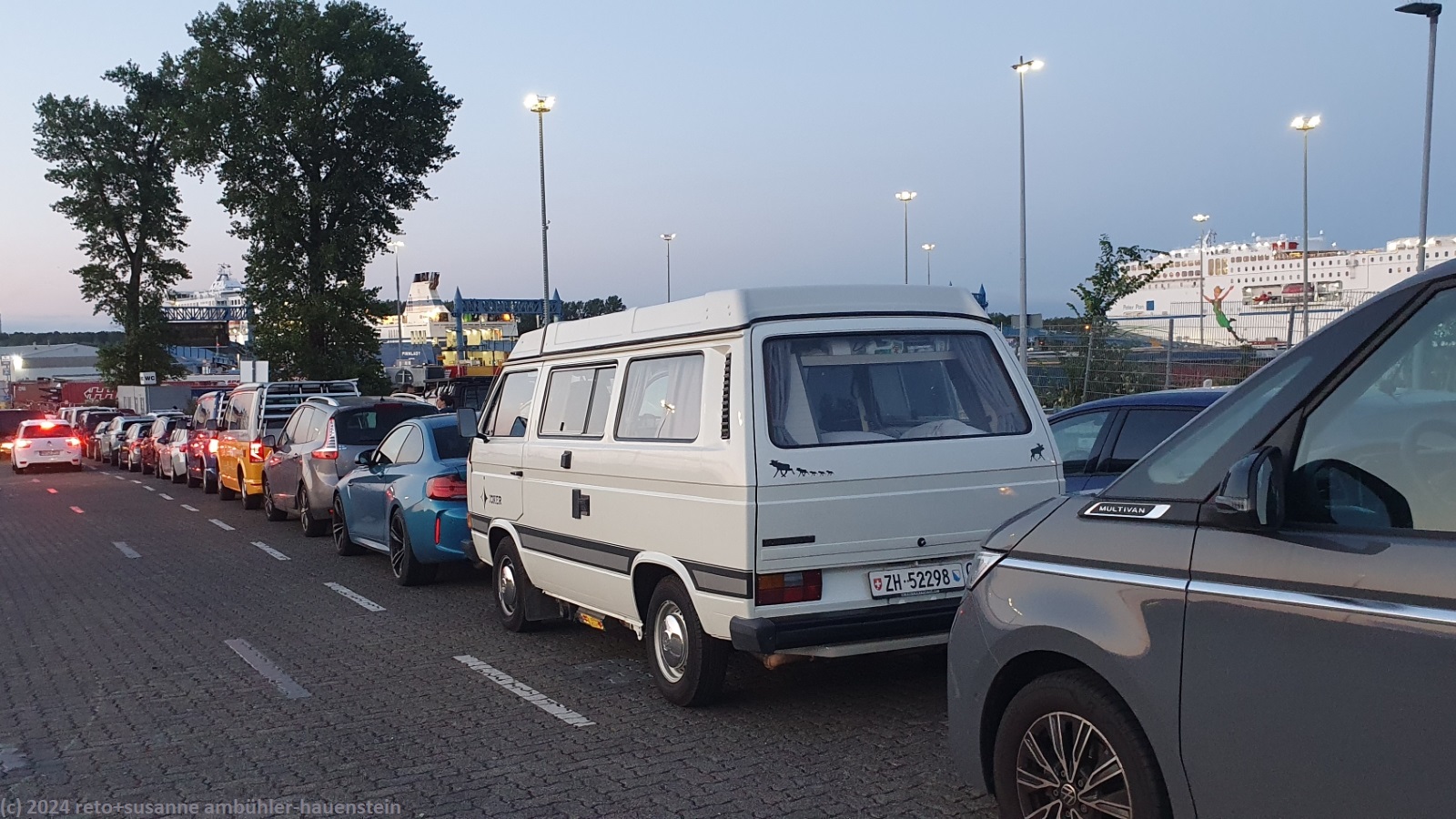 wir geniessen ein köstliches abendessen im licht der abendsonne. am tisch nebenan sitzen ein junger mann und zwei frauen aus mexiko. ihre lebhafte unterhaltung ist nicht zu überhören. offensichtlich entspricht das servierte essen nicht ihren erwartungen. irgendwann möchte der mann "pasta" bestellen, aber das gibt es in diesem restaurant nicht. hier werden norddeutsche spezialitäten serviert und keine teigwaren. als ich zum dessert einen blaubeerbecher bestelle, möchte er auch einen haben. wir stellen uns vor, dass es uns ähnlich ergehen wird, falls aus der angedachten japanreise einmal etwas wird. um 19 uhr brechen wir wieder auf. wir kehren zum jogi zurück und fahren zum überseehafen bei travemünde. kurz vor dem hafen tanken wir unseren wagen auf. da sich die tankstelle auf der anderen strassenseite der richtungsgetrennten B75 befindet, ist die anfahrt und der weg zurück zur route richtung hafen etwas kompliziert und erfordert mehrere wendemanöver. der check-in braucht ein bisschen geduld, klappt aber problemlos. während wir auf den beginn des verlads warten, packen wir erst unsere sachen, die wir auf die fähre mitnehmen wollen. danach liest susanne, ich führe die bücher nach.
