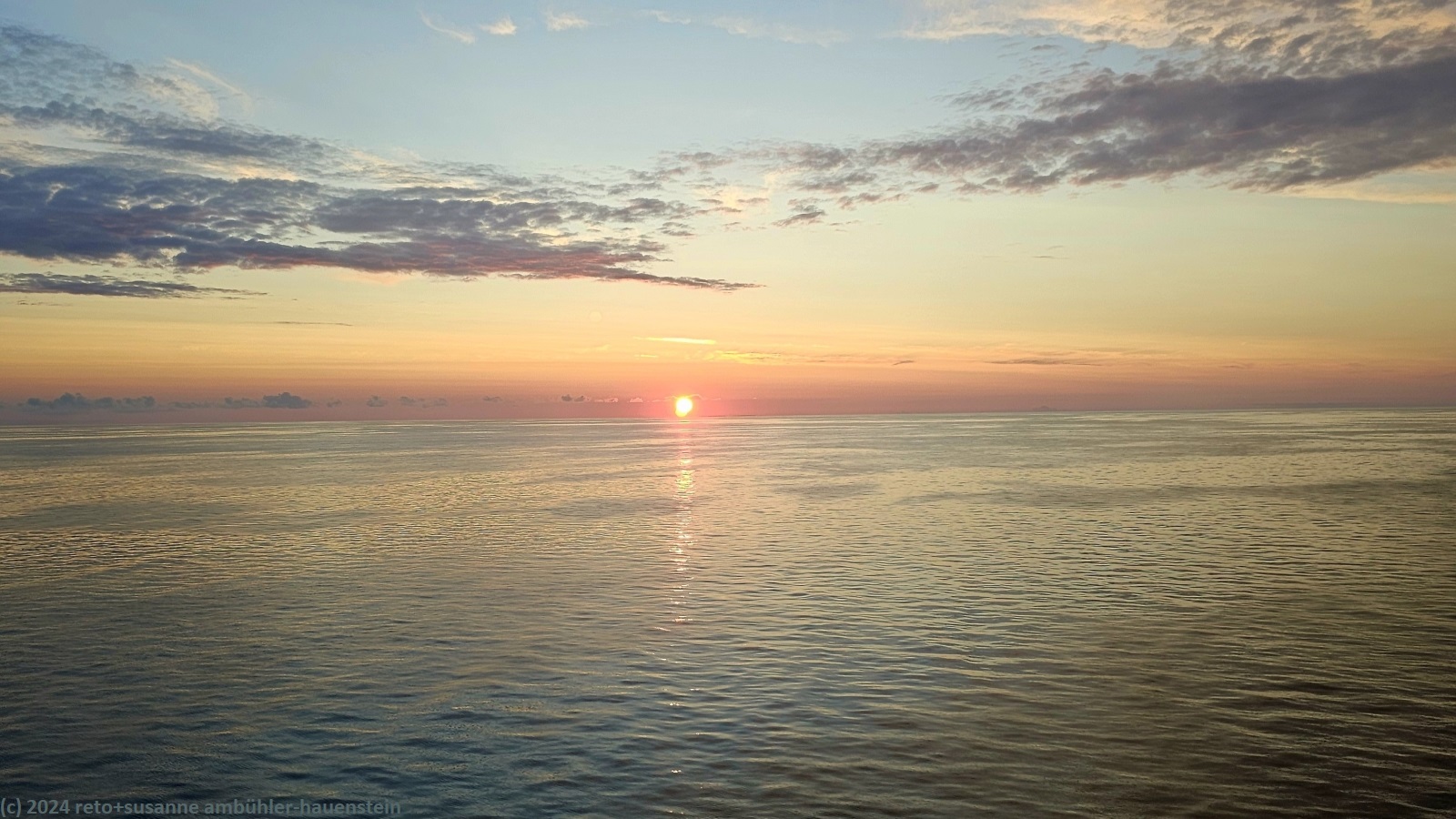 wir stehen um 10 uhr ortszeit auf und frühstücken im restaurant der fähre. danach verbringen wir zeit in unserer kabine. susanne liest, ich arbeite am computer. um 12:30 uhr besuchen wir noch einmal das restaurant und essen eine kleinigkeit. den nachmittag verbringen wir an einem fensterplatz im aufenthaltsbereich. gegen 15:30 uhr besuche ich den fitnessraum. es sind mehr leute anwesend, als ich erwartet hätte. nachdem ich geduscht habe, setzen wir uns auf das sonnendeck und essen etwas. die zeit bis zum abendessen verbringen wir wiederum im aufenthaltsbereich. das nachtessen geniessen wir an unserem reservierten tisch. danach setzen wir uns abermals in den aufenthaltsbereich und erleben kurz nach 22 uhr einen wunderschönen sonnenuntergang. eine stunde später schlüpfen wir unter die bettdecken.