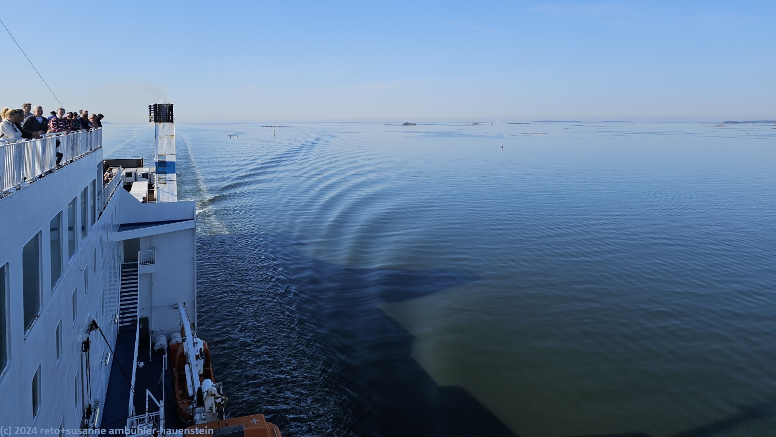 vor dem anlegen muss die mächtige fähre wenden. dank antrieben im heck und im bug kann das schiff an ort drehen. der himmel ist fast wolkenlos, es ist ziemlich warm. wir legen pünktlich an, aber bis das entladen beginnt, dauert es noch ziemlich genau eine stunde. möglicherweise verzögert sich das entladen wegen dem motorradfahrer, der offenbar auf der laderampe gestürzt ist und am boden liegt. was für ein riesiges pech, wenn der urlaub so beginnt - oder gar mit dem sturz endet, bevor er richtig begonnen hat. auch auf der fahrt durch das hafenareal ist viel geduld erforderlich. den zoll passieren wir dagegen ohne verzögerung. schon bald sind wir auf der A7 richtung helsinki. wir fahren auf dem ring nördlich an der stadt vorbei. auf der A1 geht es westwärts. wir kommen äusserst gut voran. es sind nur wenige fahrzeuge unterwegs und die finnen sind sehr disziplinierte autofahrer. erstaunlicherweise fahren wir einige male durch tunnel, zumindest eines davon ist überraschend lange. die sonne steht an einem nahezu wolkenlosen himmel, in unserem jogi steigt die temperatur auf bis zu 32°C. um 13:30 uhr sind wir beim campingplatz ruissalo auf einer insel westlich von turku. unsere reservation klappt, mit dem zugewiesenen stellplatz sind wir allerdings nicht glücklich. wir können aber problemlos auf einen anderen platz wechseln.