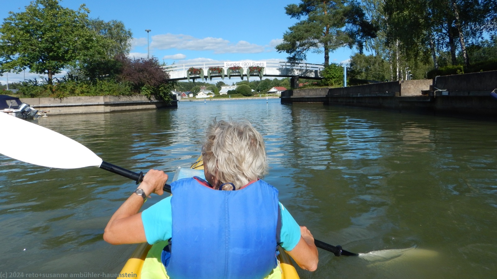 da wir von ihm keine rückmeldung erhalten, landen wir beim südlichen ende des kanals kyrksundet nochmals und rufen hannu an um die rückgabe des kajaks auszumachen. die fahrt durch den schmalen kanal ist locker. aber ab dem nordende der stadt haben wir noch einmal richtig gegenwind. als wir das haus des kajakclubs erreichen, kommt hannu auch gerade.