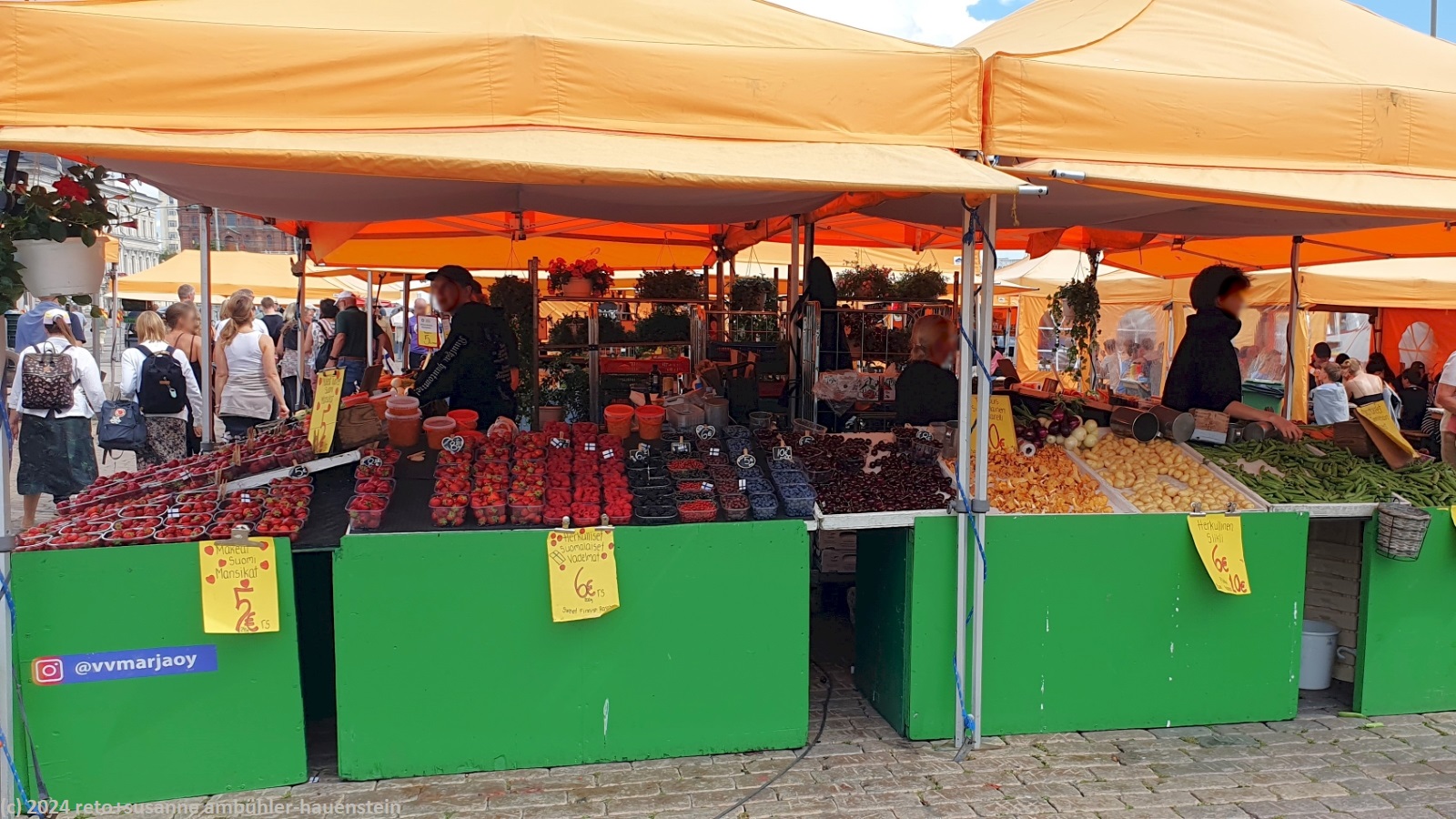 wir parkieren unseren jogi bei der autoverladestation, packen unsere sachen für heute nacht und fahren dann mit der nächsten s-bahn ins zentrum von helsinki. das wetter ist nun etwas sonniger und es ist richtig warm. wir gehen zur alten markthalle am hafen und essen zu mittag. anschliessend schlendern wir durch den markt und bewundern die auslagen. bei manchen ständen sind die beeren und das gemüse kunstvoll arrangiert. im cafe an der hauptstrasse geniessen wir kaffee und kuchen. danach machen wir beim restaurant la famiglia eine reservation für 18:30 uhr. wir schlendern weiter durch die stadt. es hat viele baustellen, auch die kuppel des doms ist eingerüstet. gegen 15:45 uhr beginnt es leicht zu regnen. wir setzen uns ins bistro beim bad am hafen und trinken einen tee. als wir wieder aufbrechen, beginnt es erst leicht und wenig später heftiger zu regnen. wir besuchen mehrere warenhäuser um trocken zu bleiben. beim hauptbahnhof drehen wir wieder um. der regen lässt bald nach und so schlendern wir kreuz und quer durch die strassen um die zeit vergehen zu lassen. kurz vor 18:30 uhr gehen wir zum restaurant la famiglia und geniessen ein köstliches abendessen. eine gute stunde später machen wir auf den weg zum bahnhof und fahren mit der s-bahn zurück nach pasila.