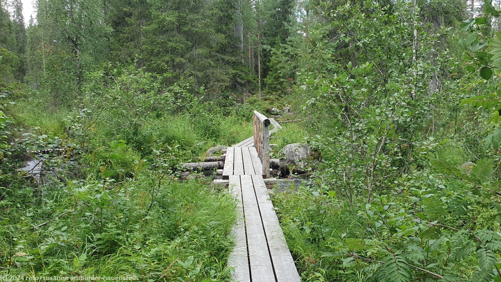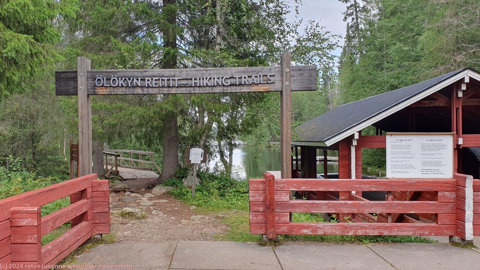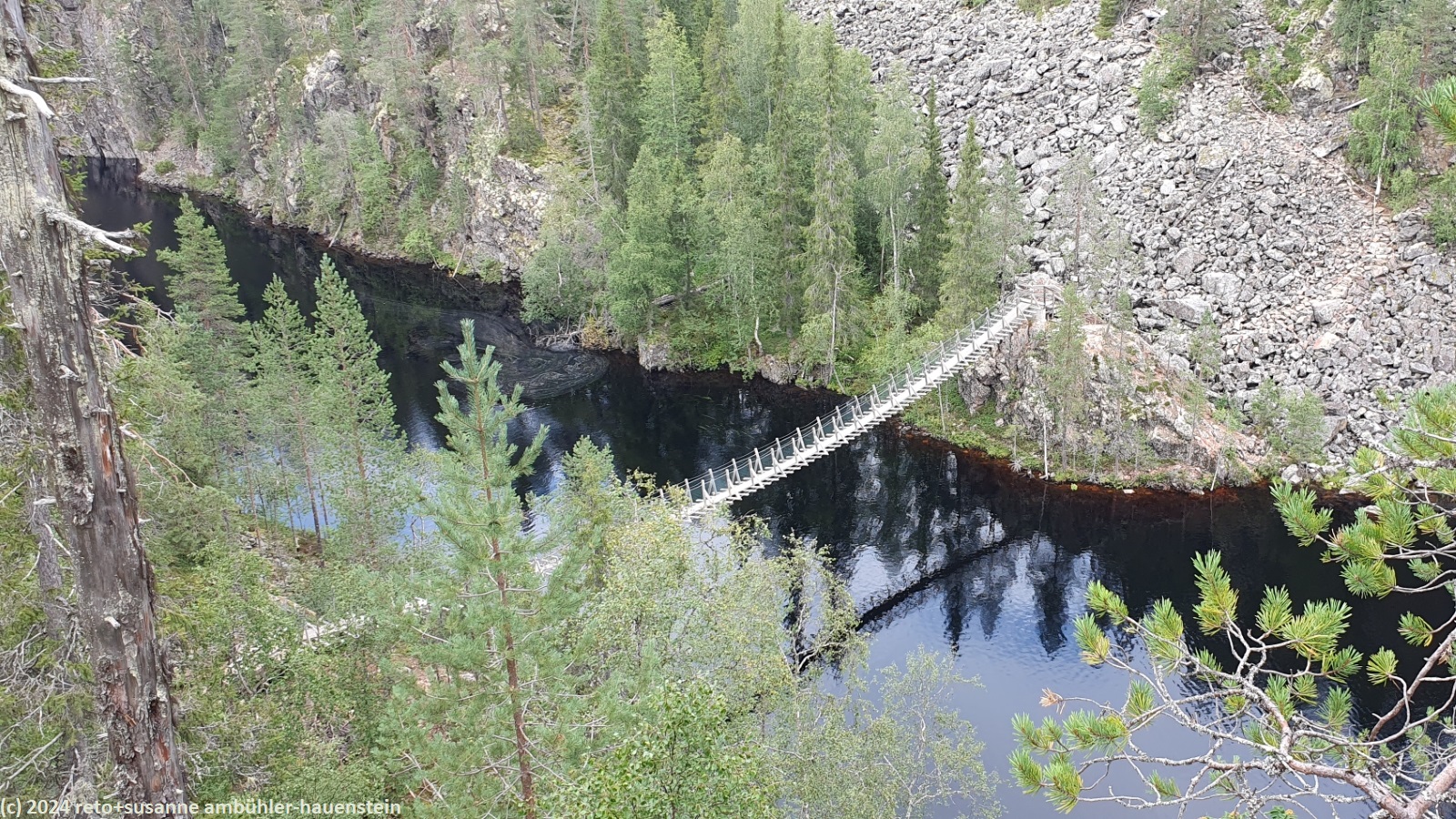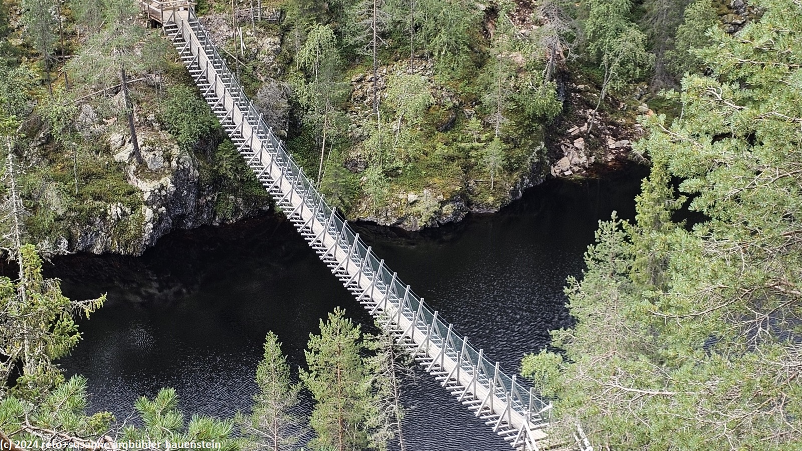 unsere heutige wanderung führt uns rund um den gleichnamigen see. obwohl "see" nicht ganz passend ist: das schmale und langgezogene gewässer befindet sich in einer schlucht, deren wände bis zu 50 meter über die wasseroberfläche hinaus ragen. der see soll noch einmal bis 50 meter tief sein. eine solche schlucht ist in finnland eher eine seltenheit. wir wandern auf der östlichen kante nordwärts. der wald ist gegenüber der gestrigen wanderung abwechslungsreicher, vielfältiger und wilder. der weg ist holpriger und manchmal geht es ziemlich steil auf- oder abwärts, wenn auch immer nur ganz kurz. auch die stege durch die sumpfgebiete fehlen nicht. auf etwa halbem weg befindet sich die spektakuläre hängebrücke, welche den canyon überspannt. diese brücke ist allerdings zur zeit wegen wartungsarbeiten geschlossen. offenbar wurde sie bei einem unwetter im juni stark beschädigt. wir wollten zwar nicht über diese brücke gehen, aber der blick von derselben wäre bestimmt eindrücklich gewesen. wir setzen unsere wanderung fort und sind kurz nach 13:20 uhr bei der schutzhütte ölökynperä. hier essen wir zu mittag. mit dieser schutzhütte haben wir den nördlichsten punkt unserer rundwanderung erreicht.