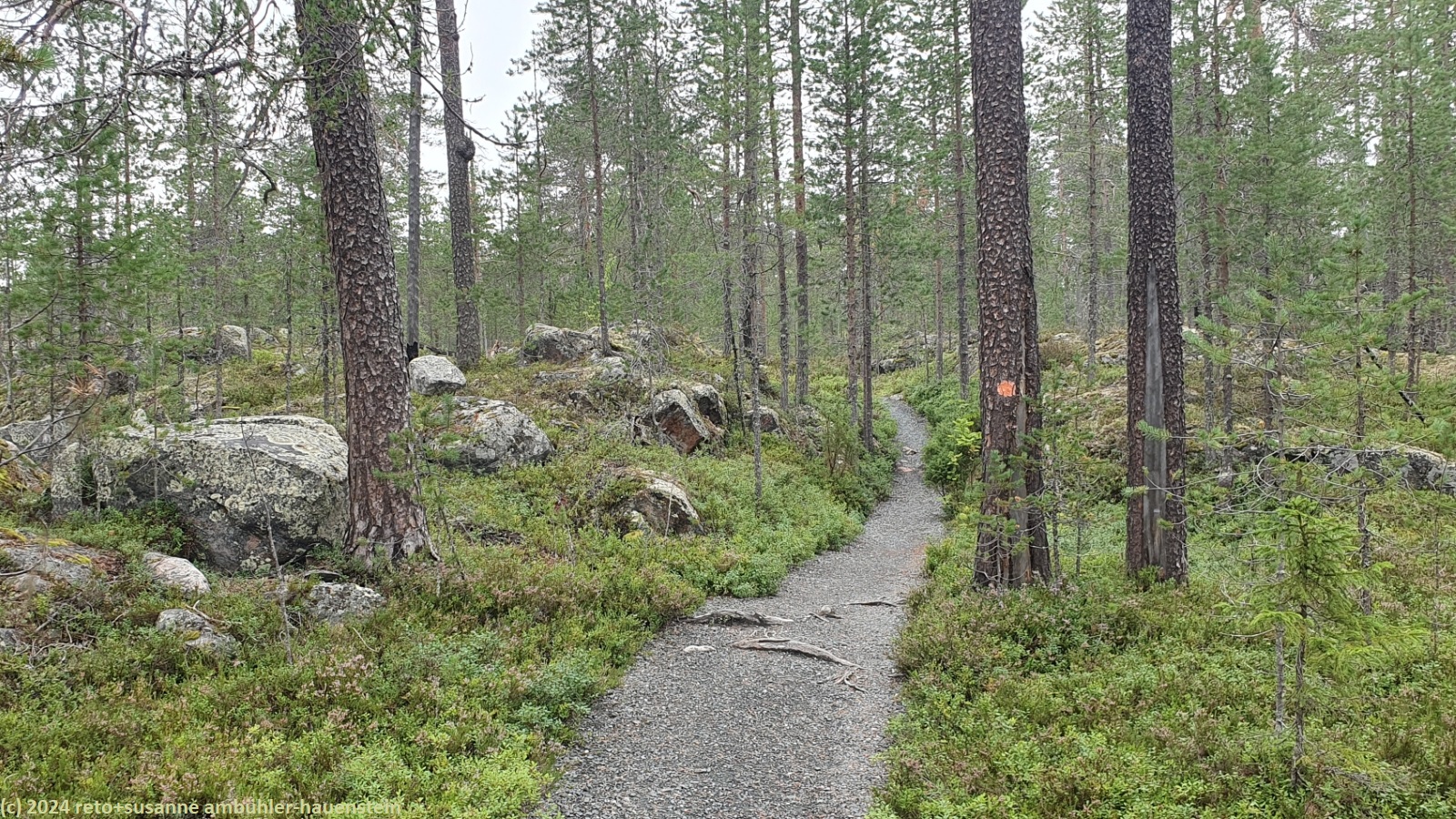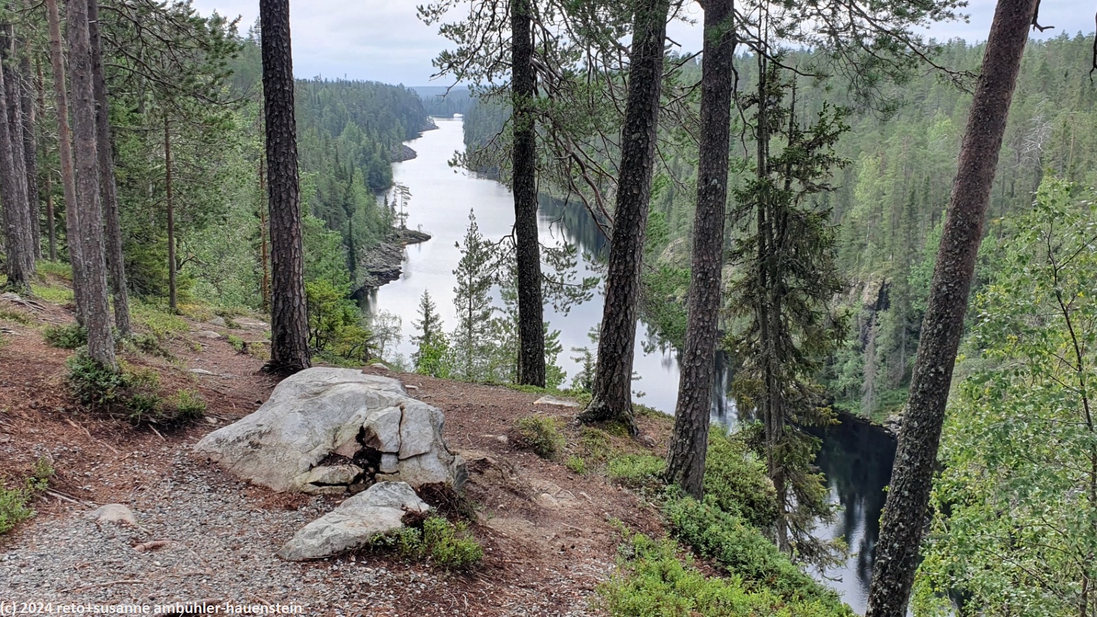 wir schlafen bis 08:45 uhr. nach dem frühstück im wagen fahren wir zum julma-ölkky, wobei wir auch heute über eine holprige, unbefestigte strasse zum ausgangspunkt unserer rundwanderung gelangen. diese führt uns um die langgezogene schlucht des julma-ölkky, ein schmaler see, der bis zu 50 meter tief sein soll. die steilen felswände überragen die wasseroberfläche nochmals um bis zu 50 meter. der schmale pfad ist ein auf und ab. wir wandern auf der ostseite bis zum nördlichen ende der schlucht. dabei kommen wir auf etwa halbem weg an der hängebrücke vorbei, welche den see überspannt, zur zeit aber geschlossen ist. es ist schon bald 13:30 uhr, als wir bei der schutzhütte ölökynperä picknicken. obwohl uns unterwegs kaum jemand begegnet ist, hat es hier erstaunlich viele menschen. auf dem rückweg zum ausgangspunkt folgen wir dem westlichen rand der schlucht. auch hier gibt es einige schöne aussichtspunkte. zurück beim parkplatz holen wir uns beim kiosk kaffee und eine zimtschnecke. während wir zum campingplatz zurück fahren, zeigt sich die sonne. wie schon gestern geniessen wir erst die sauna und dann das abendessen im freien. den abend verbringen wir am computer.