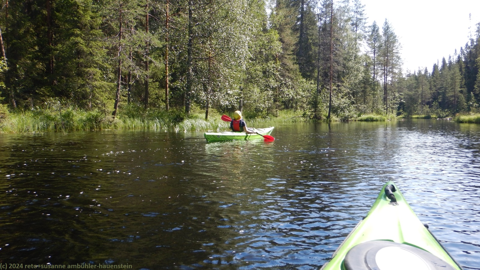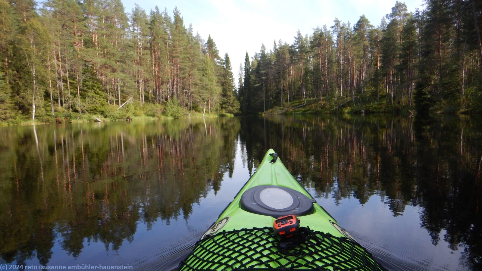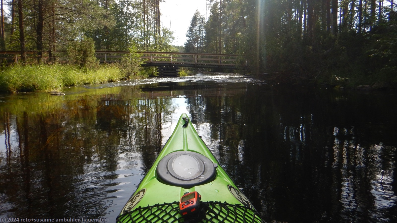 wir stehen um 07:45 uhr auf und frühstücken im freien. obwohl wir 20 minuten zu früh beim info-center sind, ist unsere ausrüstung schon bereit, so dass wir nur noch bezahlen müssen und dann gleich losfahren können. ein junger mann bringt uns zum julma-ölkky, dem ausgangspunkt unserer kajaktour. wir paddeln erst auf dem schmalen see bis zu dessen nördlichen ende und wieder zurück. nach einer kurzen pause bringen wir unsere kajaks mit hilfe der bootrutsche zum ala-ölkky hinunter. am südlichen ende des sees gelangen wir in den schmalen somerjoki. bei der schutzhütte lihapyörre braten wir unsere würste. um 14:30 uhr setzen wir unsere tour über den gleichnamigen fluss fort, müssen aber unsere boote schon bald ein kurzes stück tragen, weil umgestürzte bäume das durchkommen behindern. nun paddeln wir erst über den etwas grösseren laukkujärvi und dann über den langgezogenen talasjärvi. danach folgen mehrere, zum teil ziemlich versteckte durchfahrten vom einen zum nächsten see. meine routenplanung passt haargenau, wir finden die schmalen wasserstrassen jeweils auf anhieb. bei der schutzhütte mit rastplatz am westlichen ende des huosiusjärvi machen wir nochmals einen kurzen halt. anschliessend geht es durch eine kaum erkennbare verbindung zum hossanjärvi und über diesen zum ziel in der nähe des besucherzentrum. wir deponieren die kajaks am strand und retournieren die übrige ausrüstung beim info-center. zurück auf dem campingplatz geniessen wir einmal mehr die sauna und anschliessend das abendessen im freien.