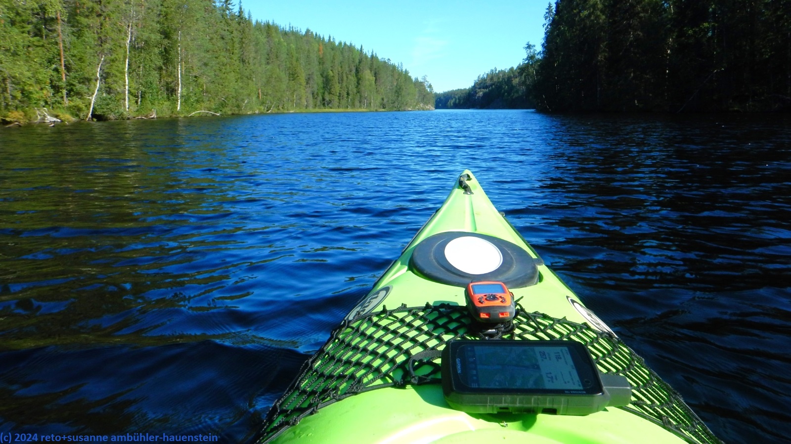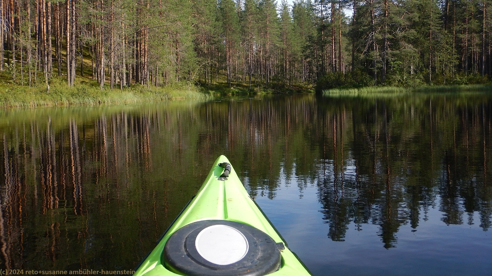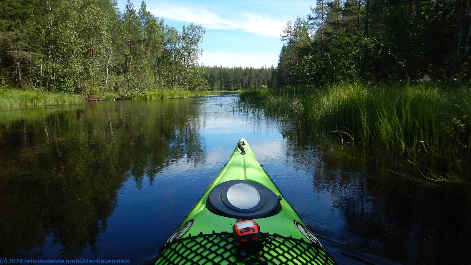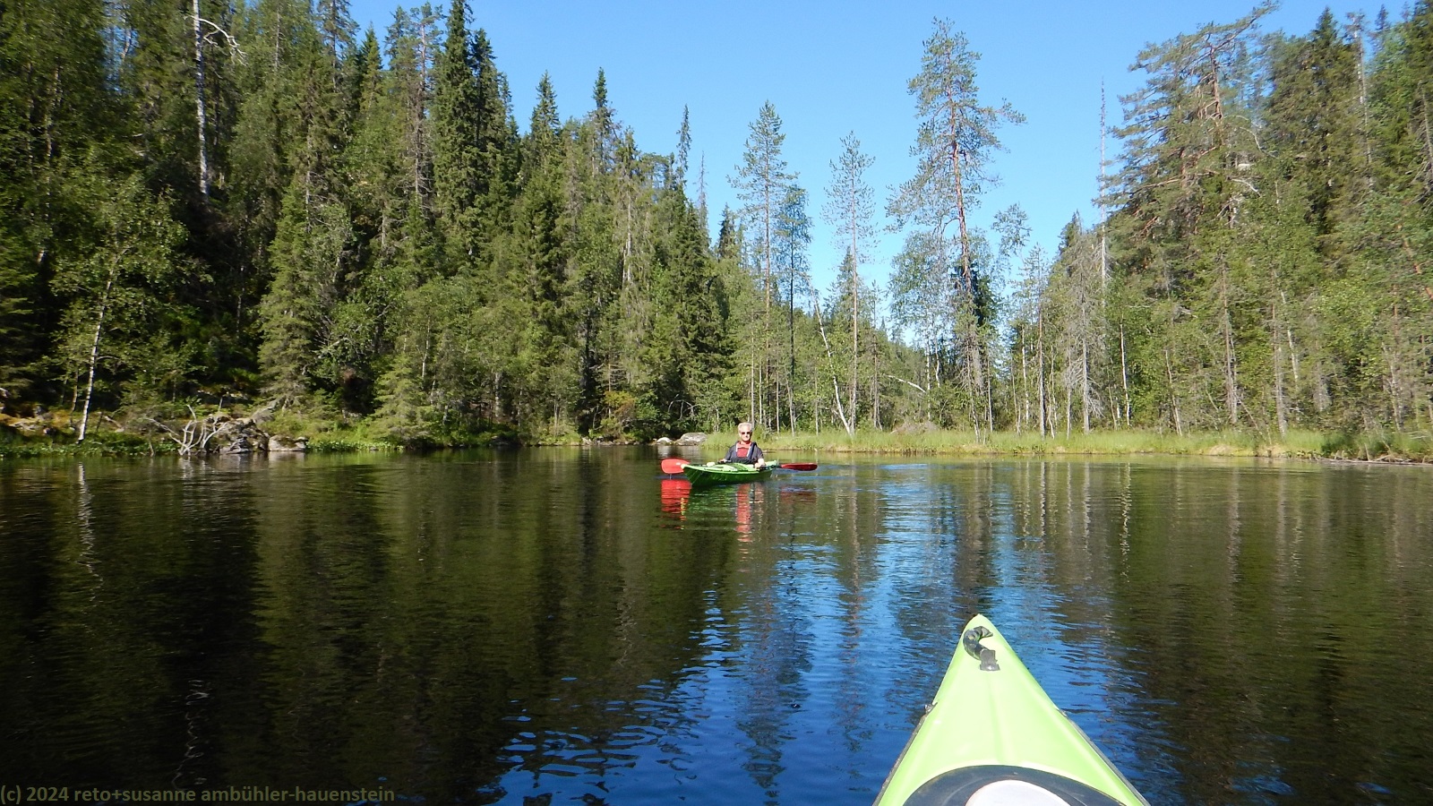 wir stehen um 07:45 uhr auf und frühstücken im freien. obwohl wir 20 minuten zu früh beim info-center sind, ist unsere ausrüstung schon bereit, so dass wir nur noch bezahlen müssen und dann gleich losfahren können. ein junger mann bringt uns zum julma-ölkky, dem ausgangspunkt unserer kajaktour. wir paddeln erst auf dem schmalen see bis zu dessen nördlichen ende und wieder zurück. nach einer kurzen pause bringen wir unsere kajaks mit hilfe der bootrutsche zum ala-ölkky hinunter. am südlichen ende des sees gelangen wir in den schmalen somerjoki. bei der schutzhütte lihapyörre braten wir unsere würste. um 14:30 uhr setzen wir unsere tour über den gleichnamigen fluss fort, müssen aber unsere boote schon bald ein kurzes stück tragen, weil umgestürzte bäume das durchkommen behindern. nun paddeln wir erst über den etwas grösseren laukkujärvi und dann über den langgezogenen talasjärvi. danach folgen mehrere, zum teil ziemlich versteckte durchfahrten vom einen zum nächsten see. meine routenplanung passt haargenau, wir finden die schmalen wasserstrassen jeweils auf anhieb. bei der schutzhütte mit rastplatz am westlichen ende des huosiusjärvi machen wir nochmals einen kurzen halt. anschliessend geht es durch eine kaum erkennbare verbindung zum hossanjärvi und über diesen zum ziel in der nähe des besucherzentrum. wir deponieren die kajaks am strand und retournieren die übrige ausrüstung beim info-center. zurück auf dem campingplatz geniessen wir einmal mehr die sauna und anschliessend das abendessen im freien.