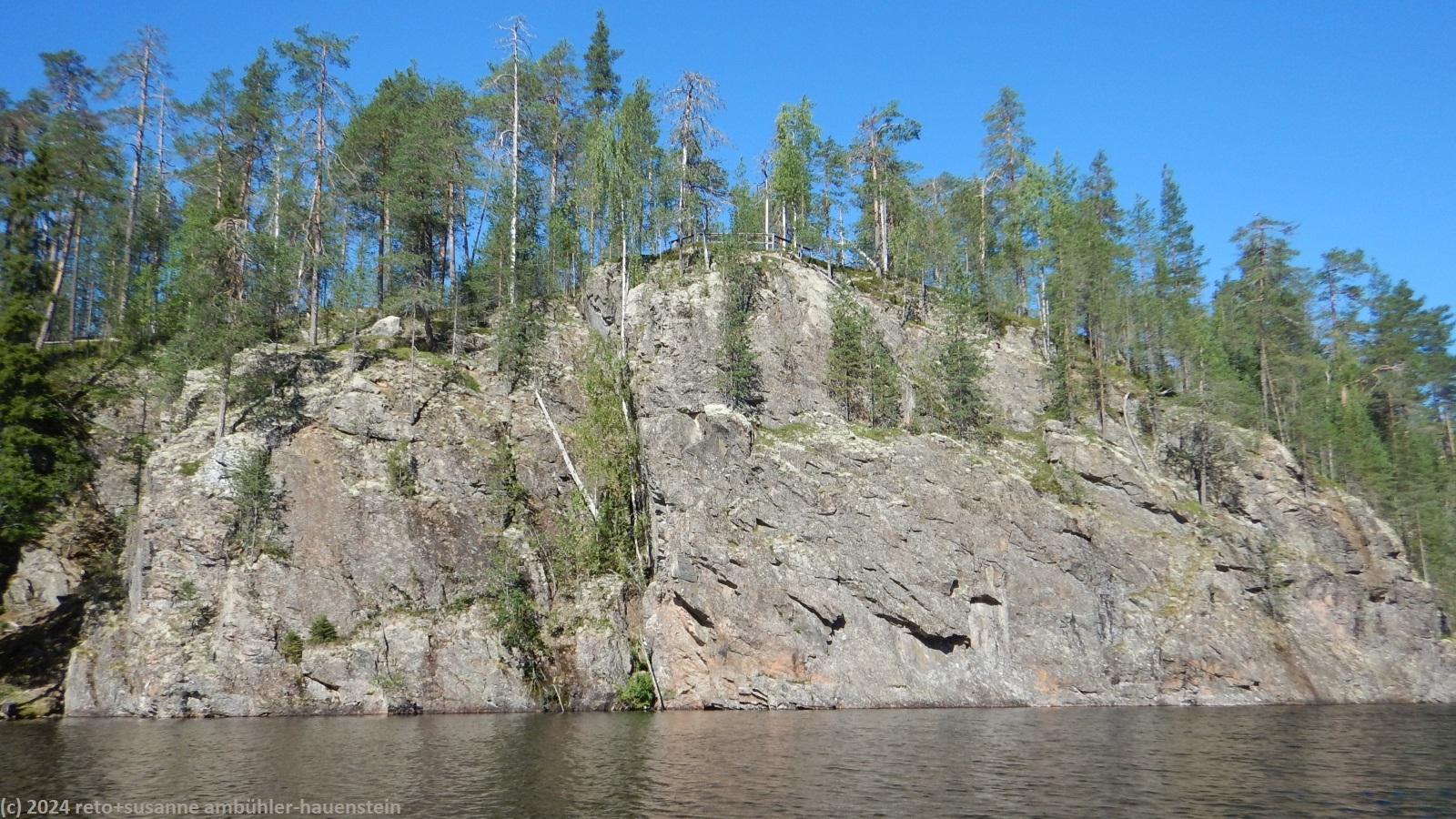unser handy weckt uns um 07:45 uhr. es bahnt sich ein ähnlich sonniger tag an wie gestern. während wir im freien frühstücken, ist es aber noch ziemlich kühl. kurz vor 09:30 uhr machen wir uns auf den weg zum info-center des hossa nationalpark. die fahrt dauert keine zehn minuten. obwohl wir zwanzig minuten zu früh sind, steht der wagen mit den kajaks schon bereit und nachdem wir die bezahlung erledigt haben, geht es sofort los. ein junger mann bringt uns zum julma-ölkky. hier haben wir vor zwei tagen schon parkiert, als wir um den canyon herum gewandert sind. nun lassen wir unsere kajak in den see in dieser schlucht. das wasser ist sehr ruhig. wäre da nicht das motorboot, welches auf diesem see rundfahrten macht, so wäre es absolut ruhig. der see liegt in einer schmalen schlucht mit teilweise fast senkrechten felswänden. an einer solchen soll es 4000 jahre alte felszeichnungen haben. leider wissen wir nicht genau, wo sich diese befinden. wir schauen da und dort, können aber die zeichnungen nicht finden. gemäss den bildern auf der website des nationalparks sind die zeichnungen nicht wirklich offensichtlich. wir paddeln unter der hängebrücke hindurch und erreichen nach 3 km das ende des sees. hier wenden wir und paddeln zurück zum startpunkt.