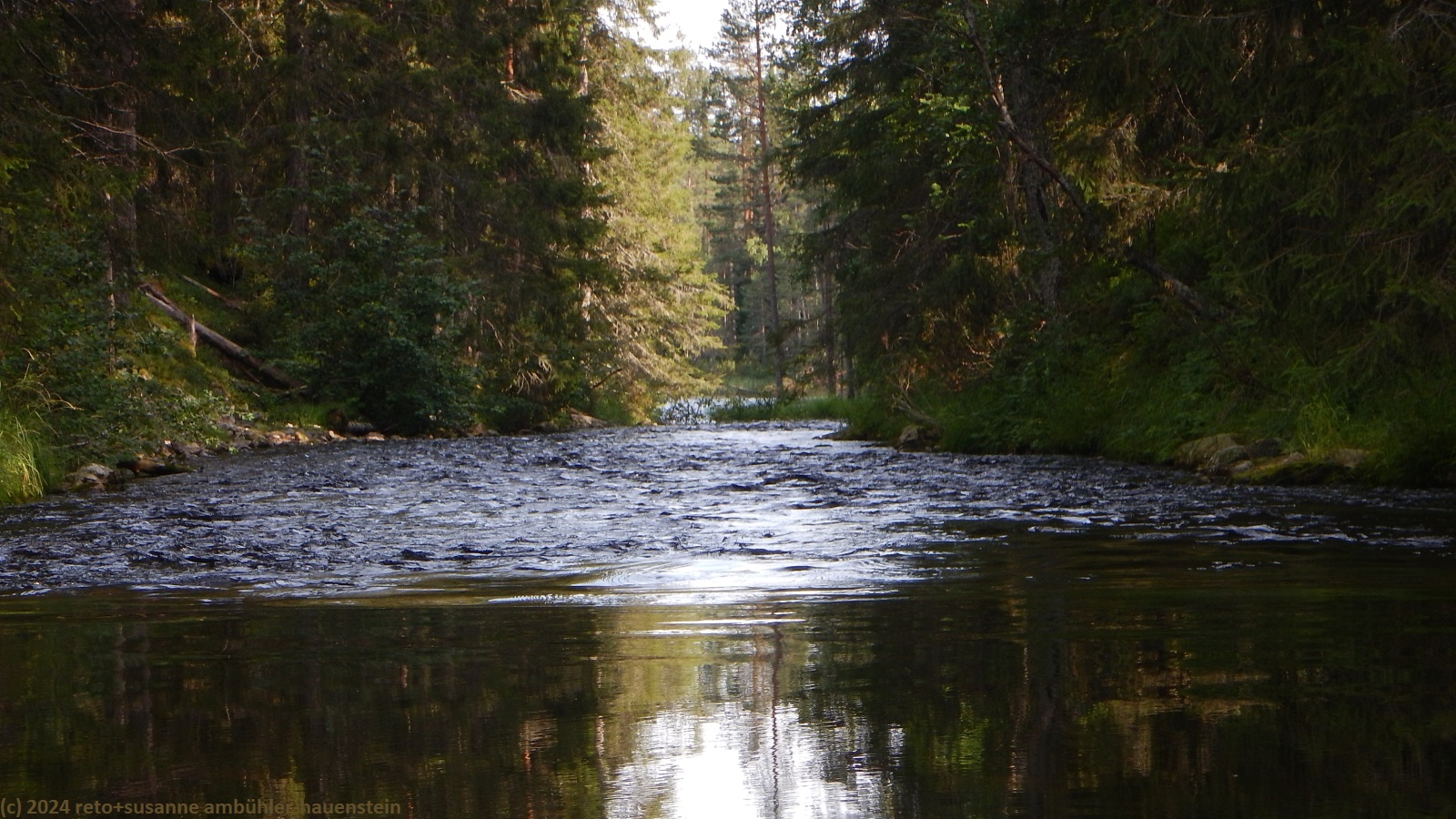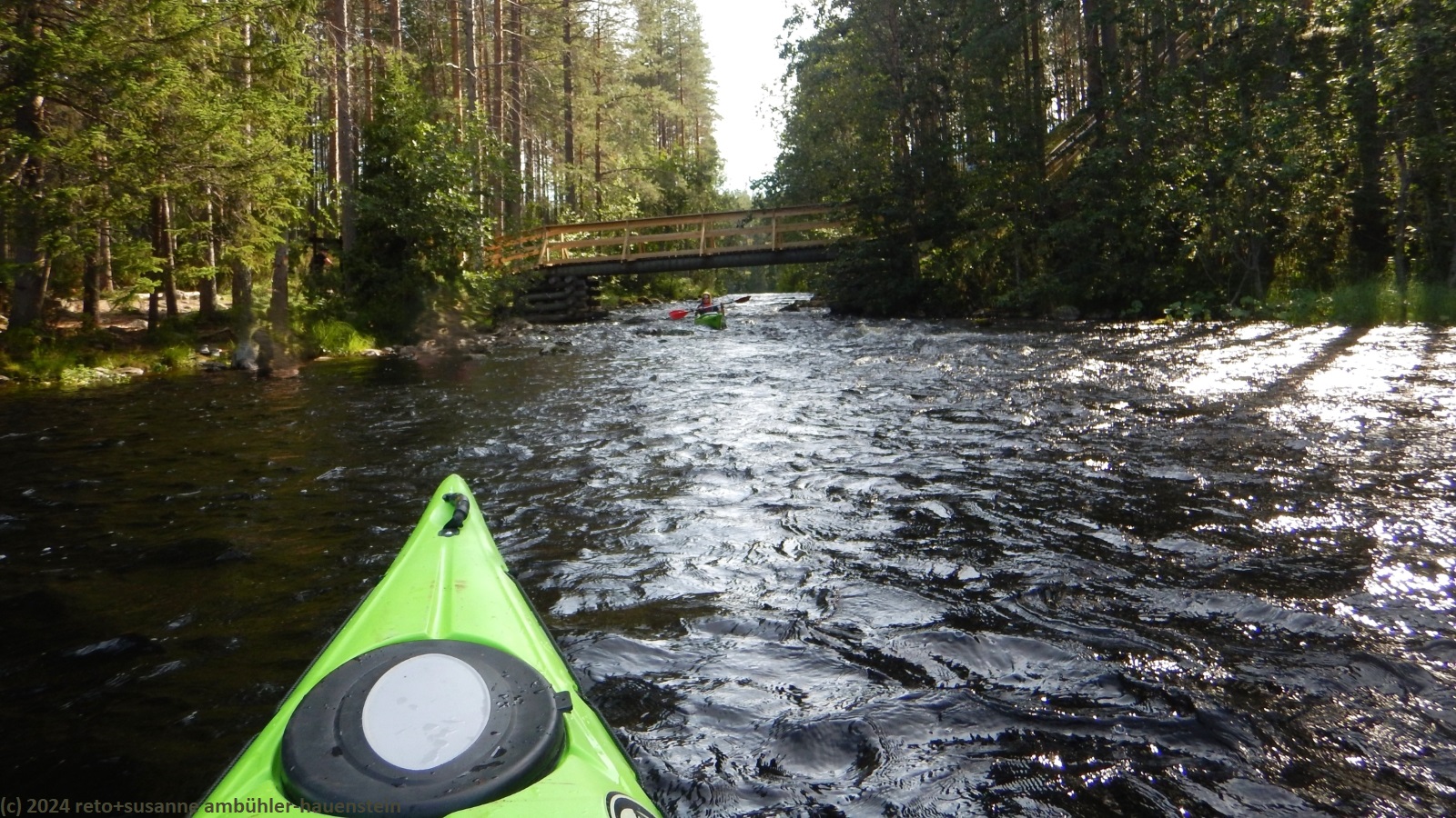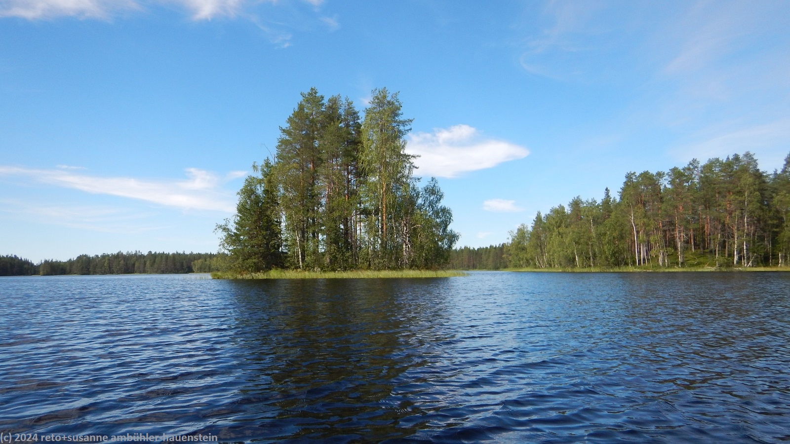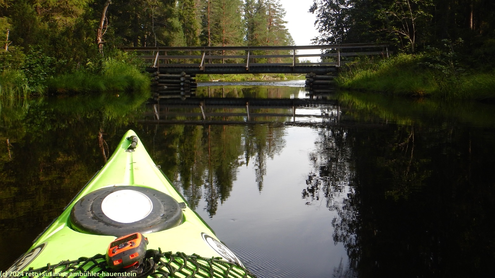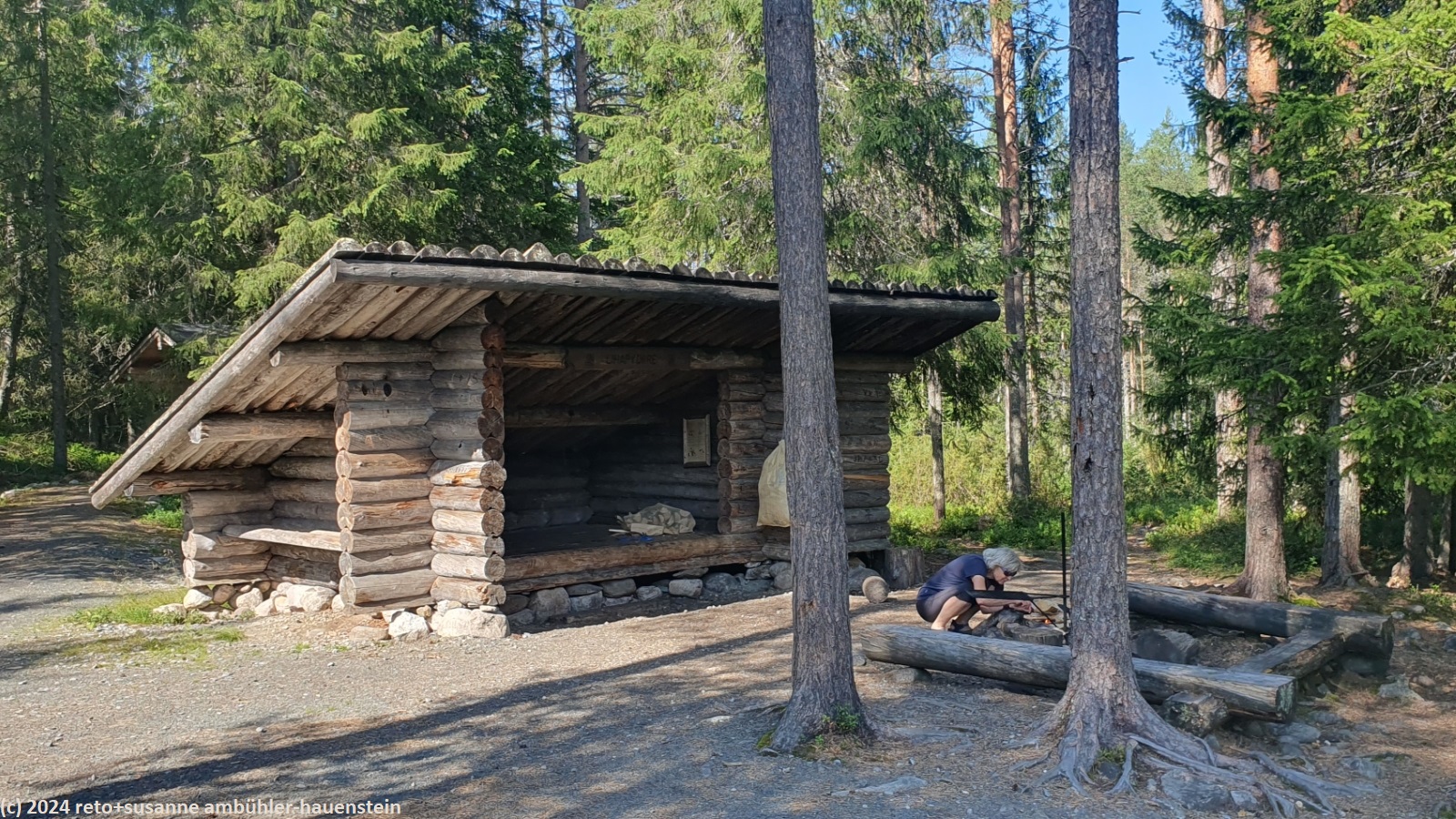 danach nehmen wie den letzten abschnitt in angriff. wieder führt eine schmale, gewundene und kaum erkennbare verbindung vom huosivirta in den hossanjärvi. wir fragen uns, ob diese verbindungen auf natürliche weise entstanden sind, oder ob da der mensch nachgeholfen hat ? ich vermute, die verbindungen sind natürlich, denn die seenkette ist eigentlich ein fluss. über den hossanjärvi gelangen wir zum ziel unserer tour. einen guten halben kilometer vom visitor center entfernt befindet sich der "hafen" des bootsverleih. wir platzieren die beiden kajaks bei den übrigen booten, danach marschieren wir zum besucherzentrum. wir deponieren paddel, spritzdecke und helm wie angewiesen im innenhof, melden uns beim schalter des verleihs zurück und fahren anschliessend zum campingplatz. obwohl wir heute eine stunde später als gestern in die sauna gehen, ist diese wiederum sehr voll. das nachtessen geniessen wir im freien. nach dem abwaschen liest susanne, ich führe die bücher nach. meine frau ist schon bald eingeschlafen, ich schlüpfe gegen 23:30 uhr ebenfalls unter die bettdecke.