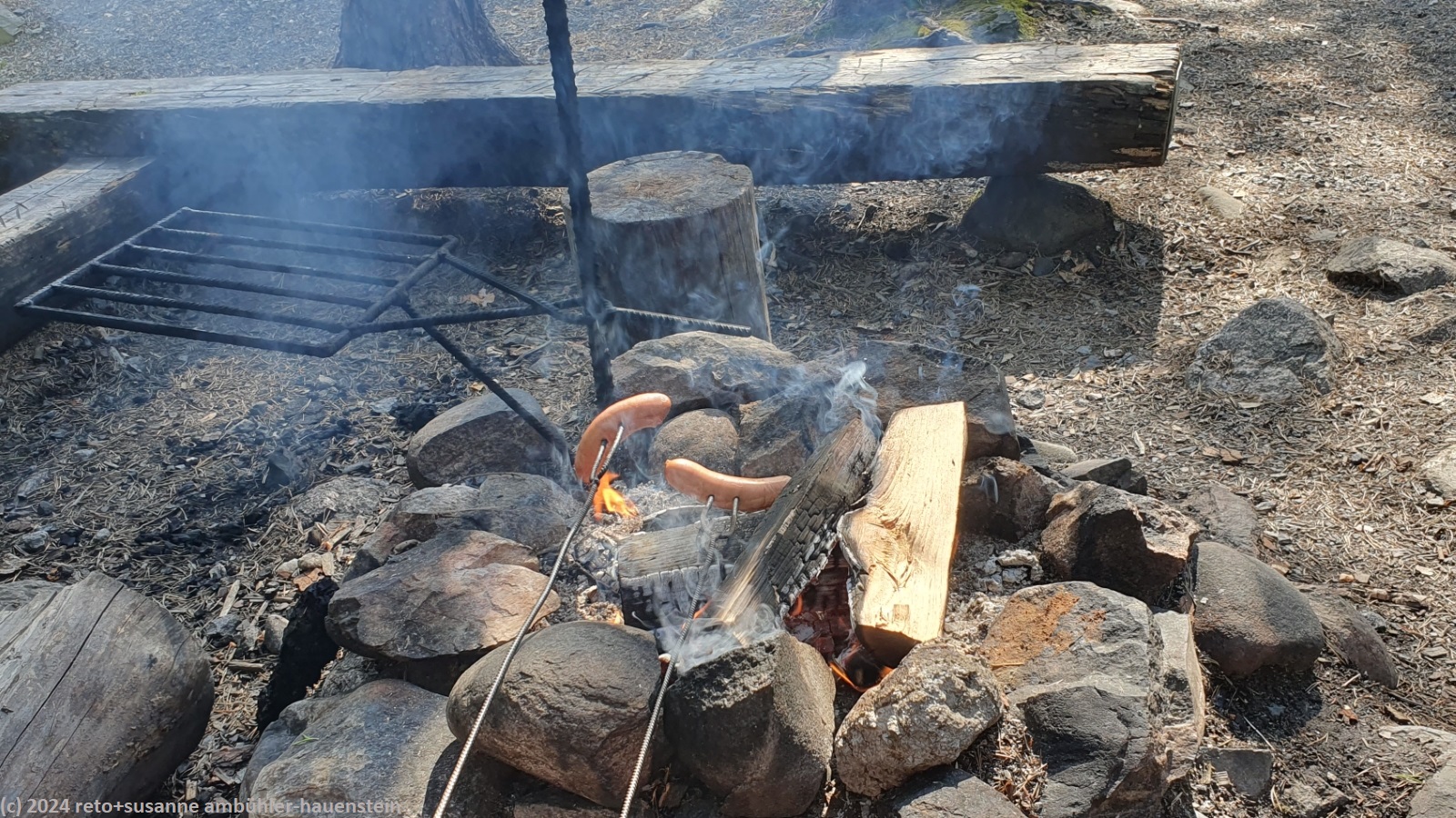 gegen 12:45 uhr sind wir wieder auf dem wasser. wir paddeln auf dem ala-ölkky südwärts. an dessen ende geht es über den gut 2 km langen, schmalen fluss somerjoki bis zur schutzhütte lihapyörre. hier essen wir zu mittag. susanne macht in der feuerstelle ein schönes feuer. wir essen erst unsere brote und braten anschliessend unsere finnischen cervelats über dem feuer. die würste sind sehr zart und schmecken erstaunlich gut. der rastplatz ist hübsch gelegen an einer biegung des flusses.