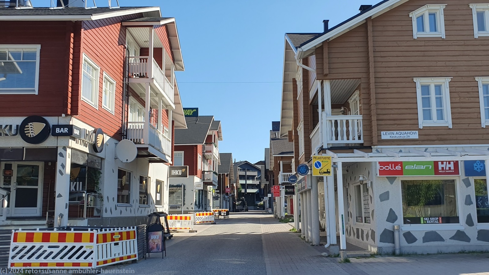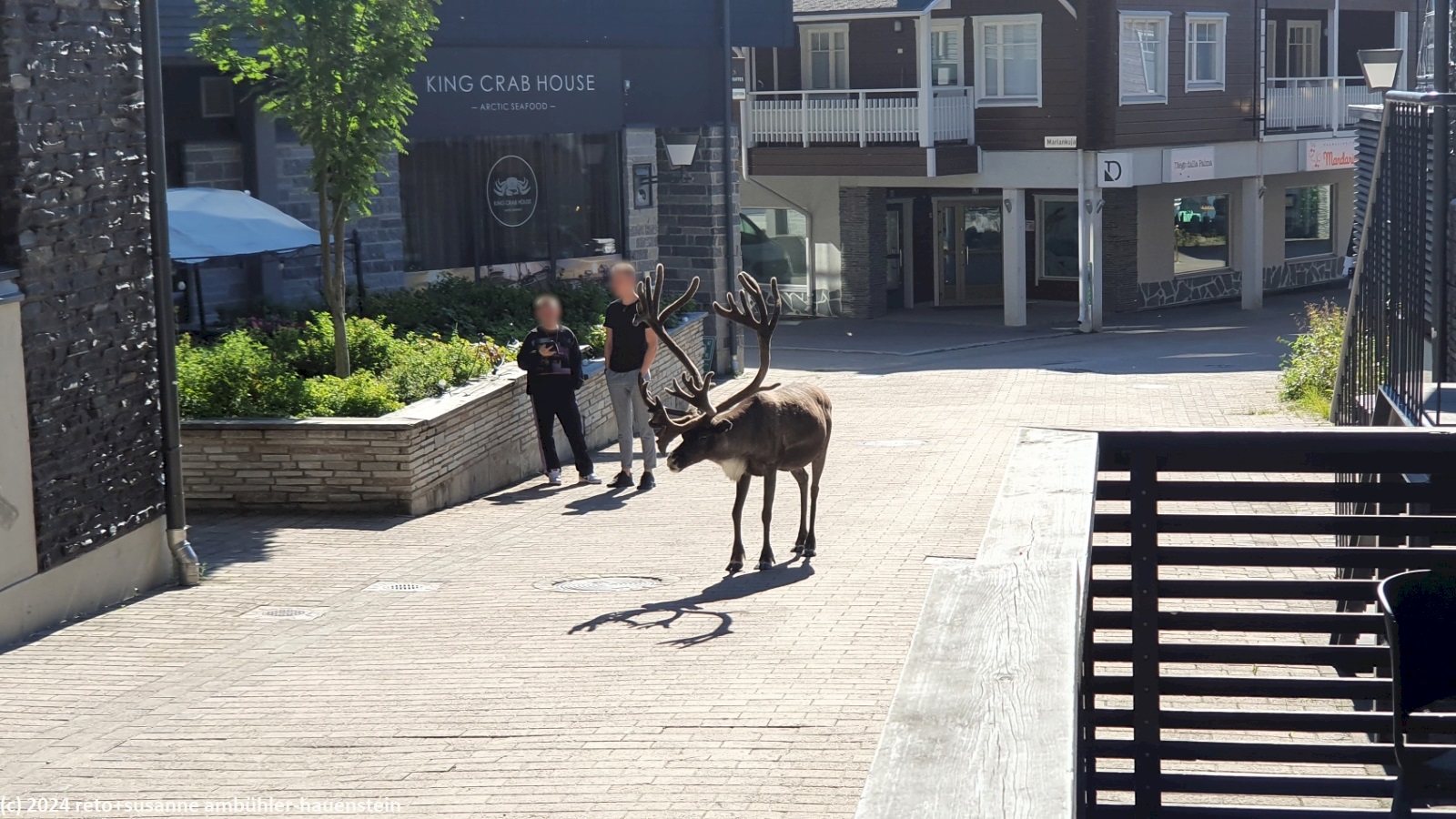wir stehen gegen 08:45 uhr auf. der himmel ist wolkenlos, es ist deutlich wärmer als in hossa. entsprechend frühstücken wir im t-shirt und kurzen hosen im freien. da wir noch nichts vom flughafen kittilä gehört haben, entschliessen wir uns, die schmutzige wäsche zu waschen. während die maschine wäscht, spazieren wir durch den ort und kaufen im supermarkt einige lebensmittel. zurück auf dem campingplatz kümmert sich susanne um unsere wäsche, ich arbeite am computer. gegen mittag unterhalte ich mich mit hermann via skype. danach essen wir eine kleinigkeit. während wir beim frühstücken noch versucht haben, ein bisschen morgensonne zu erwischen, suchen wir nun schatten. die temperatur steigt im laufe des nachmittages bis auf 25°C. wir machen einen etwas ausgedehnteren spaziergang als am morgen. zuerst setzen wir uns aber ins cafe an der hauptgasse und geniessen kaffee und kuchen. plötzlich taucht ein mächtiges rentier auf. es stolziert unbekümmert mitten durch den ort.