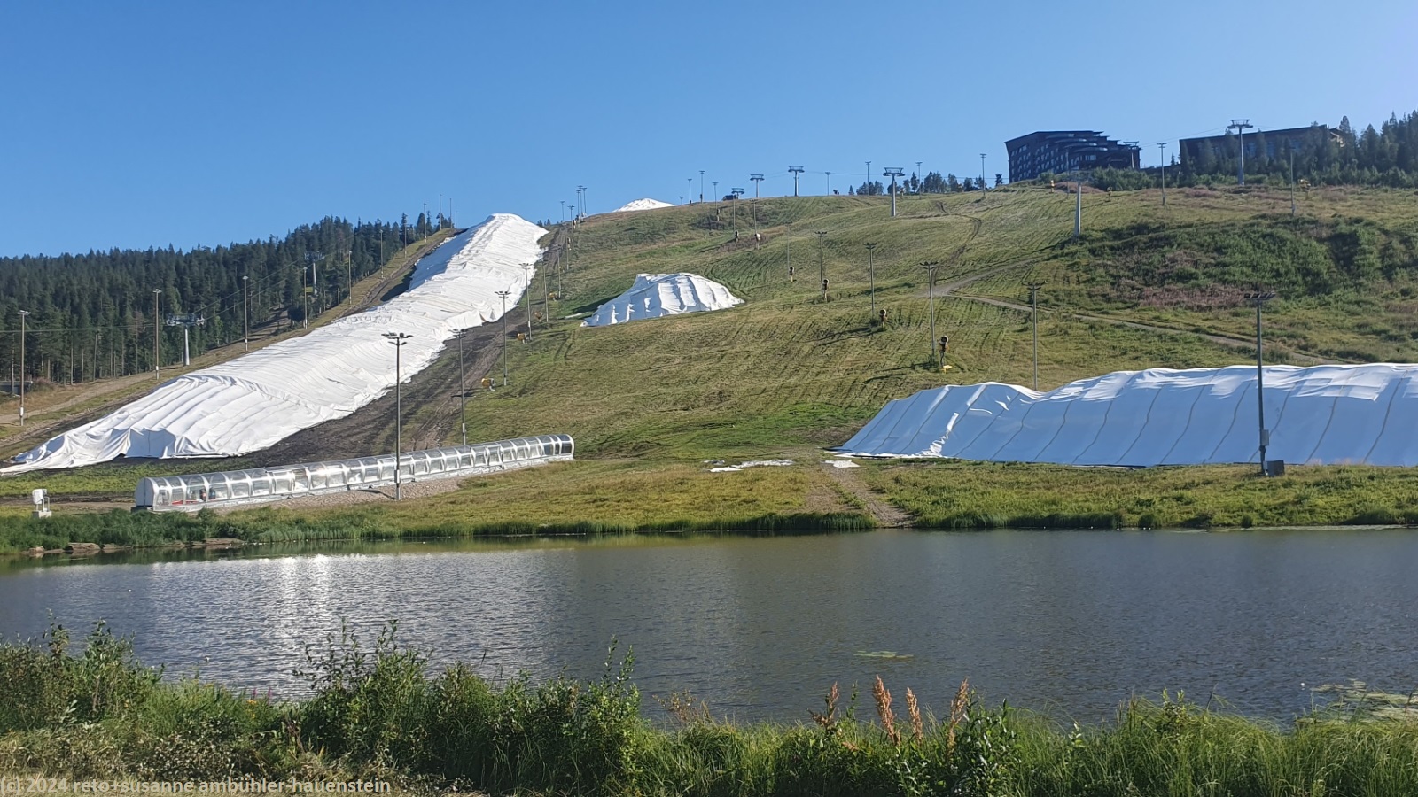 hier erreicht uns die nachricht, dass die akkus definitiv nicht mehr auffindbar seien. das ist sehr enttäuschend, hatte man uns doch versprochen, sie bis ende august aufzubewahren. (anmerkung: nach einigem hin und her vergütet die firma, welche für die gepäckabfertigung an den finnischen flughäfen zuständig ist, einen ordentlichen betrag an die unauffindbaren akkus, was wir als grosszügiges entgegenkommen betrachten.) schliesslichen nehmen wir den wanderweg richtung golfplatz unter die füsse. wir wandern auf einem angenehm weichen waldweg und geniessen den schatten. beim skilift draivi hat es eine überraschend grosse baustelle. hier entsteht ein sessellift. die talstation und die masten stehen bereits, die garage für die sessel ist noch im bau. wir setzen uns auf die terrasse des restaurants und trinken etwas. dabei haben wir einen tollen blick auf den hübsch angelegten golfplatz.