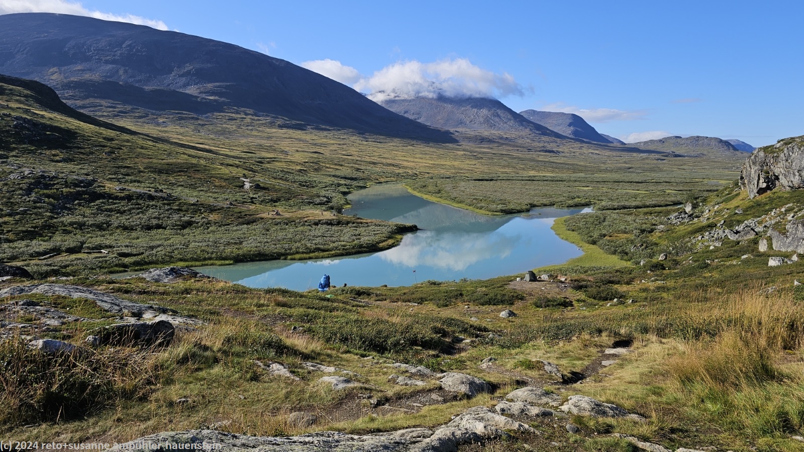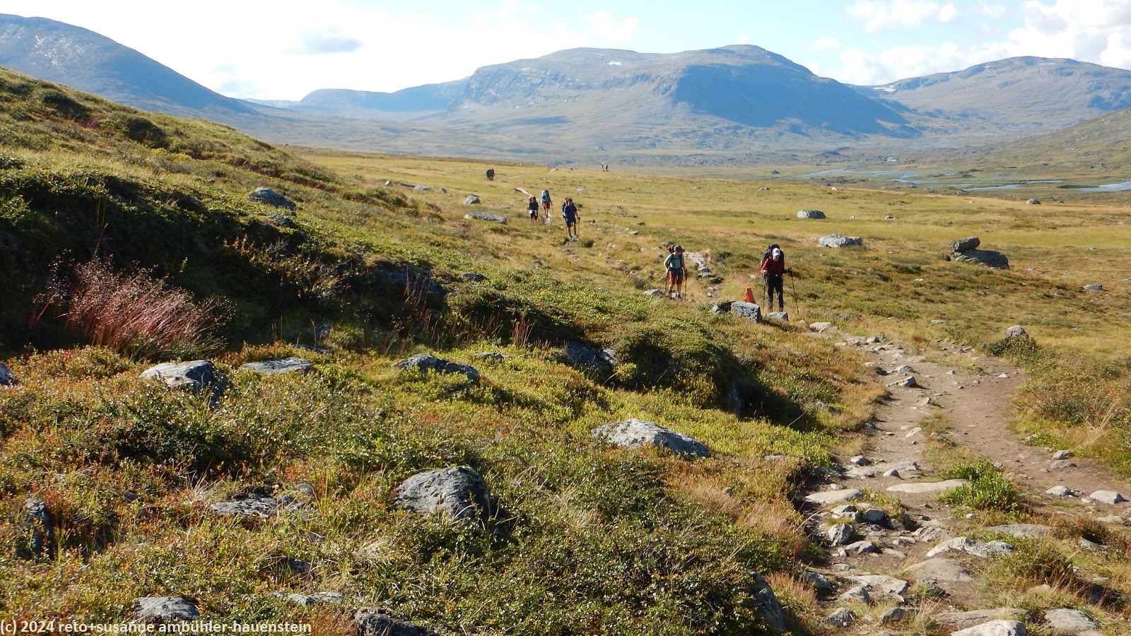 die nacht war sehr ruhig. ich habe bestens geschlafen, meine frau etwas weniger gut, da sie von kopfschmerzen geplagt wird. als wir um 07:30 uhr aufstehen, scheint die sonne, der himmel ist leicht bewölkt. allerdings bläst ein kräftiger südwind, dieser dürfte die ursache für die kopfschmerzen sein. wir frühstücken in der küche, danach wischen wir um unseren tisch. nachdem wir unsere rucksäcke gepackt haben, machen wir auch in unserem zimmer sauber. gegen 9 uhr brechen wir auf. um die fjällstube herrscht reger betrieb. heute begegnet uns wohl der grösste teil der fjällräven classic teilnehmenden. wir überqueren die hängebrücke südlich der stuga, danach wandern wir bei herrlichem wetter durch eine fantastisch schöne landschaft. auch die heutige strecke sind wir schon einmal gewandert, siehe tagebuch vom 07-aug-2017. damals haben wir allerdings unser heutiges tagesziel - die tjäktjastuga - ausgelassen und sind direkt zu den sälkastugorna durchgewandert. dieses jahr nehmen wir es gemütlicher und übernachten in jeder stuga entlang der route. der kungsleden folgt dem aliseatnu. dieser fliesst durch ein breites tal. im westen sehen wir zwischen den gipfel kleine eisfelder. im laufe des aufstieges richtung tjäktjapass müssen wir mehrmals kleinere flüsse durchqueren. die teilnehmenden des fjällräven classic kommen uns nun fast ununterbrochen entgegen. gemäss aussage des hütenwartes bei der alesjaure stuga sind es 1800 teilnehmende. meistens laufen sie in gruppen, manchmal kommt uns auch eine einzelne person entgegen. es hat auffallend viele asiaten, insgesamt sind es teilnehmende aus 24 verschiedenen ländern. auffallend ist aber auch, dass absolut kein abfall herum liegt. die disziplin der teilnehmenden ist diesbezüglich enorm. ebenso bezüglich des kreuzens auf den bohlen. fast alle warten oder weichen aus, wenn wir uns auf einem steg kreuzen. kurz nach 12:30 uhr sind wir kurz vor einem checkpoint des fjällräven classic. in einer kleinen mulde essen wir zu mittag. hier sind wir ein bisschen vor dem wind geschützt.