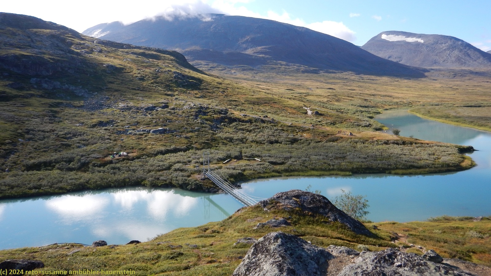 nach einer sehr ruhigen nacht stehen wir um 07:30 uhr auf. das wetter hat sich komplett geändert, der himmel ist leicht bewölkt, die sonne scheint, aber es bläst ein kräftiger südwind. letzterer bewirkt bei meiner frau unglücklicherweise kopfschmerzen. trotzdem brechen wir um 9 uhr auf. rund um die fjällstuga herrscht reger betrieb. heute begegnen wir dem grossteil der teilnehmenden der fjällräven classic. bei herrlichem wetter wandern wir durch das wunderschöne tal des aliseatnu. kurz vor dem sielmmánjira essen wir zu mittag. die anschliessende flussdurchquerung schaffen wir - nicht zuletzt dank einem tipp eines fjällräven mitarbeiters - trockenen fusses. wenig später sehen wir die tjäktjastuga auf der anderen talseite. die hängebrücke über die schlucht, welche der ceavccanjira ausgespült hat, befindet sich etwa 250 meter südlich der fjällstuga. das heisst, wir wandern an der hütte vorbei und wechseln dann auf die andere talseite. nachdem wir uns eingerichtet haben, verbringen wir einen gemütlichen nachmittag im aufenthaltsraum. das 6-bett-zimmer teilen wir mit einem jungen mann, den wir aber kaum je sehen.